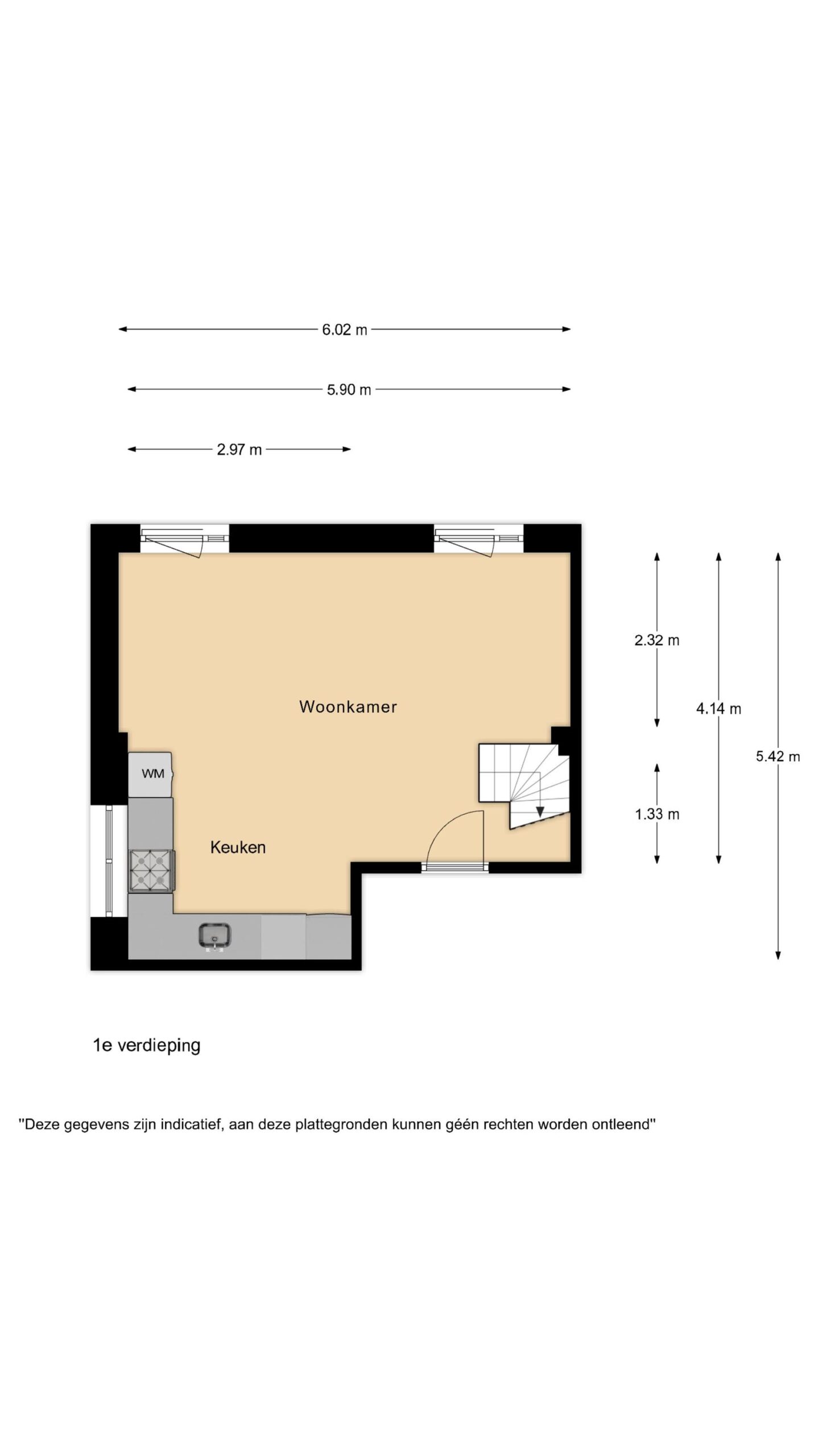 Via de eigen entree bereik je de eerste verdieping van deze bovenwoning. De woonkamer is een fijne, lichte leefruimte waar je met gemak een comfortabele zithoek en eethoek creëert. Dankzij de ramen aan de achterzijde valt er prettig daglicht binnen, wat de ruimte een open en aangename uitstraling geeft.