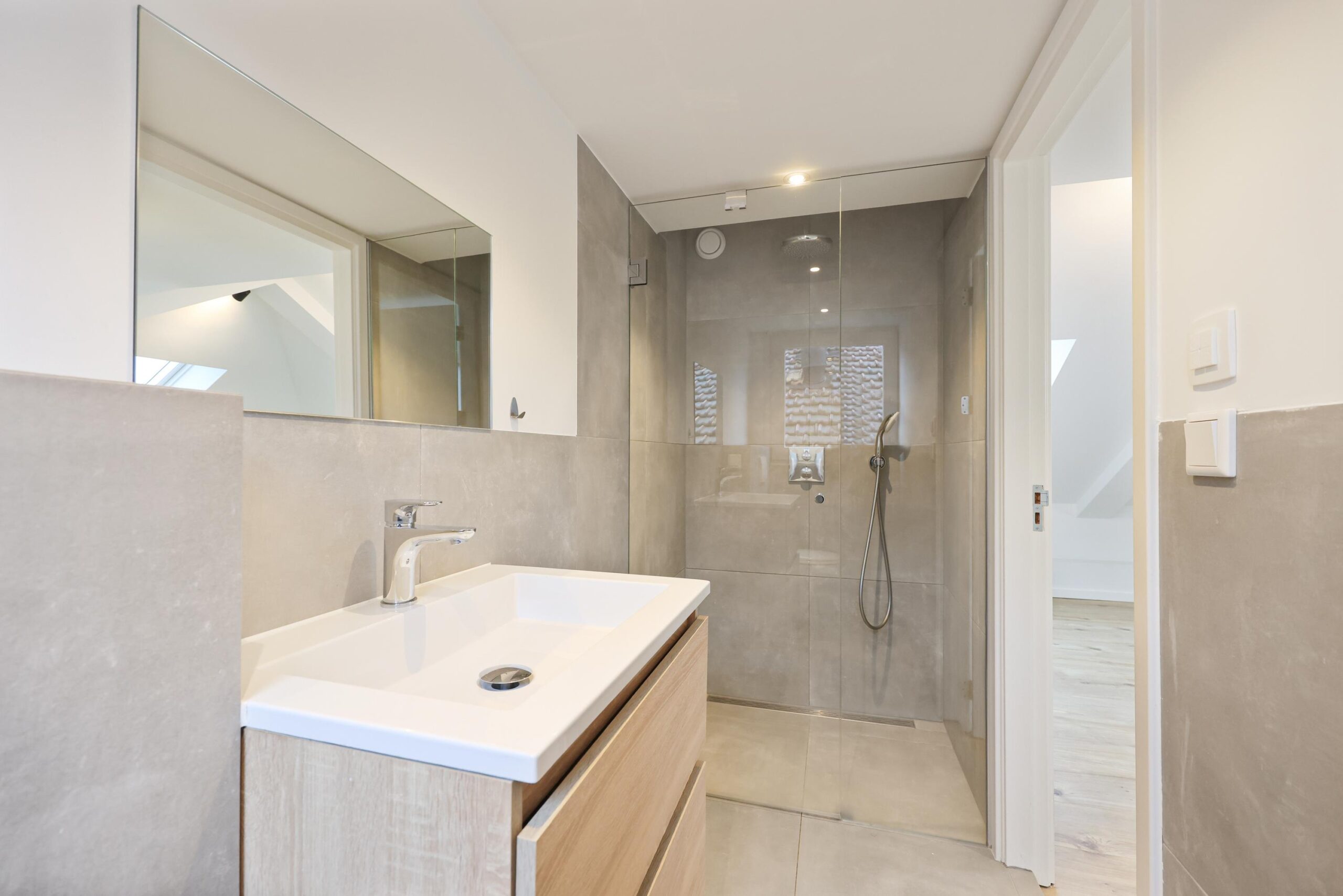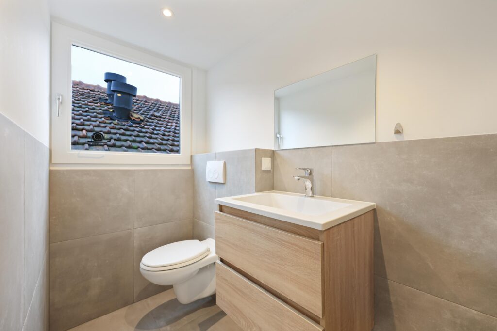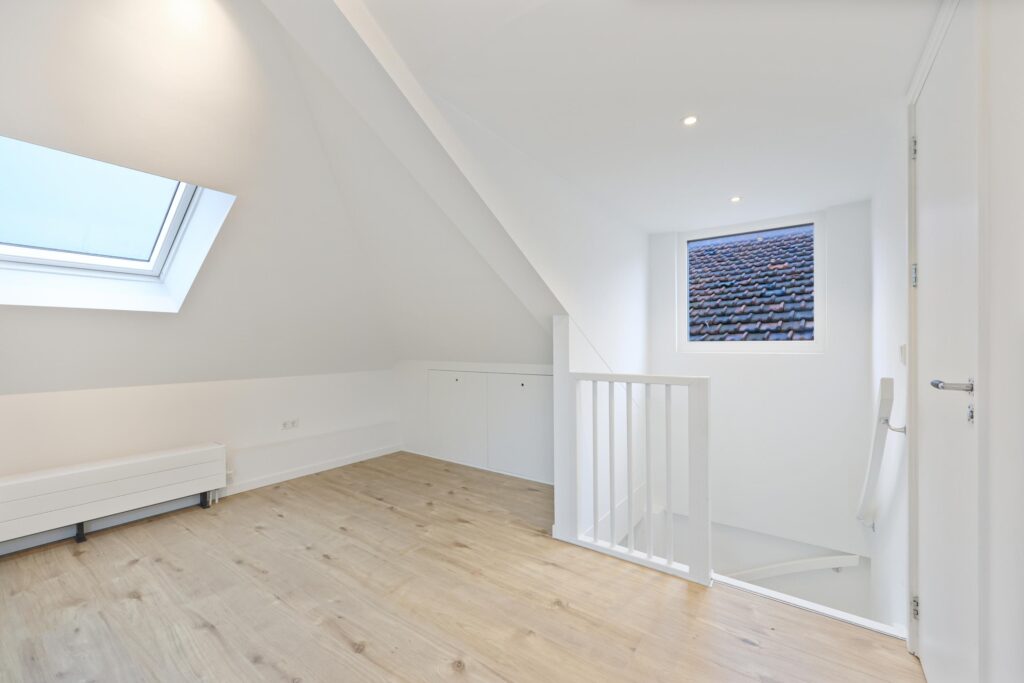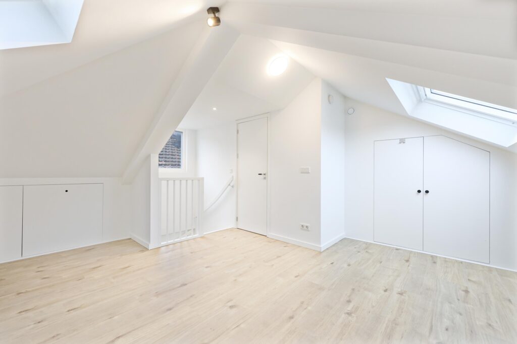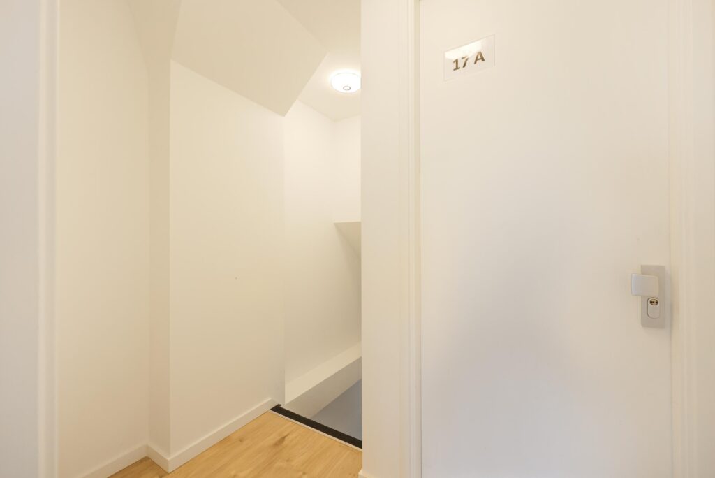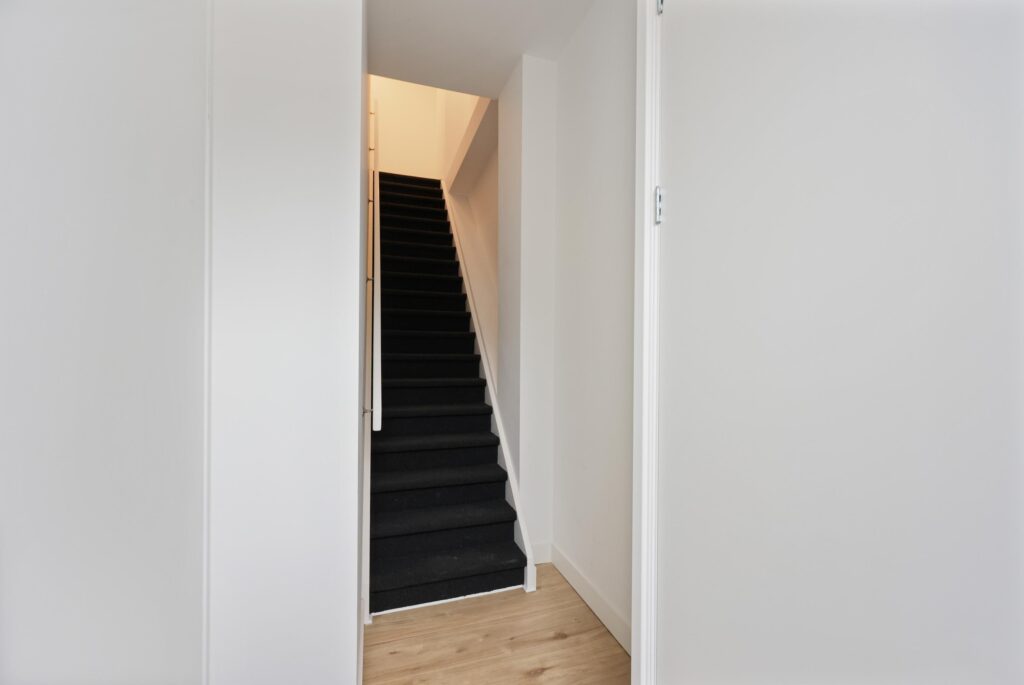 Op de bovenste verdieping bevindt zich de slaapkamer. Een knusse en rustige ruimte die zich uitstekend leent als hoofdslaapkamer. Door de slimme indeling is er voldoende plek voor een bed en kastruimte. De badkamer is verzorgd en voorzien van douche, wastafelmeubel en toilet – een complete en functionele ruimte waar comfort centraal staat.