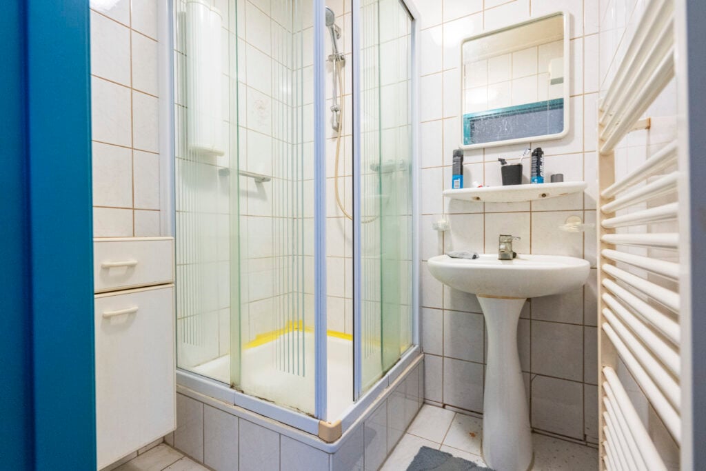 Via de hal bereiken we de woonkamer met open keuken. Samen vormen deze ruimtes een groot, licht geheel met toegang tot de patio in het hart van de woning. Hier kun je een sfeervolle buitenplek creëren waar binnen en buiten naadloos in elkaar overlopen. Aan de achterzijde bevindt zich de badkamer, uitgerust met een douche en wastafel.