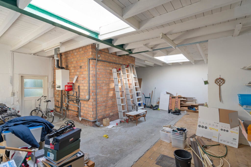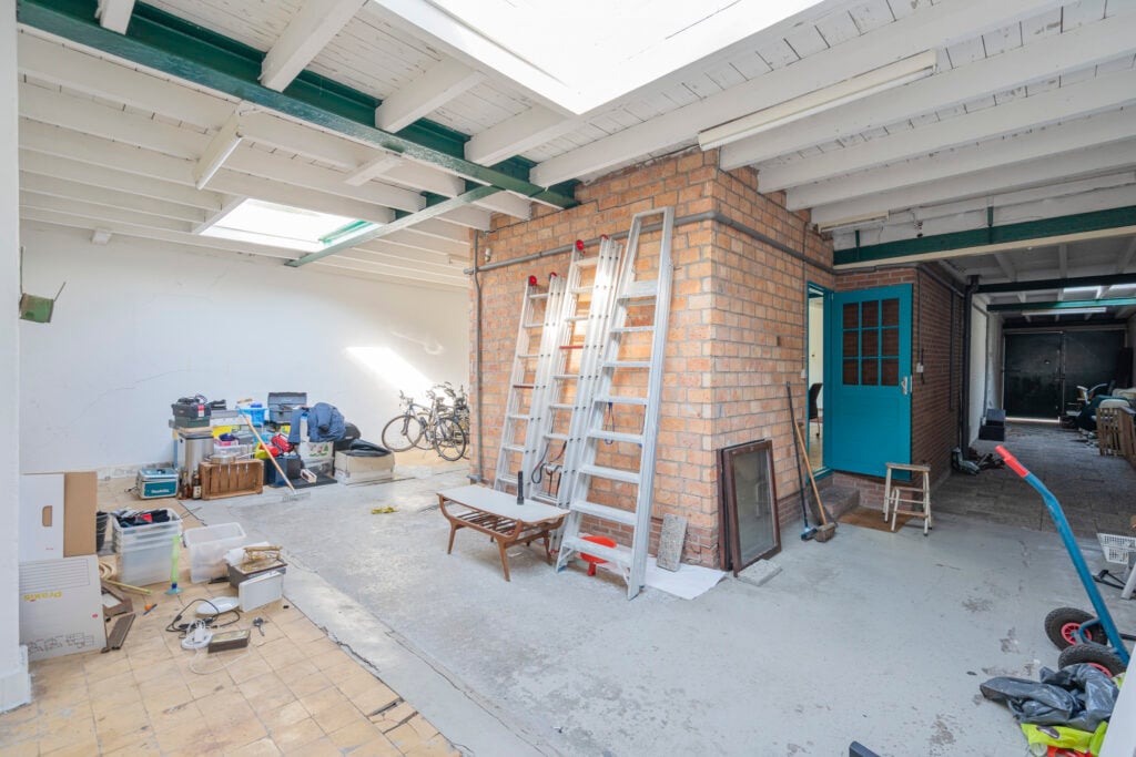 Achter de woning ligt de enorme garage van maar liefst 96 m², die ook vanaf de zijkant bereikbaar is. Deze multifunctionele ruimte is ideaal voor wie extra bergruimte, een werkplaats of atelier zoekt. Of natuurlijk gewoon een grote tuin? Het kan allemaal.