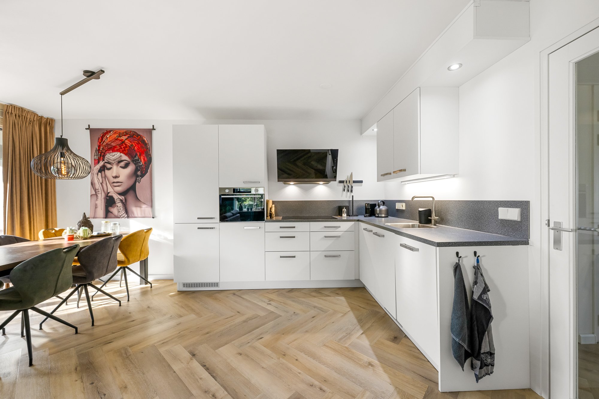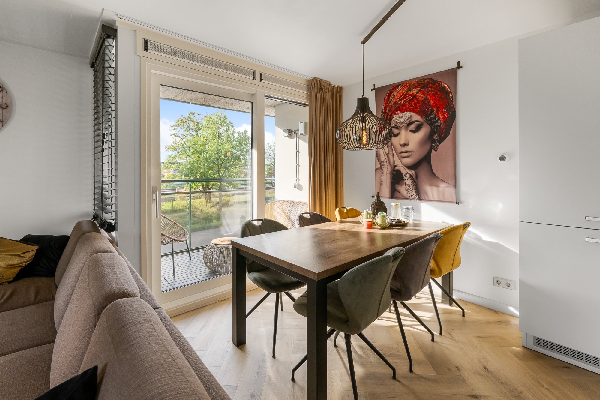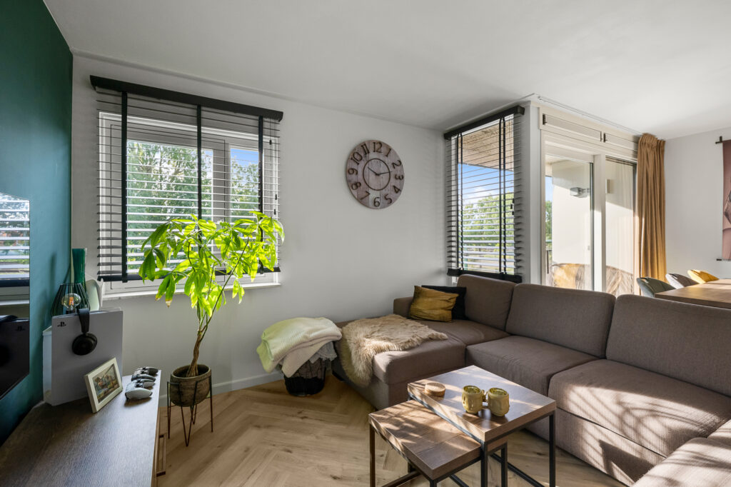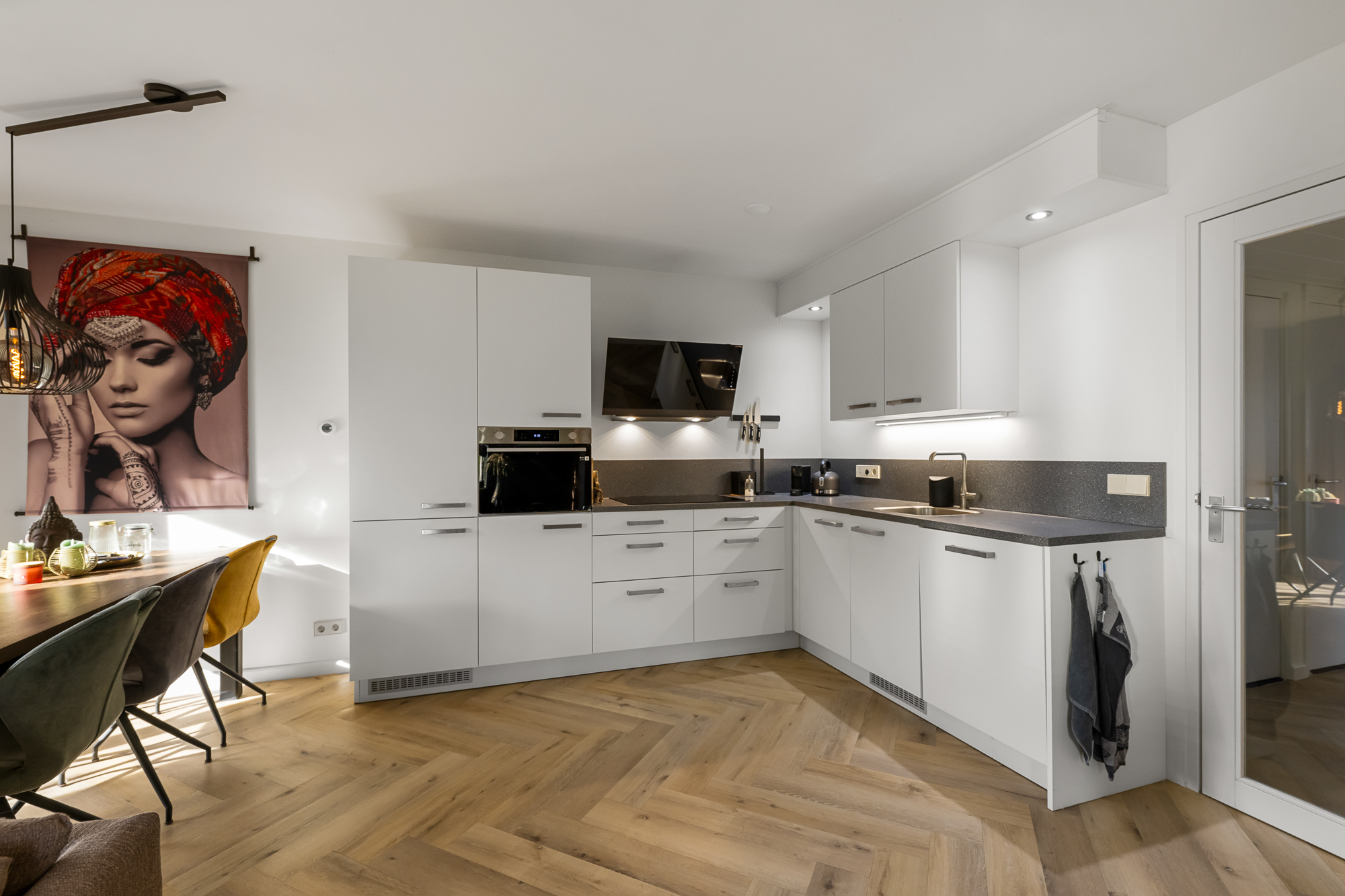 Met de lift bereik je de eerste verdieping, waar de entree van het appartement uitkomt op een hal met videofoon en een vernieuwde meterkast. Vanuit de hal zijn de separate toiletruimte, een praktische bergruimte met de opstelling van de cv-ketel (2020) en een betegelde wasruimte met aansluitingen voor wasmachine en droger bereikbaar. De ruime en sfeervolle woonkamer, voorzien van vloerverwarming, biedt een fijne lichtinval en geeft toegang tot het balkon op het zuidoosten. Aansluitend vind je de moderne keuken (2021), die is uitgerust met diverse inbouwapparatuur zoals een combimagnetron, koel-/vriescombinatie, vaatwasser, 4-pits inductiekookplaat met flexibele kookzones en een afzuigkap. Het appartement beschikt daarnaast over twee slaapkamers en een moderne badkamer met inloopdouche en dubbele wastafel.