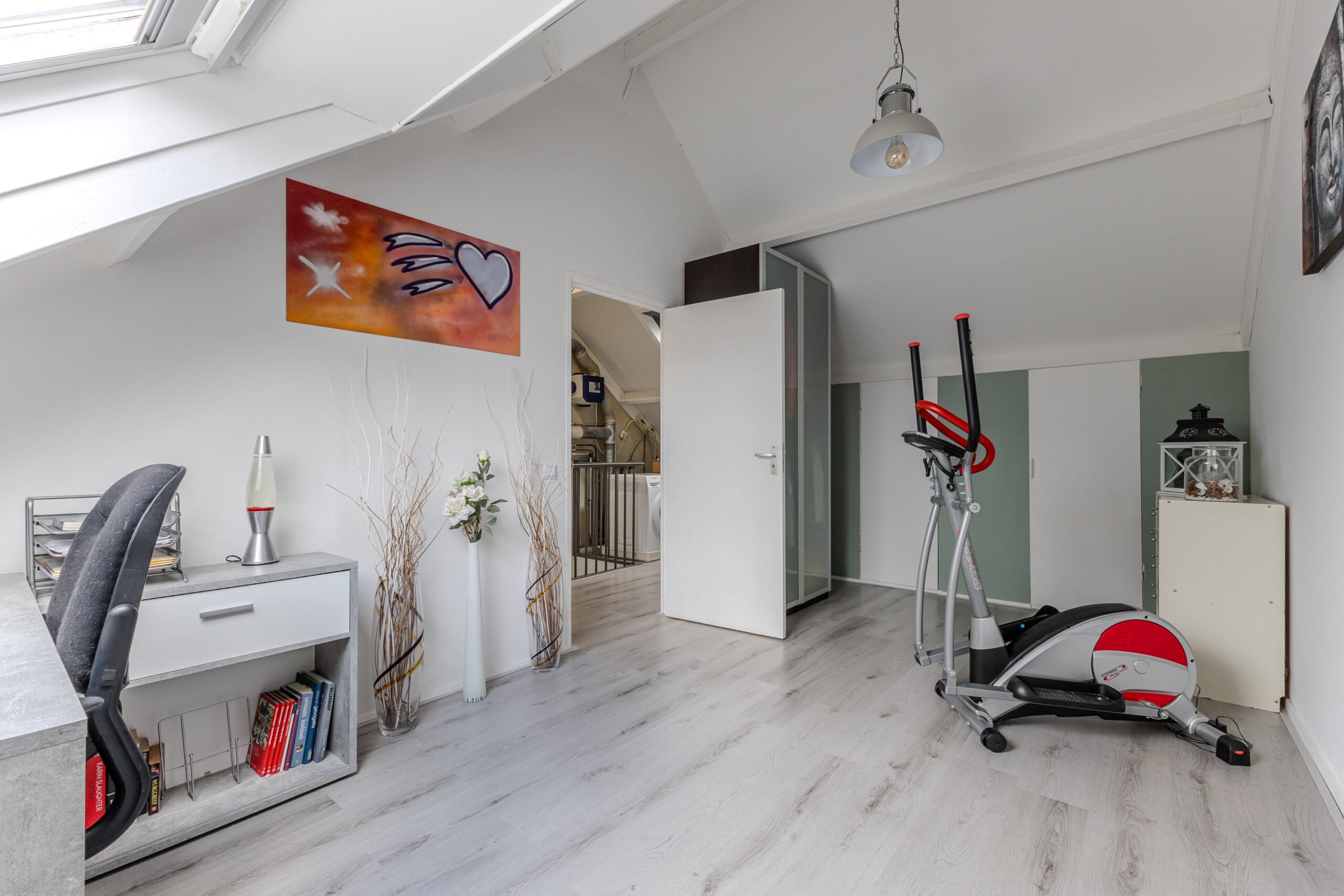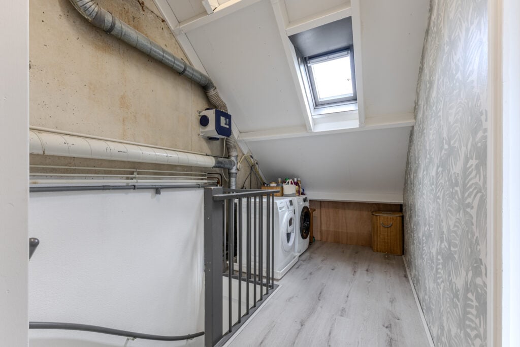 De tweede verdieping beschikt over een ruime slaapkamer met een dakraam, ingebouwde kasten. Ideaal als hoofdslaapkamer, tienerkamer of eventueel thuiskantoor. Ook dient de overloop als wasruimte waar tevens ook genoeg berging ruimte zit achter de schotten.