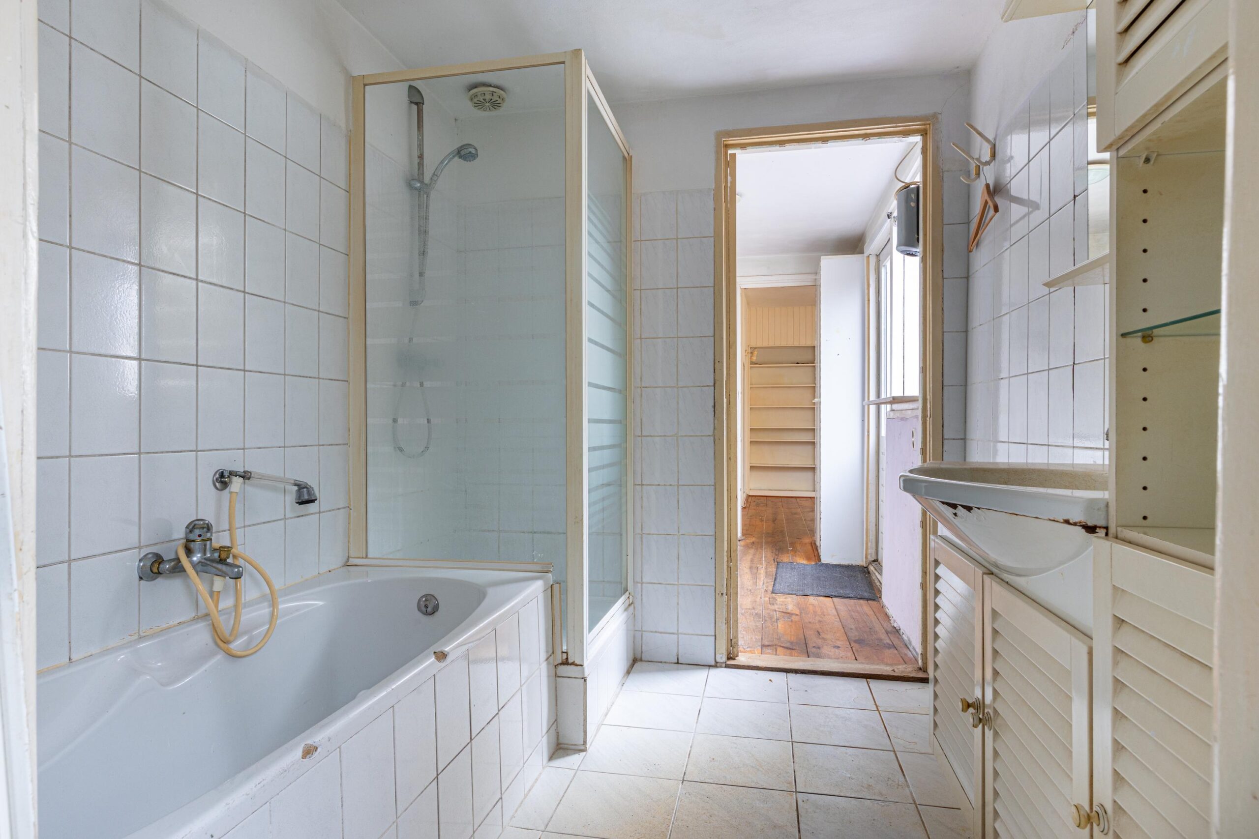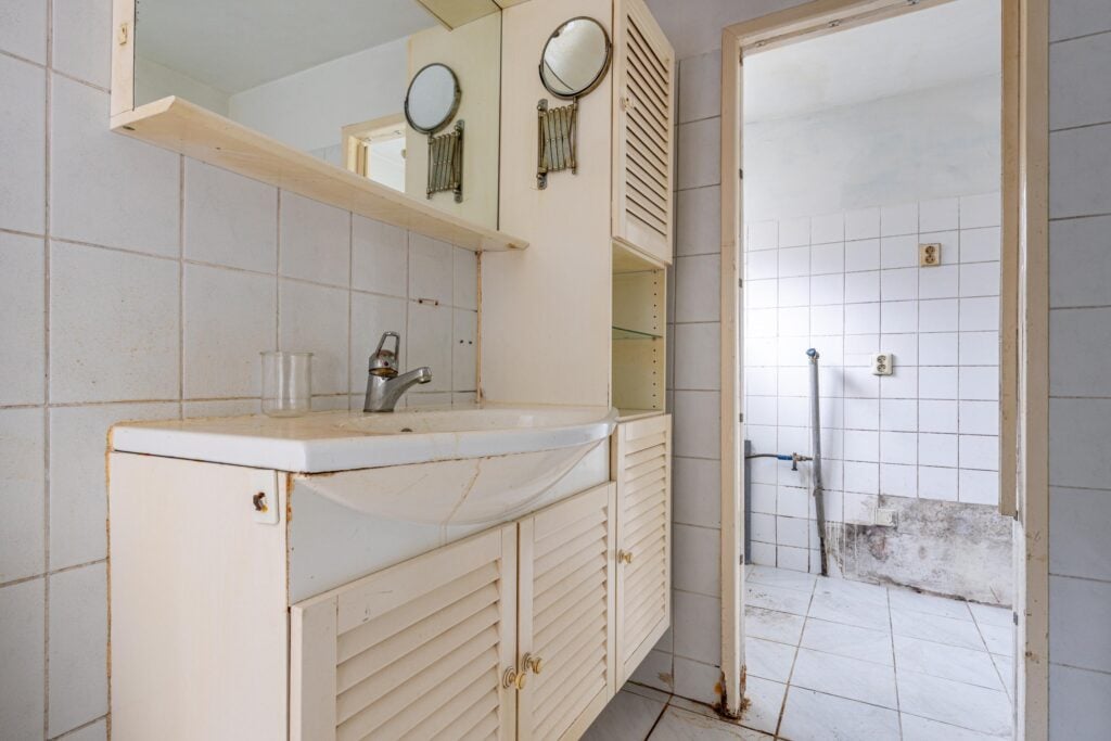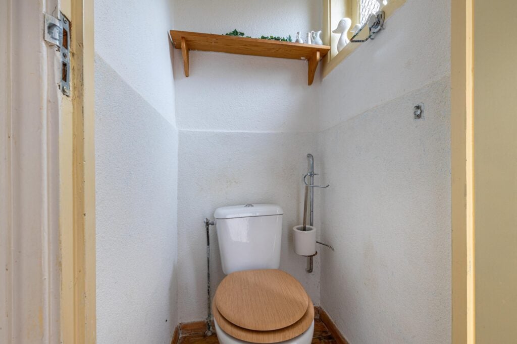 De badkamer en het toilet bevinden zich ook op de begane grond. Deze ruimtes zijn toe aan vernieuwing, maar bieden een prima basis om ze naar eigen smaak te moderniseren.