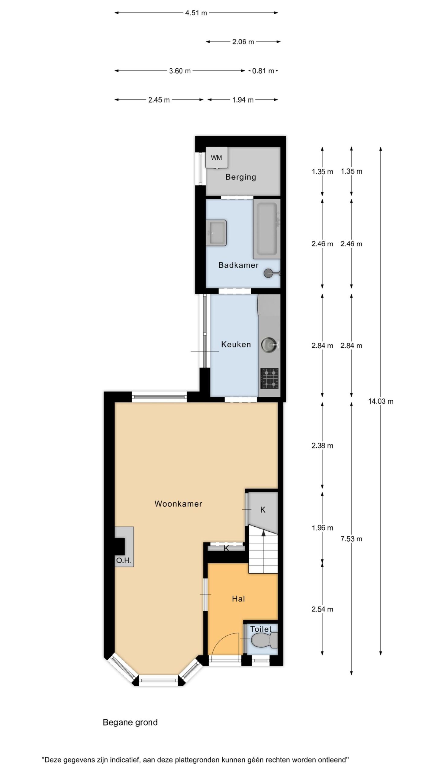 Via de voortuin kom je binnen in de hal met de trap naar de eerste verdieping. Vanuit hier loop je door naar de woonkamer. Deze loopt over de hele lengte van de woning en krijgt door de hoekligging extra licht via de zijramen. Het is een fijne ruimte met genoeg plek voor een zithoek aan de voorkant en een eettafel aan de achterkant.