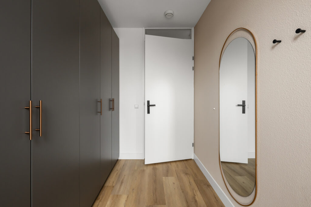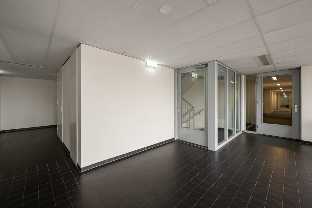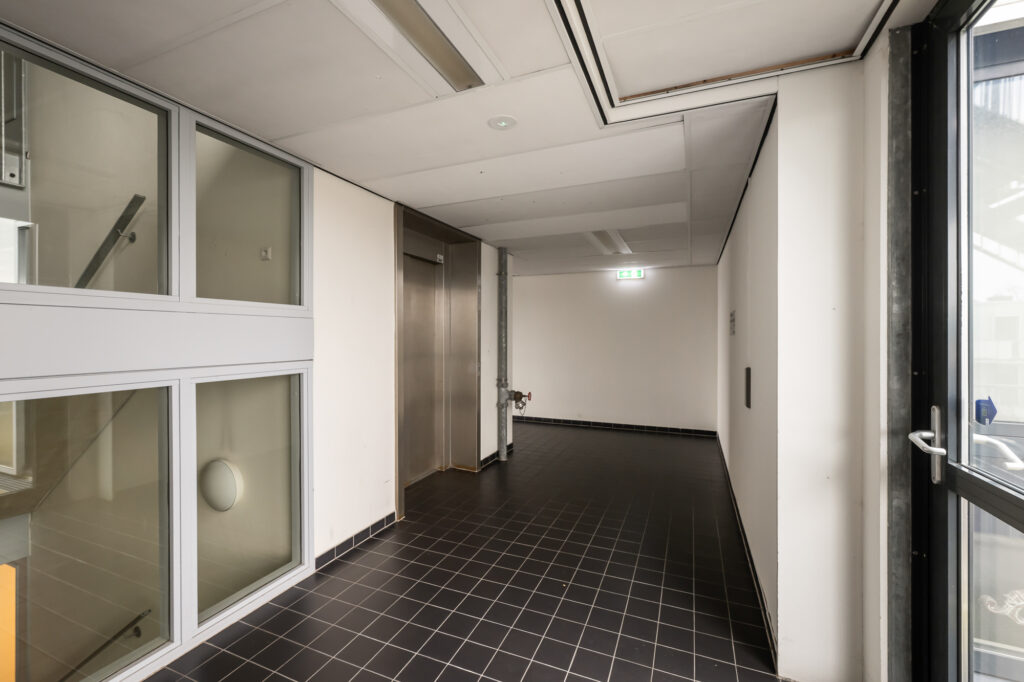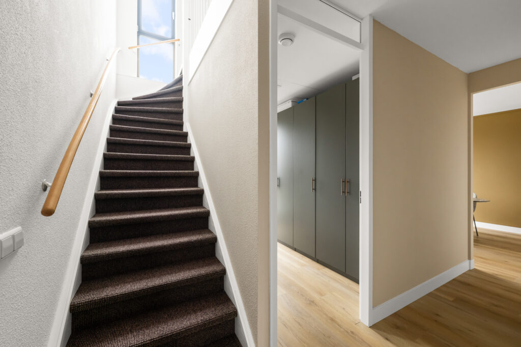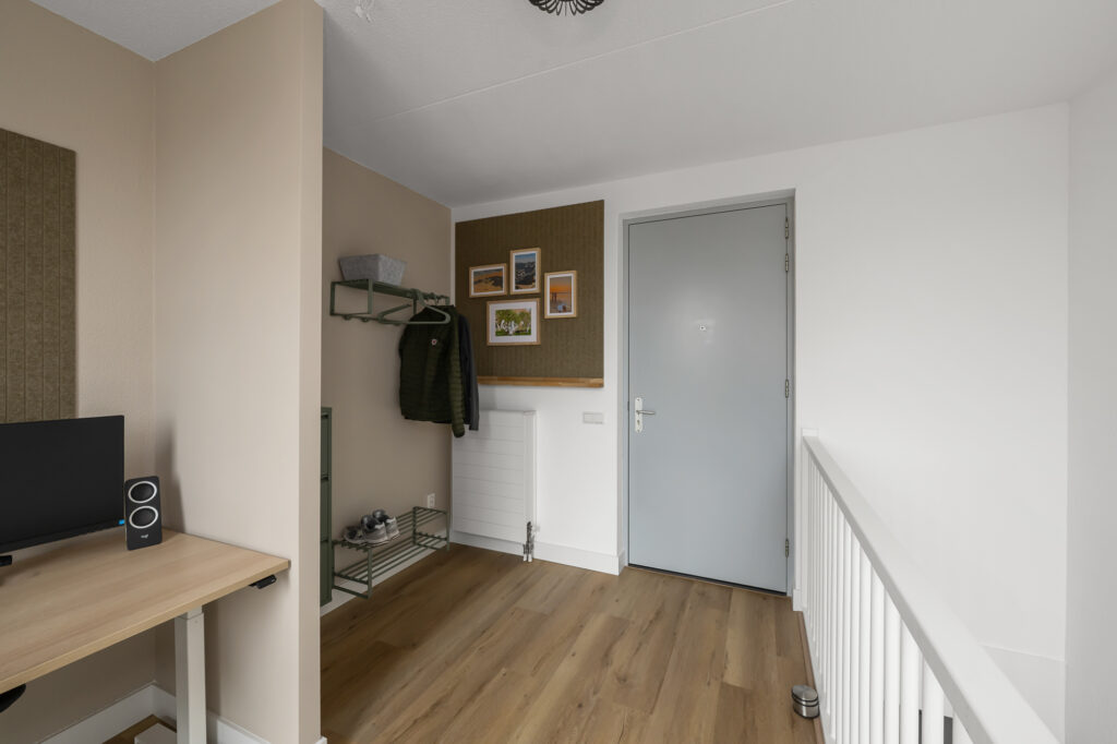 Bij binnenkomst in het appartement op de bovenste woonlaag bevindt zich de entree, die momenteel is ingericht als praktische werkruimte. Vanuit hier leidt de trap naar de woonverdieping.
