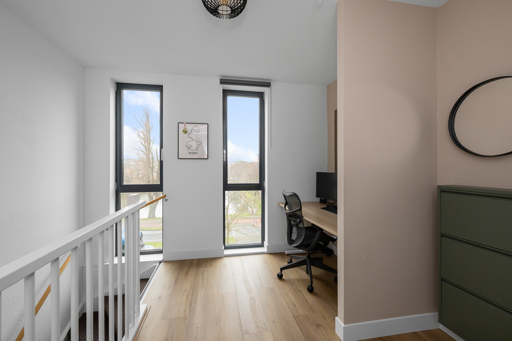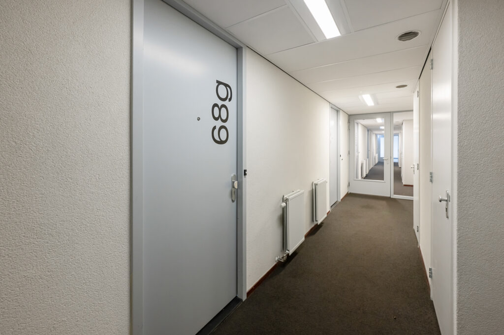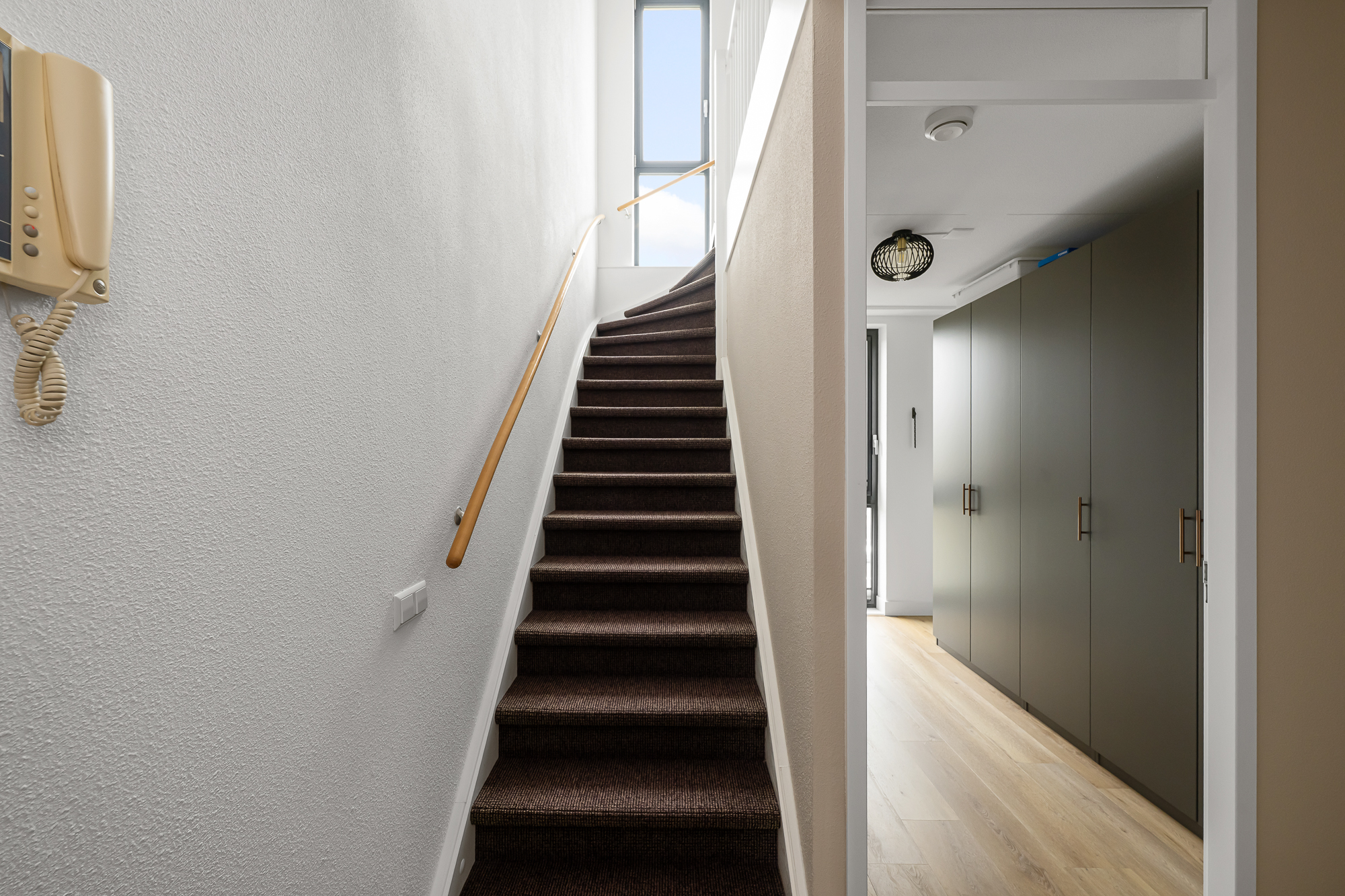 Bij binnenkomst in het appartement op de bovenste woonlaag bevindt zich de entree, die momenteel is ingericht als praktische werkruimte. Vanuit hier leidt de trap naar de woonverdieping.