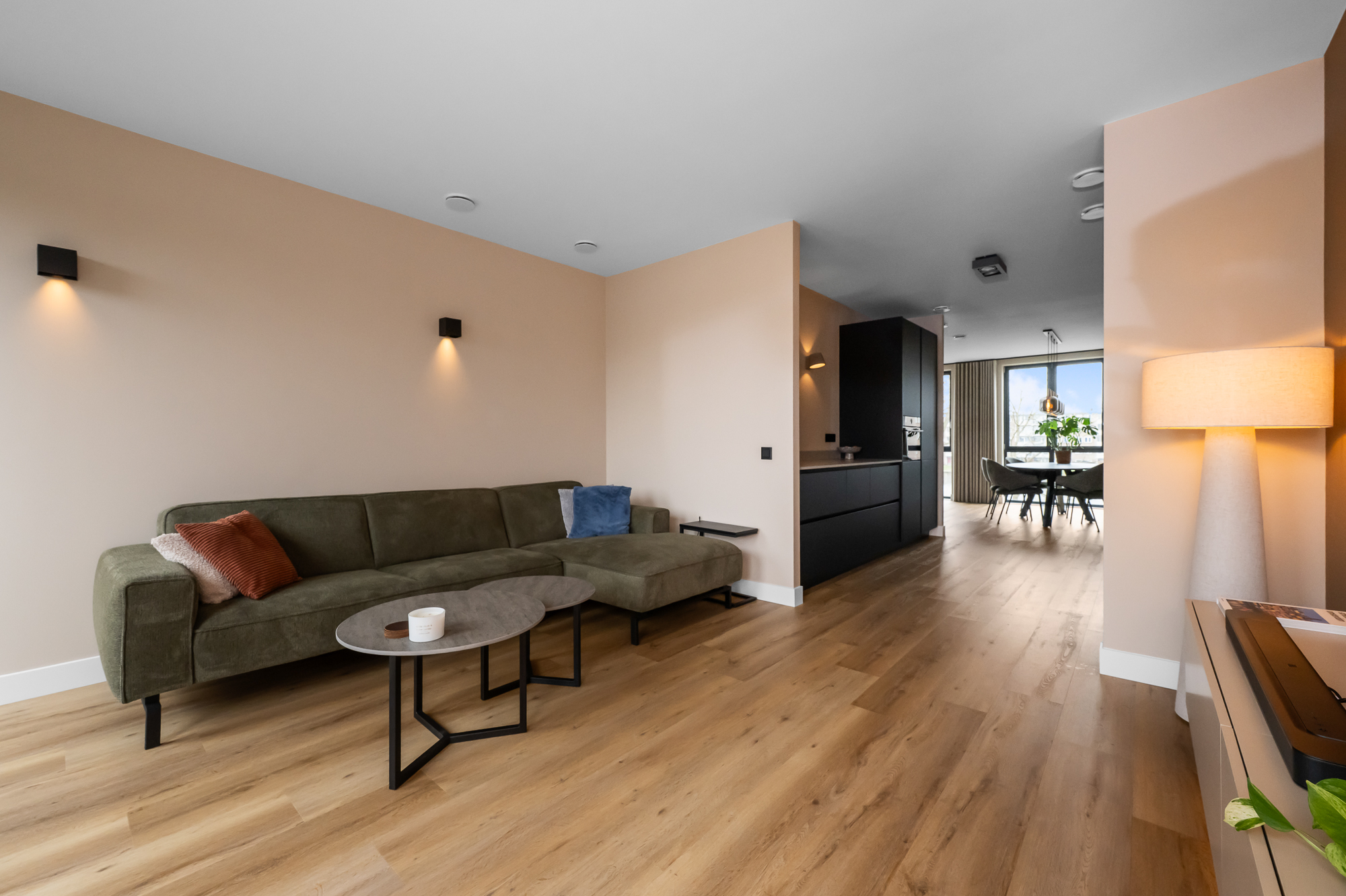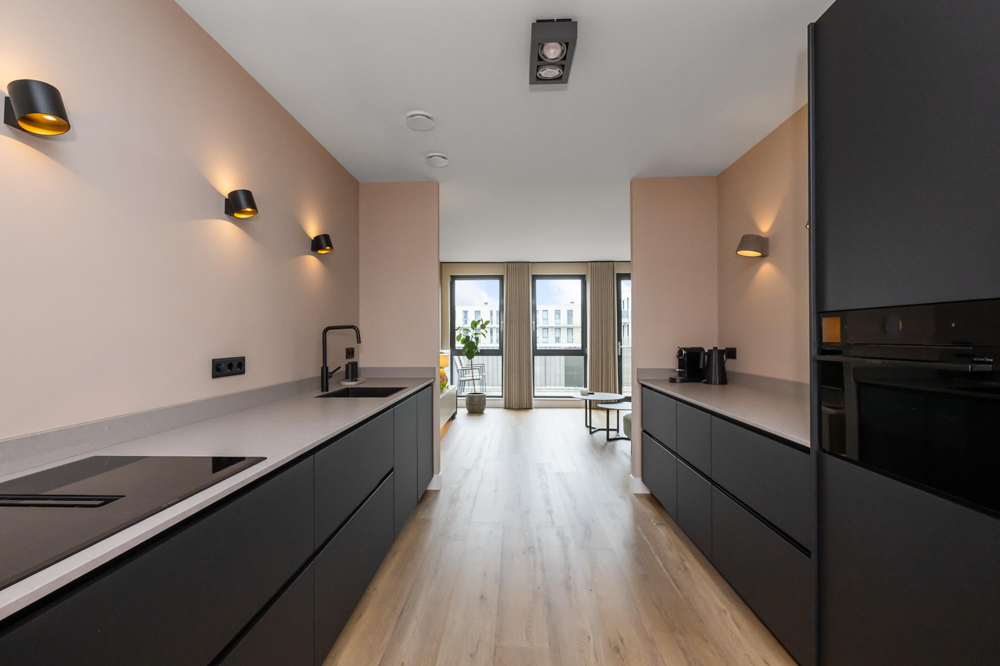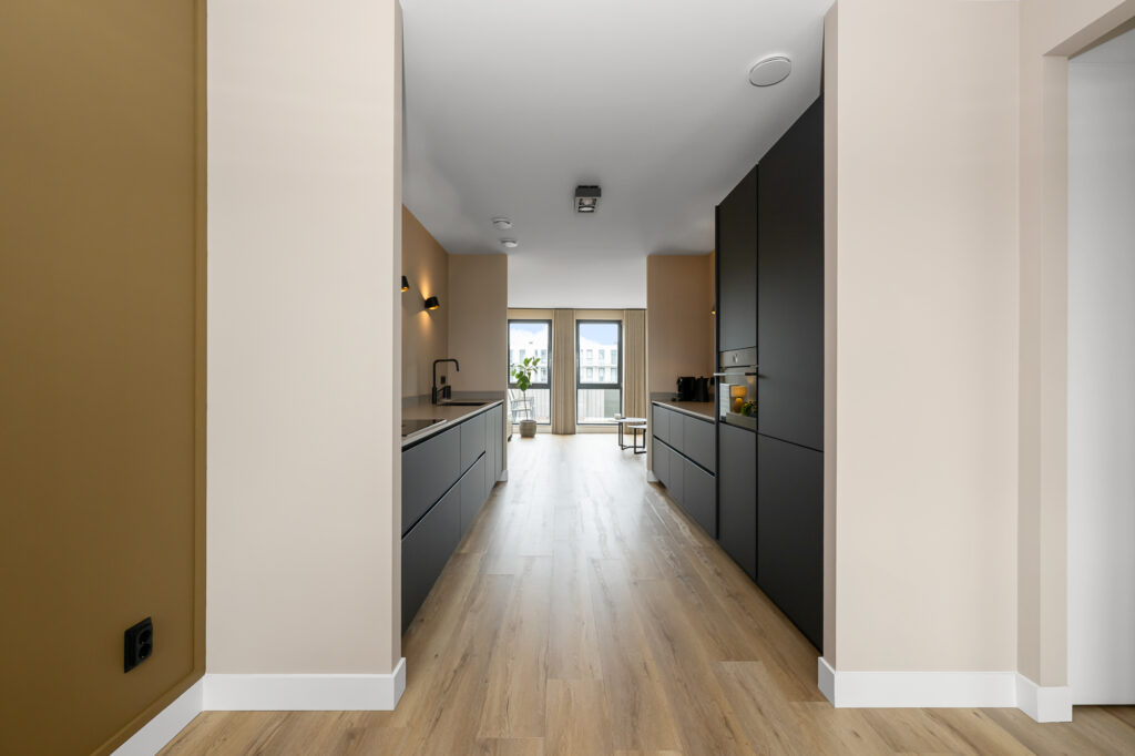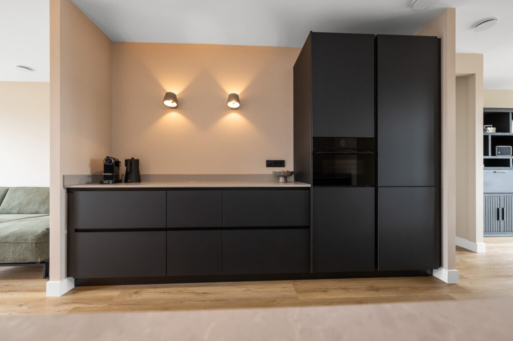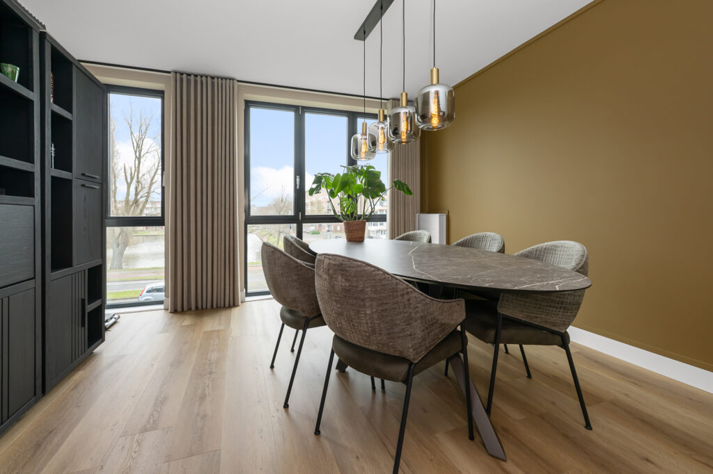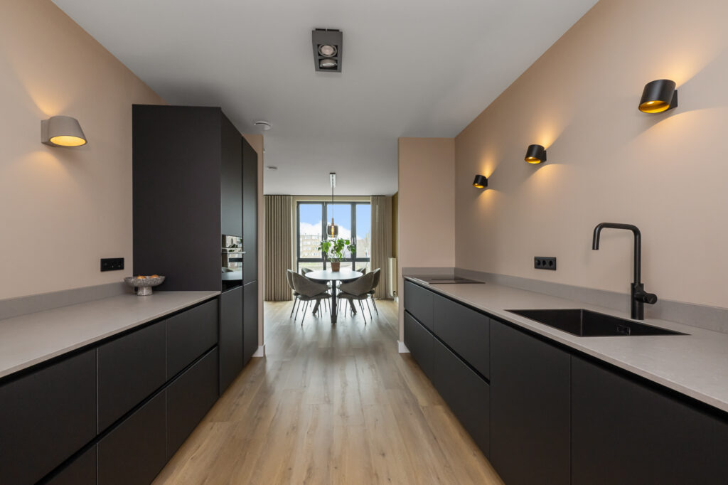 In het midden van de woning bevindt zich de luxe keuken die een centrale plek inneemt in de leefruimte. De keuken is modern uitgevoerd en voorzien van diverse inbouwapparatuur, waaronder een inductiekookplaat met geïntegreerde afzuiging, een stoomoven, koel-vriescombinatie en een vaatwasser. Aansluitend is er een ruime eethoek waar met gemak een grote eettafel geplaatst kan worden.