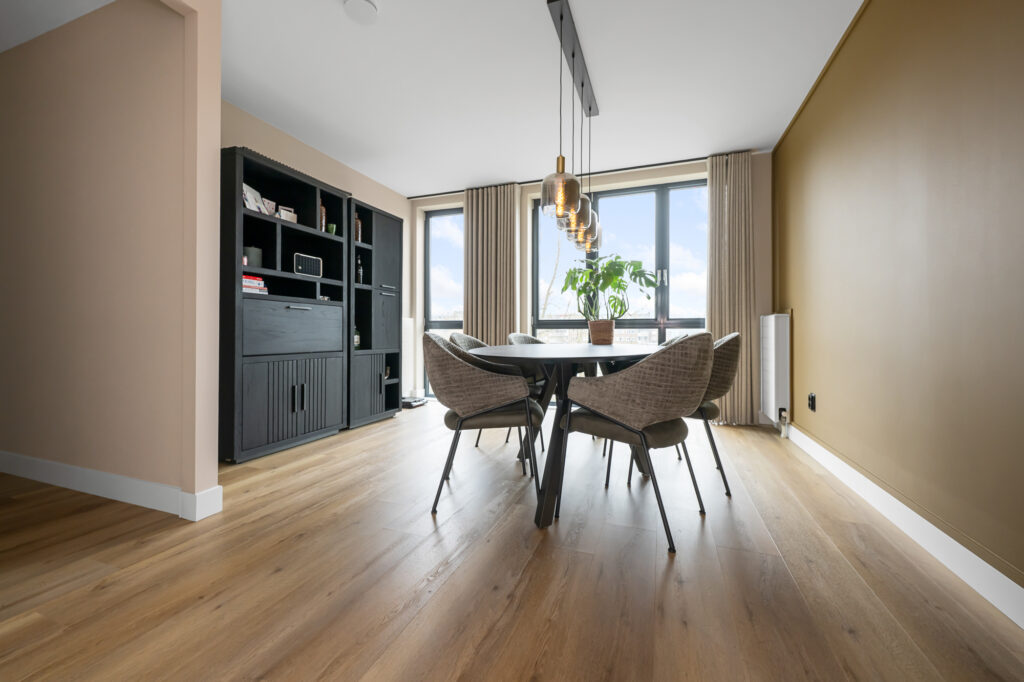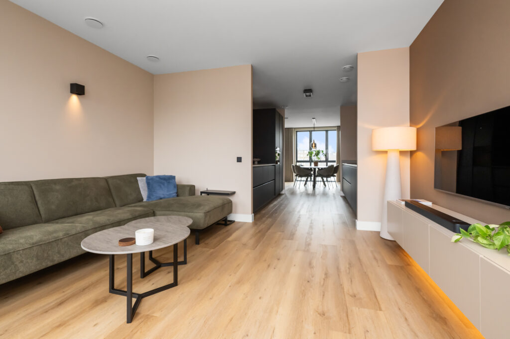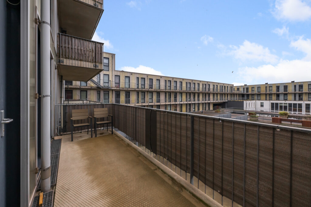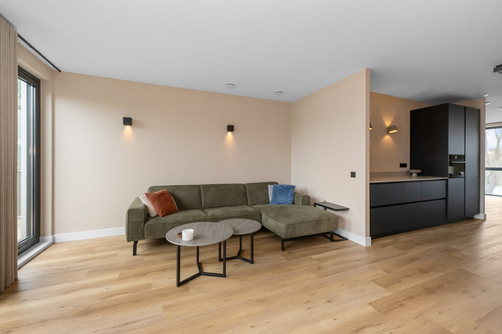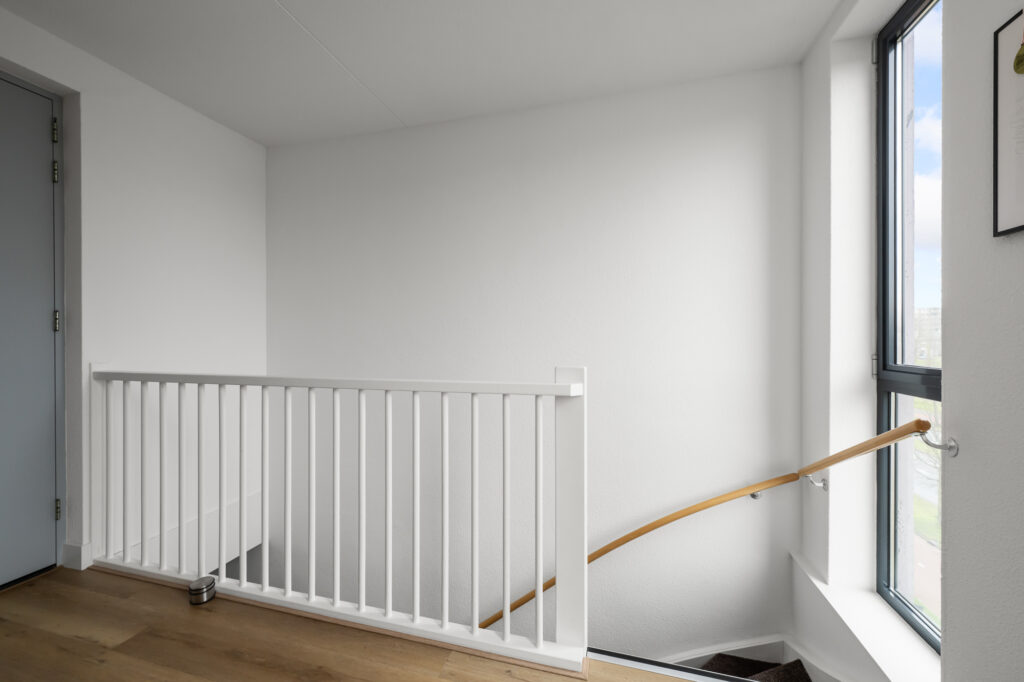 De woonverdieping is ruim en licht opgezet. De woonkamer bevindt zich aan de achterzijde en beschikt over grote raampartijen die zorgen voor veel natuurlijk licht. Vanuit de woonkamer is het ruime balkon bereikbaar, gelegen op het zuidwesten, waar je heerlijk kunt genieten van de middag- en avondzon.
