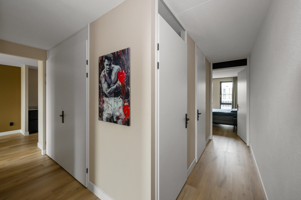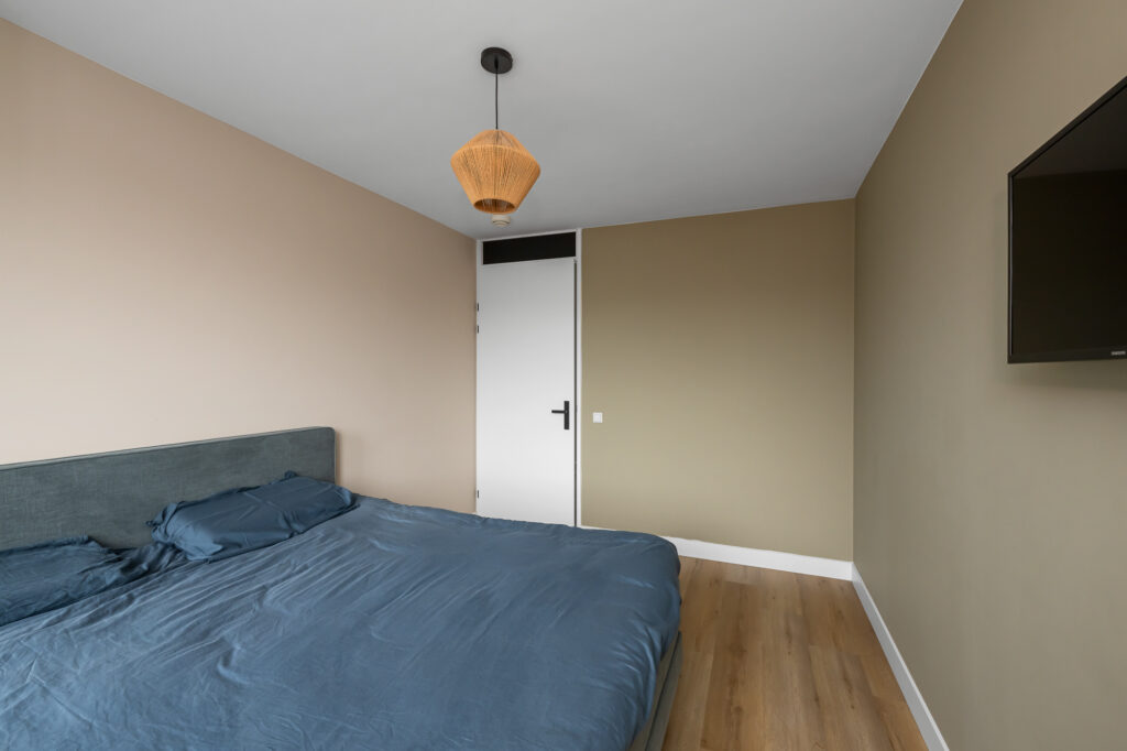 Op deze verdieping bevinden zich daarnaast twee slaapkamers. De grootste slaapkamer biedt voldoende ruimte voor een tweepersoonsbed en kastruimte. De tweede kamer is ideaal als werk-, slaap- of hobbykamer en beschikt bovendien over een praktische trapkast.