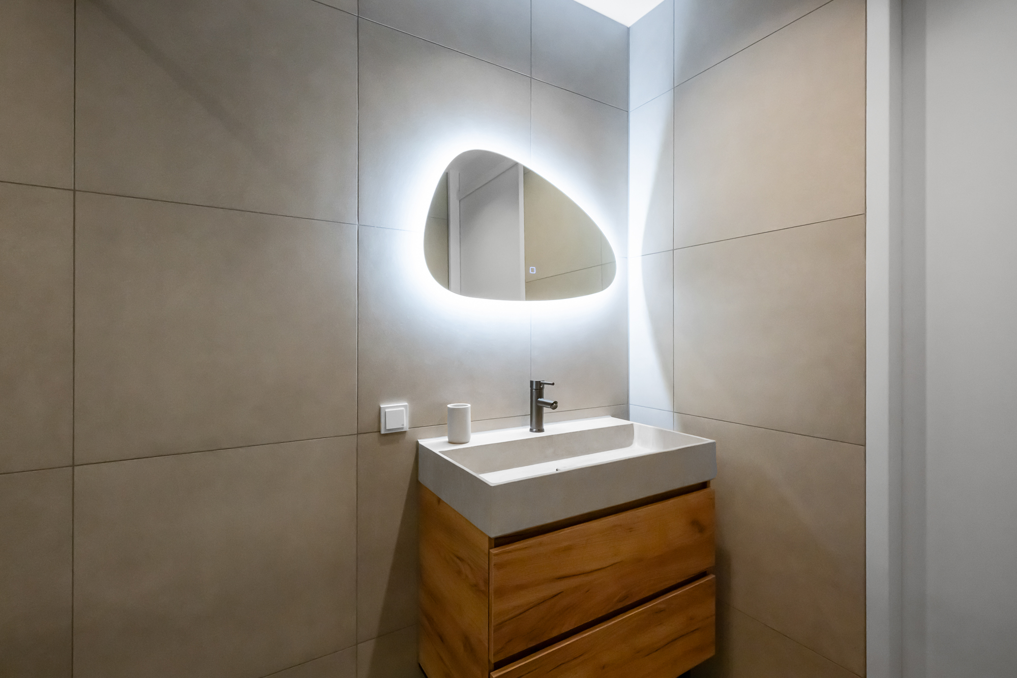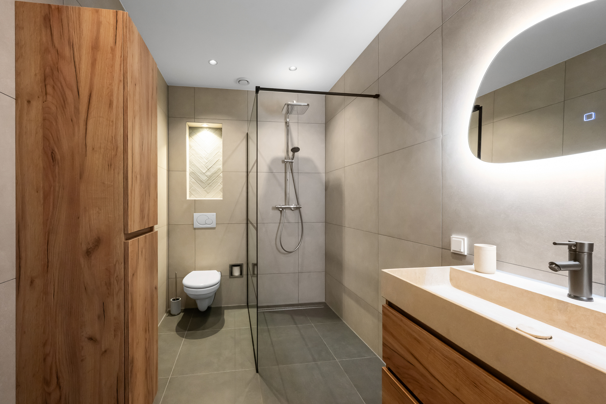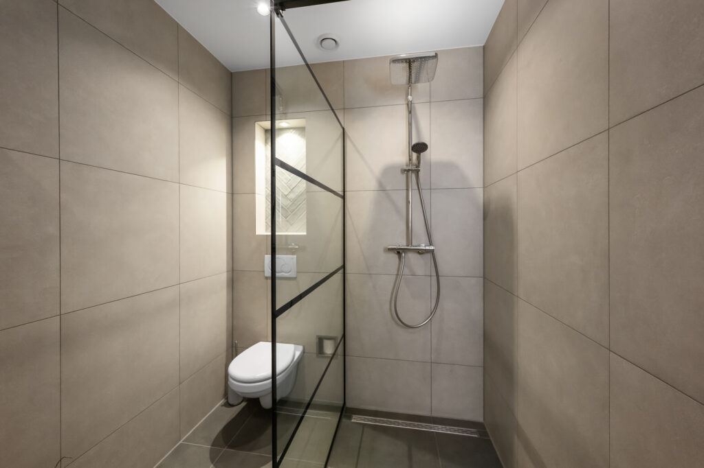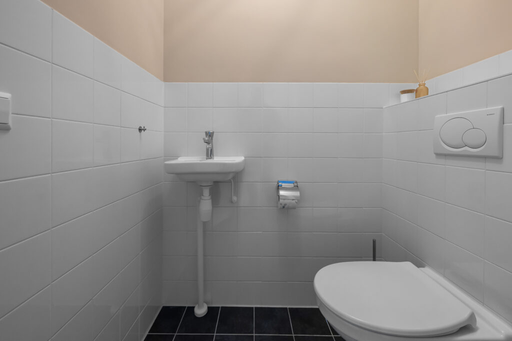 De moderne badkamer is uitgevoerd met een wastafelmeubel, verwarmde spiegel, ruime inloopdouche en een toilet. Daarnaast is er een separate toiletruimte met hangtoilet en fonteintje aanwezig op deze verdieping. Ook is er een aparte wasruimte met aansluitingen voor wasmachine en droger en de WTW-installatie. De cv-ketel (Remeha) is recent vernieuwd in 2024.