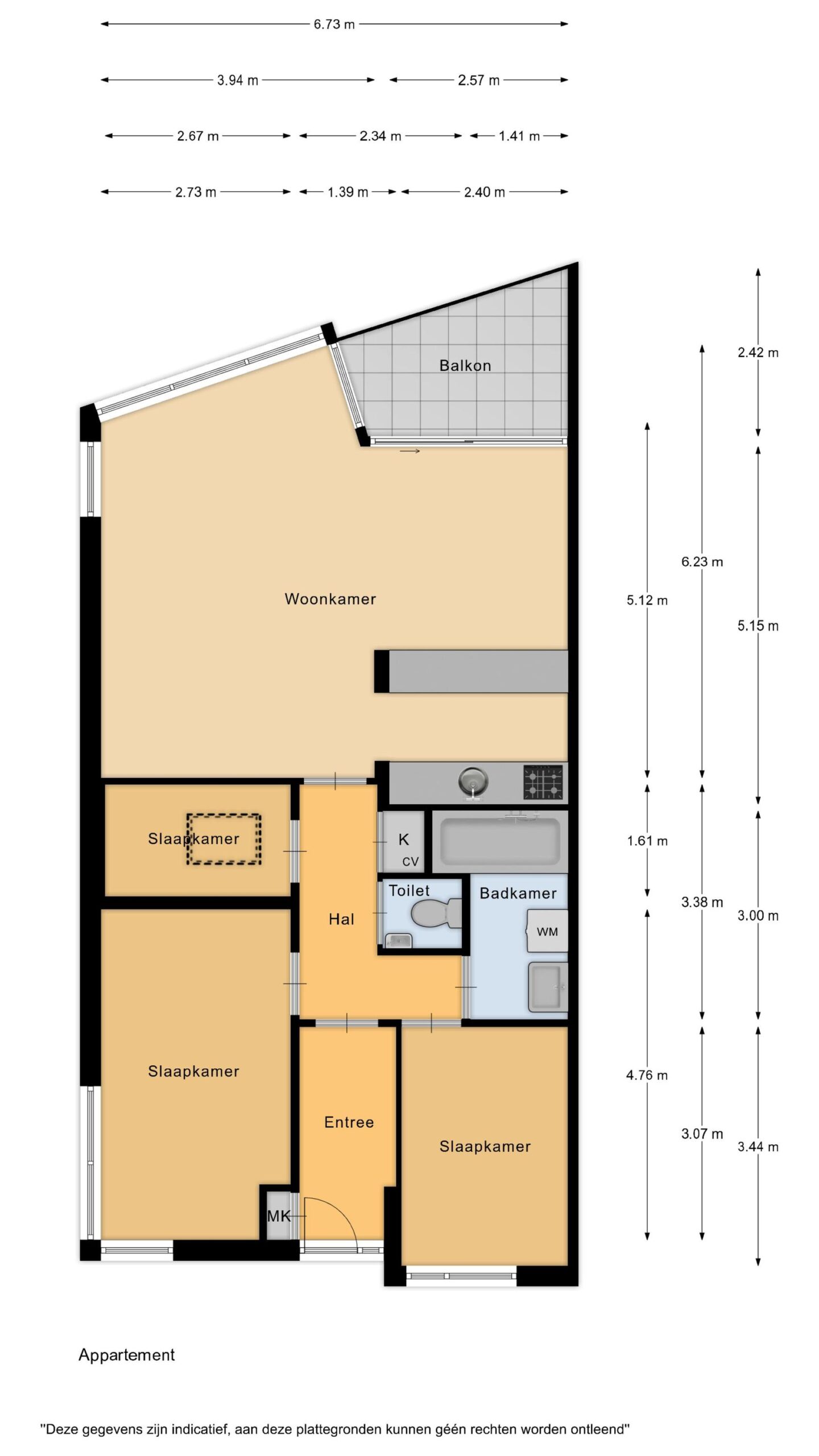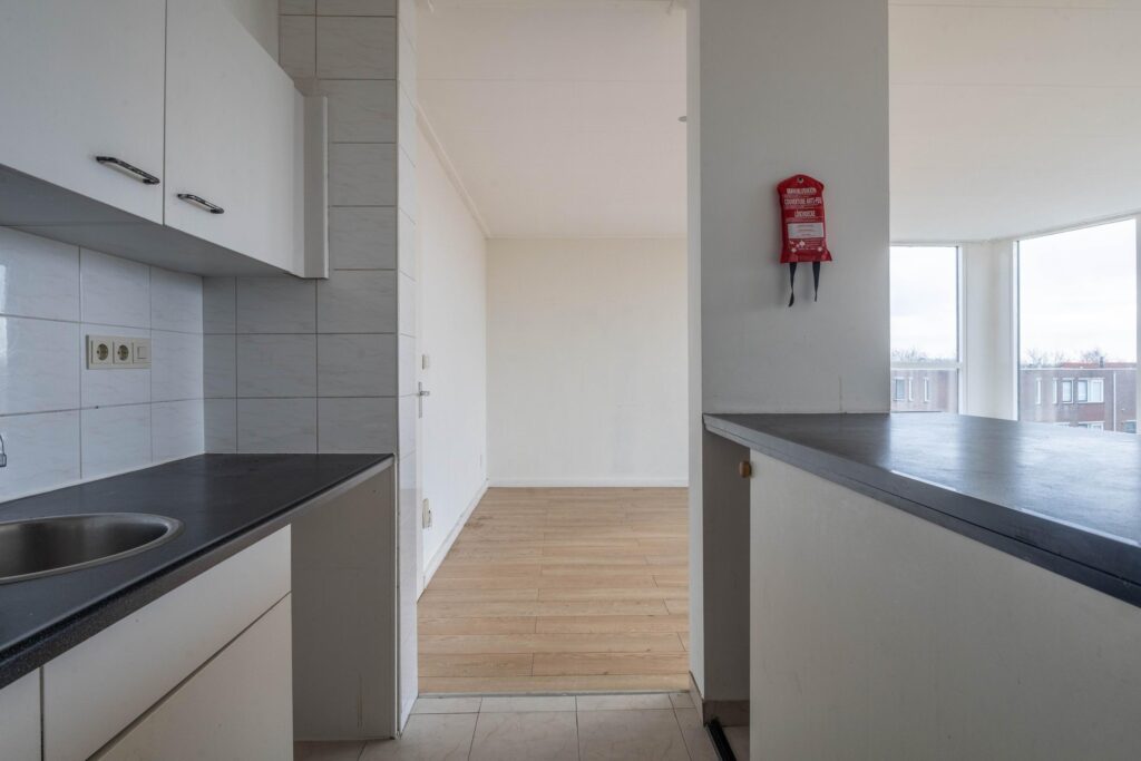 Via de lange hal zijn alle ruimtes te bereiken met aan de achterzijde de goed bemeten woonkamer. De woonkamer is heerlijk licht door de flinke raampartij en de schuifpui naar het balkon. Direct aan de woonkamer tref je de simpele keuken met veel mogelijkheden. Het appartement heeft drie slaapkamers waarvan één met dakraam. De badkamer is netjes en voorzien van een ligbad, wastafel en wasmachine aansluiting. Separaat heb je nog de beschikking over een toilet en cv-ruimte.