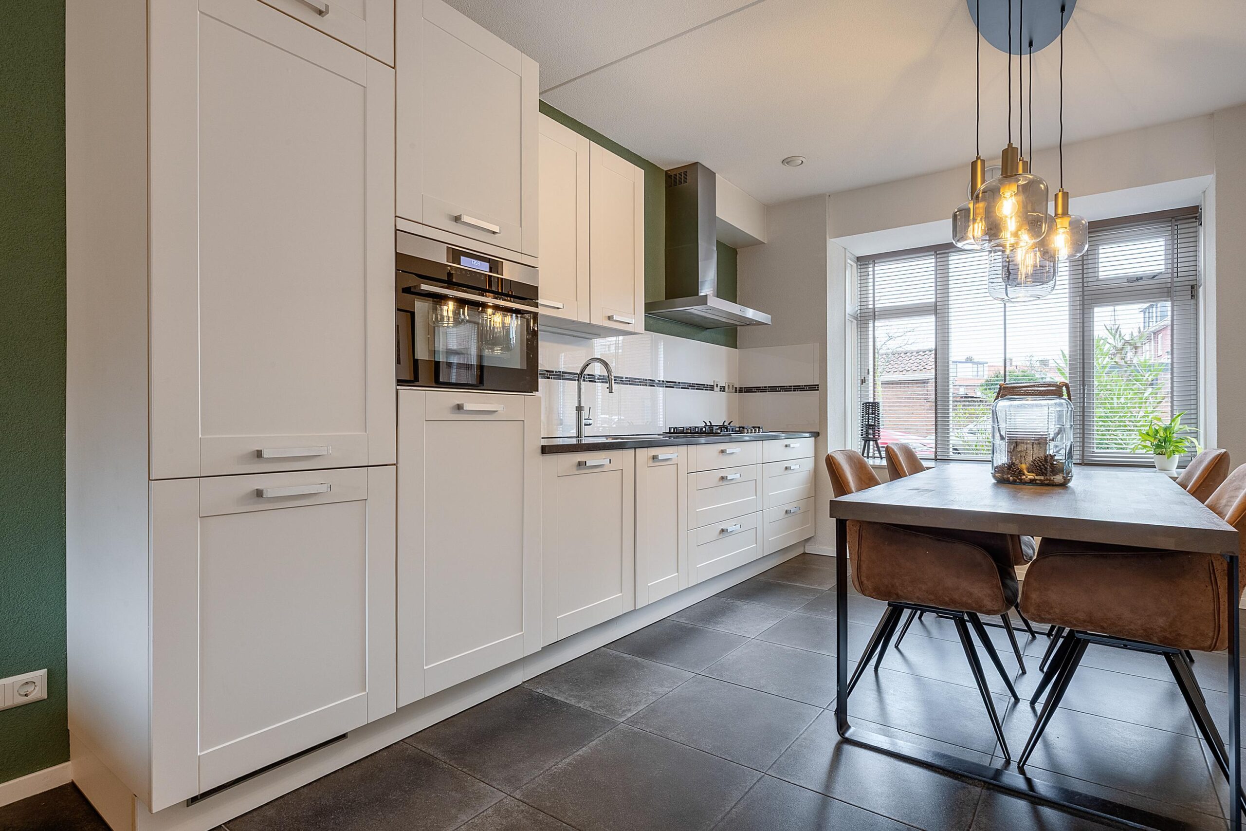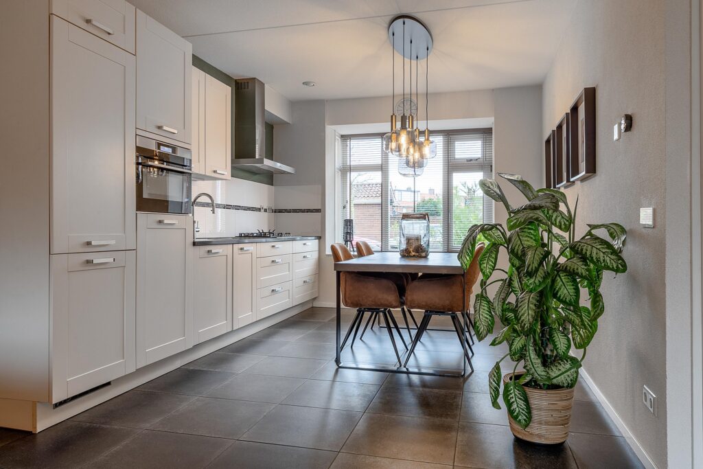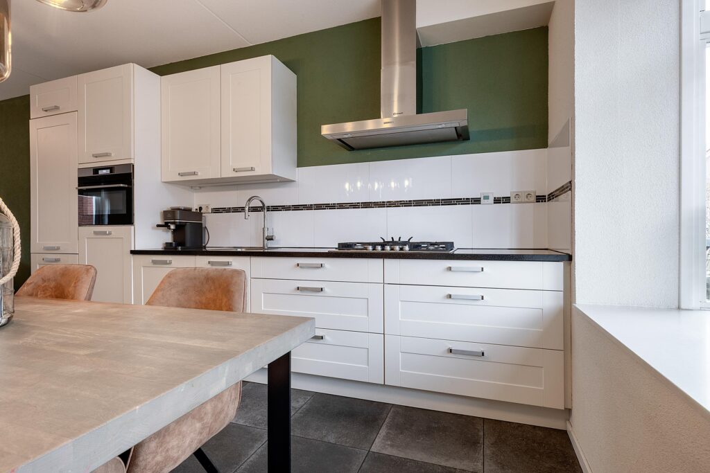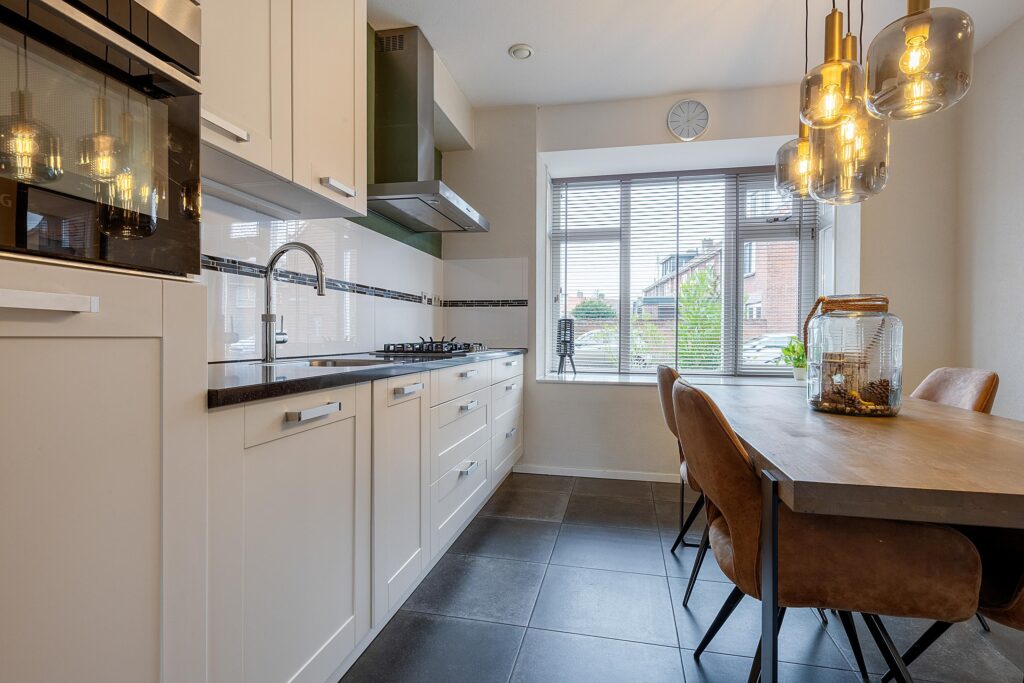 Aan de voorzijde bevindt zich de moderne keuken, compleet uitgerust met diverse inbouwapparatuur en een Quooker, waardoor koken hier elke dag een plezier is.