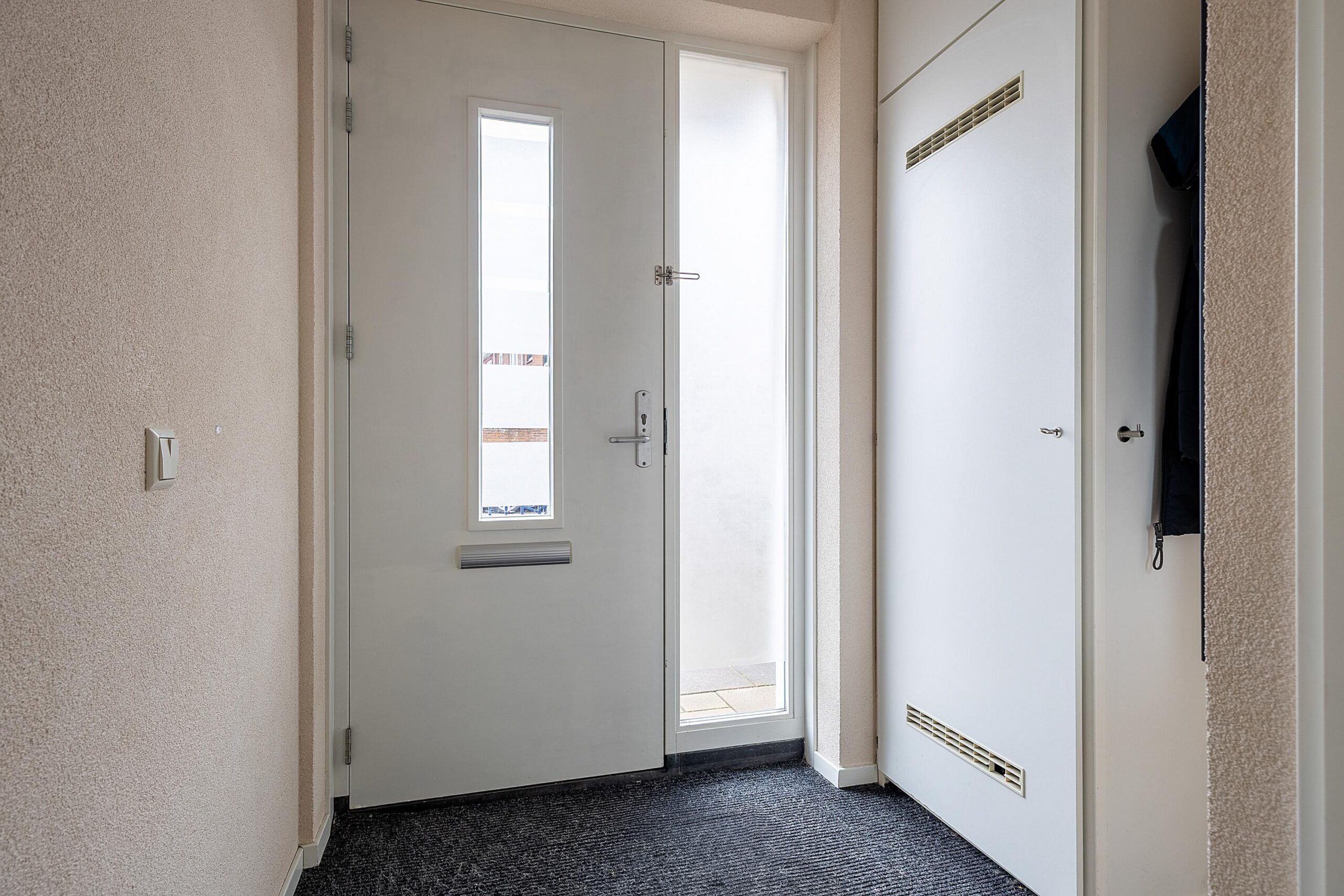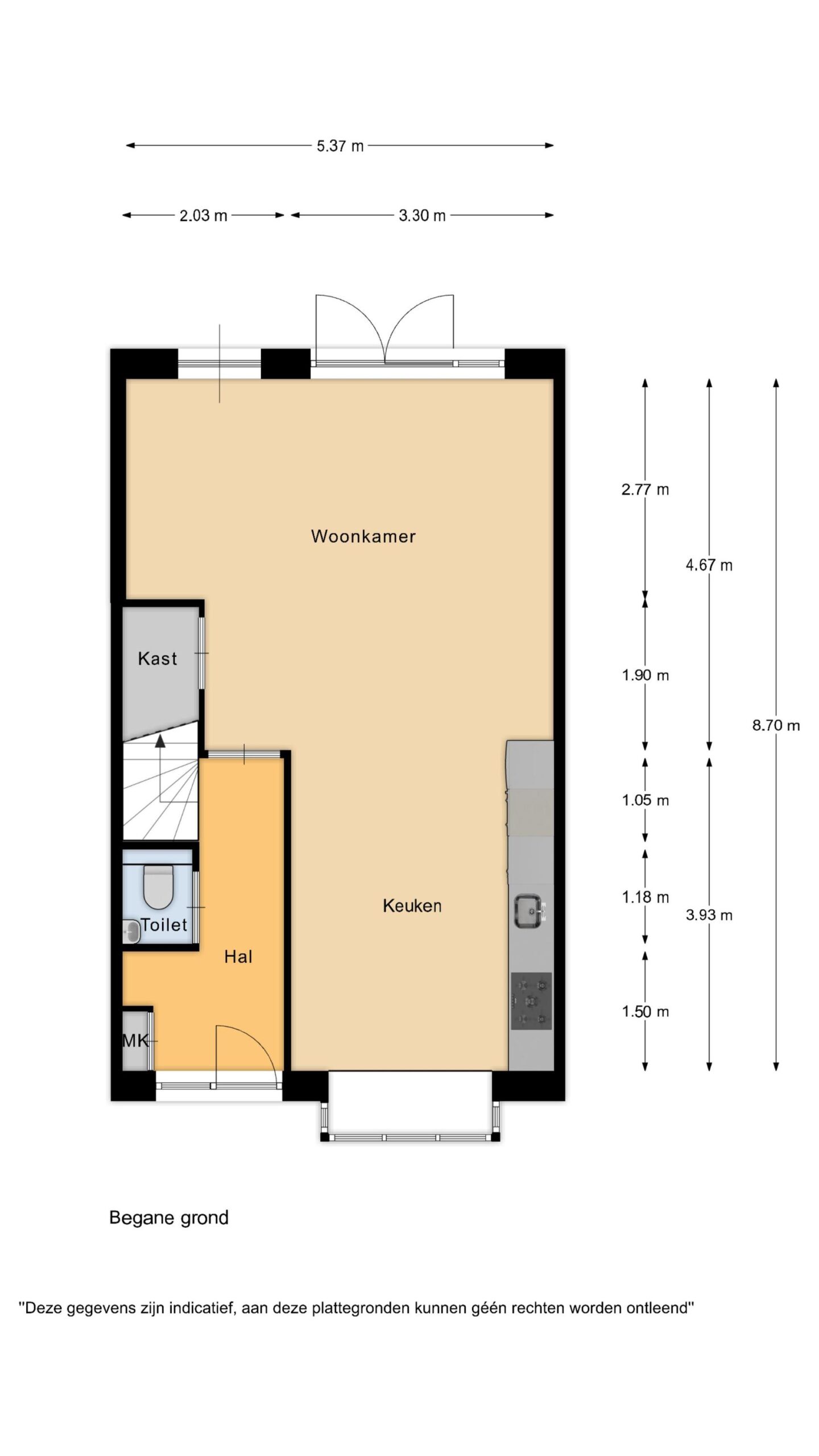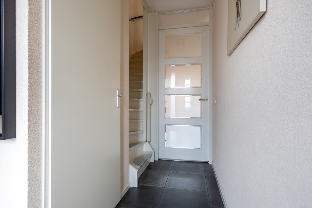 Via de nette entree kom je binnen in de hal met meterkast en toiletruimte. De woonkamer is heerlijk licht en ruim opgezet en vormt het hart van het huis. De vloerverwarming zorgt voor extra comfort en de openslaande deuren verbinden binnen moeiteloos met buiten. De praktische trapkast biedt extra bergruimte.