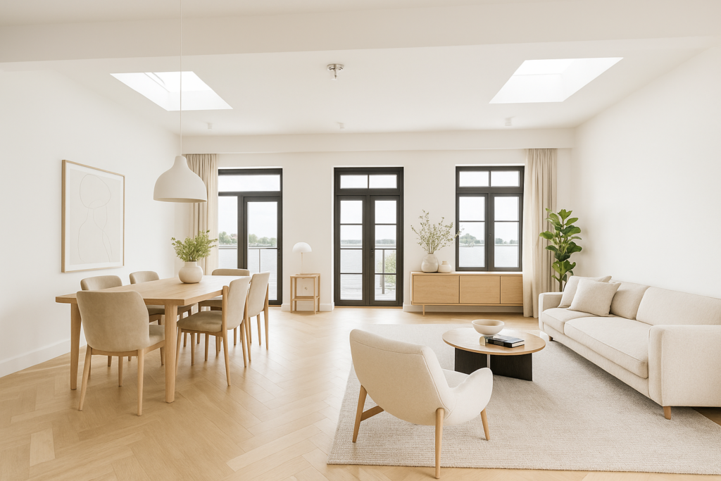 We beginnen het een keer helemaal anders — en eerlijk gezegd past dat perfect bij deze woning. We stappen niet via de voordeur binnen, maar starten aan de achterzijde. Want wát een uitzicht heb je hier vanuit de woonkamer! Met de Zaanse Schans als overburen is het elke dag genieten van de karakteristieke molens en het water. En het mooiste? Je hebt hier je eigen privé steiger! Leg je boot aan en vaar zó de Zaanstreek en omstreken door.
