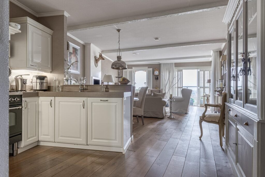 Maar niet alleen het uitzicht is iets waar wij enthousiast van zijn geworden, ook binnen in het appartement loop je met een grote glimlach op je gezicht. De ruime woonkamer is sfeervol ingericht en gelegen aan de achterzijde met toegang tot het balkon. De open keuken is geplaatst in een U-opstelling en heeft een fijne verbinding met het leefgedeelte. De keuken is voorzien van diverse inbouwapparatuur, maar het Boretti gasfornuis is een extra vermelding waard.