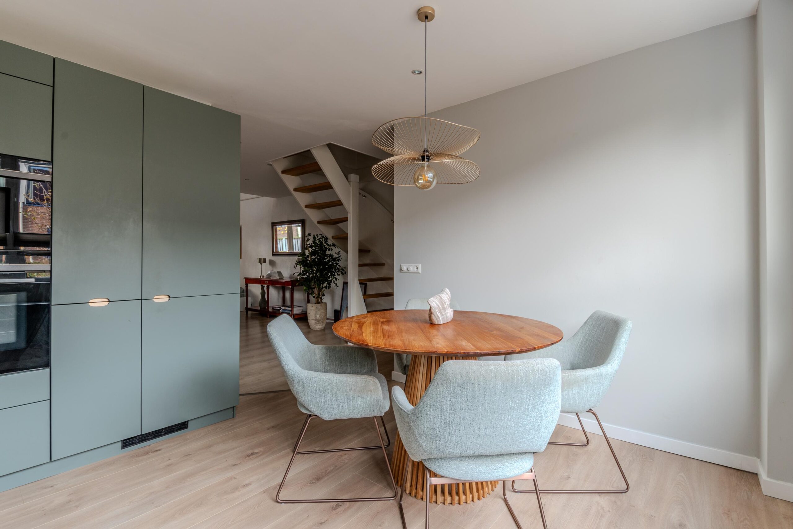 Bij binnenkomst in een stijlvolle hal word je naar de woonkamer geleid, waar de aangename vloerverwarming samen met de indrukwekkende vide, het vrije zicht op de achtertuin en de lichte afwerking direct een ruimtelijk gevoel creëert. Aan de voorzijde bevindt zich de moderne open keuken (2022), uitgevoerd in een luxe, tijdloze stijl en uitgerust met hoogwaardige Siemens StudioLine apparatuur. Denk aan een inductiekookplaat met geïntegreerde afzuiging, een volautomatische koffiemachine, combi-oven, koel-vriescombinatie en een Quooker. Een fijne plek waar koken echt een plezier wordt.