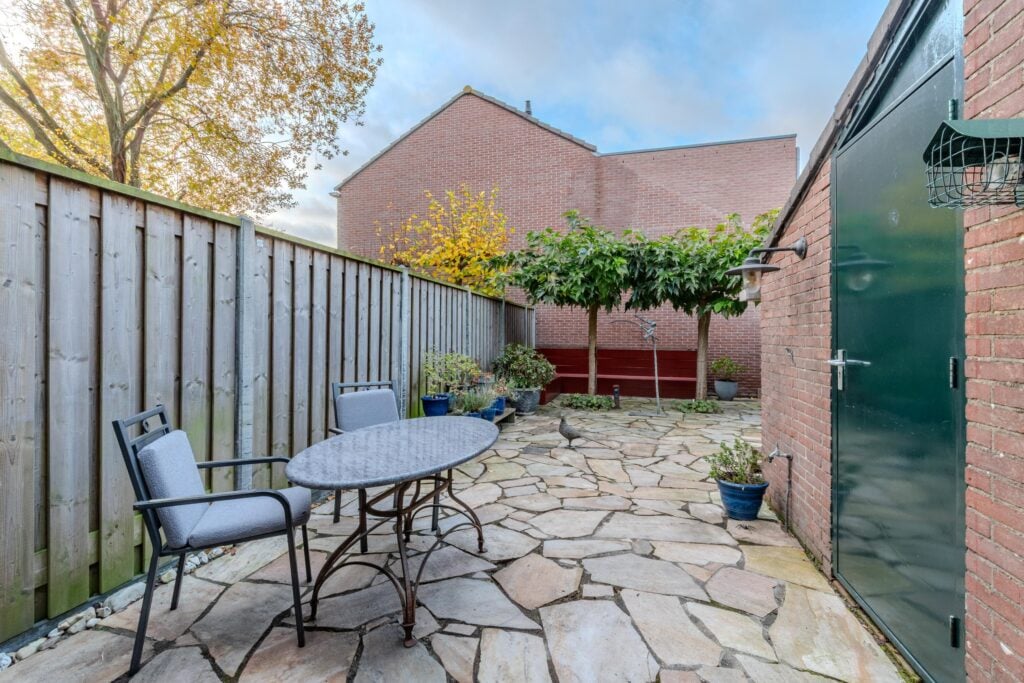 Via de openslaande tuindeur, met dubbele hordeuren, aan de achterzijde stap je zo de tuin in. De achtertuin is netjes aangelegd, biedt veel privacy en beschikt over een afsluitbare achterom. Een heerlijke plek om te genieten van de ochtendzon of van lange, zwoele zomeravonden. Daarnaast is er een praktische inpandige berging en voor het terras is elektrische zonwering aanwezig voor extra verkoeling.