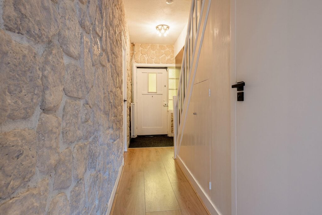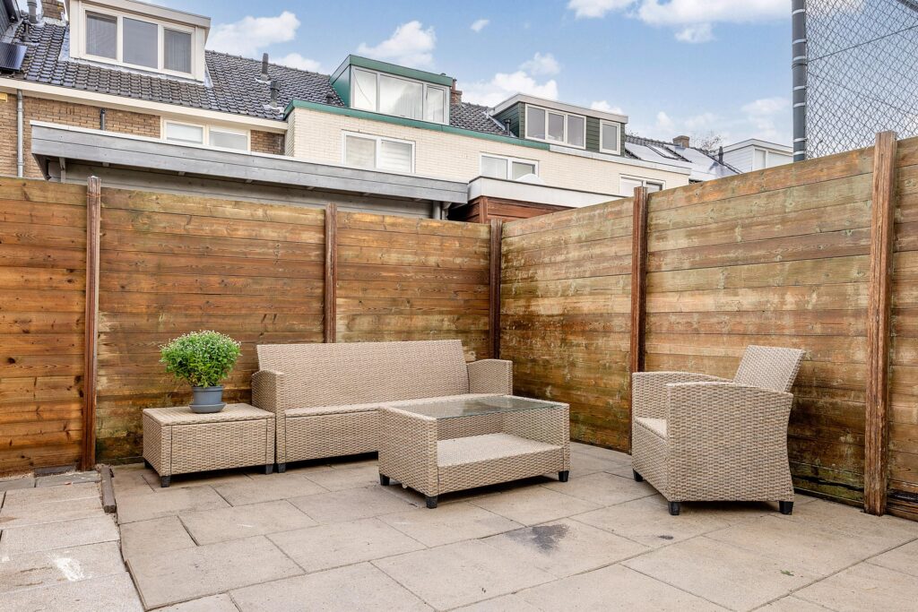 De achtertuin is netjes aangelegd met bestrating en groene accenten. Dankzij de hoekligging kan je de tuin dus op verschillende manier bereiken. Daarbij is het zomers van ’s morgens tot ’s avonds genieten van zon in de tuin.