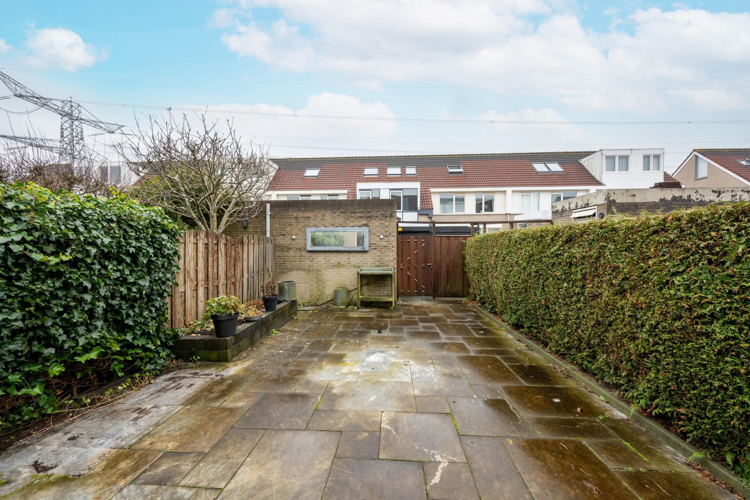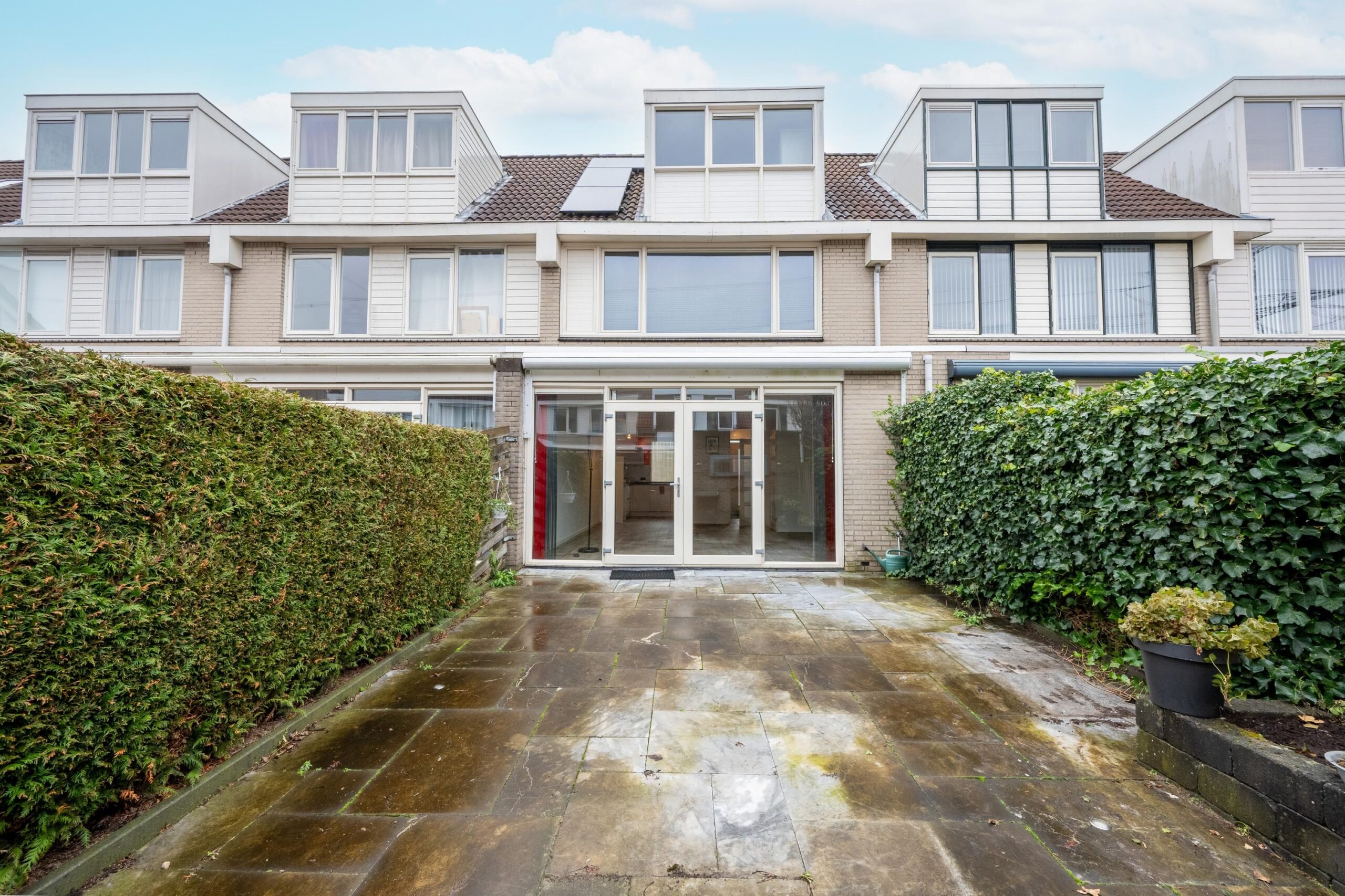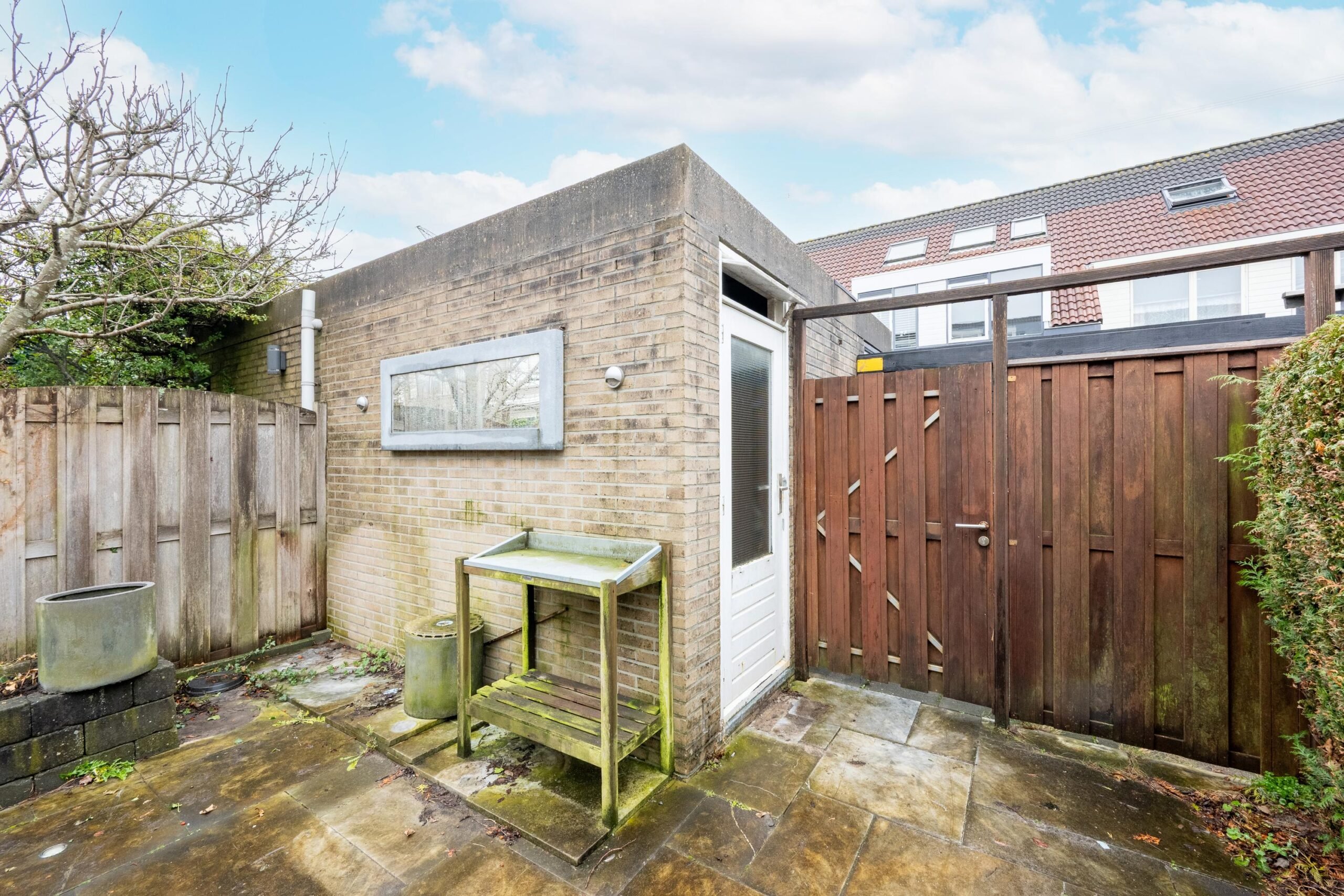 De achtertuin op het zuiden is bereikbaar via de openslaande deuren en is diep en onderhoudsvriendelijk aangelegd. Een fijne, zonnige plek om in alle rust buiten te zitten, met ruimte voor een terras en groen. Achter in de tuin staat een stenen berging voor fietsen en tuingereedschap en er is een achterom aanwezig.