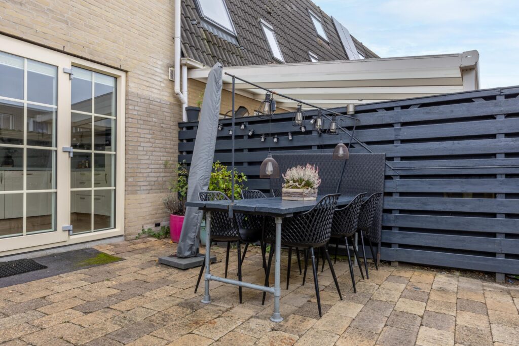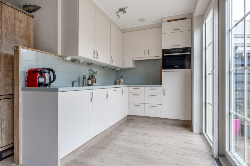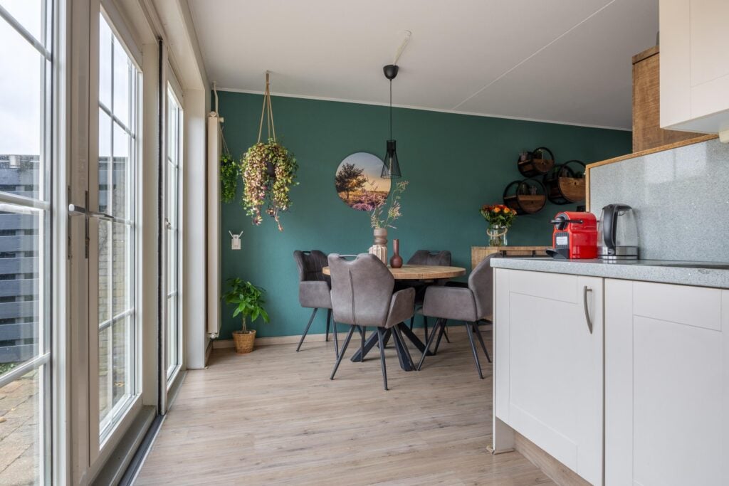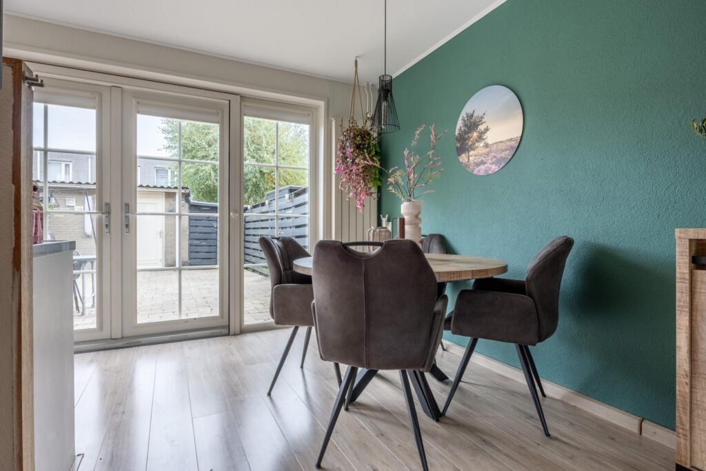 Aan de achterzijde bevindt zich het eetgedeelte, met plaats voor een grote eettafel waar het hele gezin kan aanschuiven. De open verbinding met de keuken zorgt voor een huiselijke sfeer, waarin koken en samenzijn moeiteloos samengaan. De keuken is uitgerust met diverse inbouwapparaten en profiteert optimaal van het daglicht dat via de grote openslaande deuren binnenvalt. Deze deuren zijn daarnaast voorzien van recent geplaatste dubbele horren.