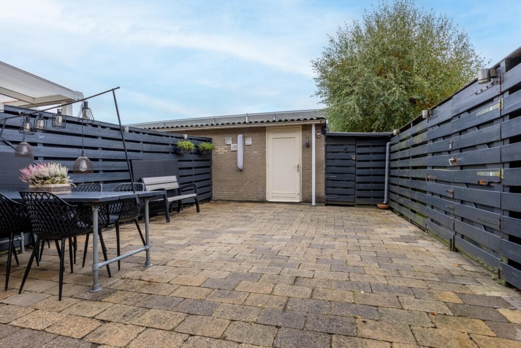 Deze deuren brengen je naar de zonnige tuin, gelegen op het oosten. Hier geniet je tot ongeveer 16.00 uur optimaal van de volle middagzon. De tuin (ca. 62 m²) is verzorgd aangelegd en beschikt over een stenen berging aan de achterzijde, ideaal voor het stallen van fietsen, (tuin)gereedschap of gewoon extra bergruimte. Ook is er nog een houten dichte overkapping geplaatst.
