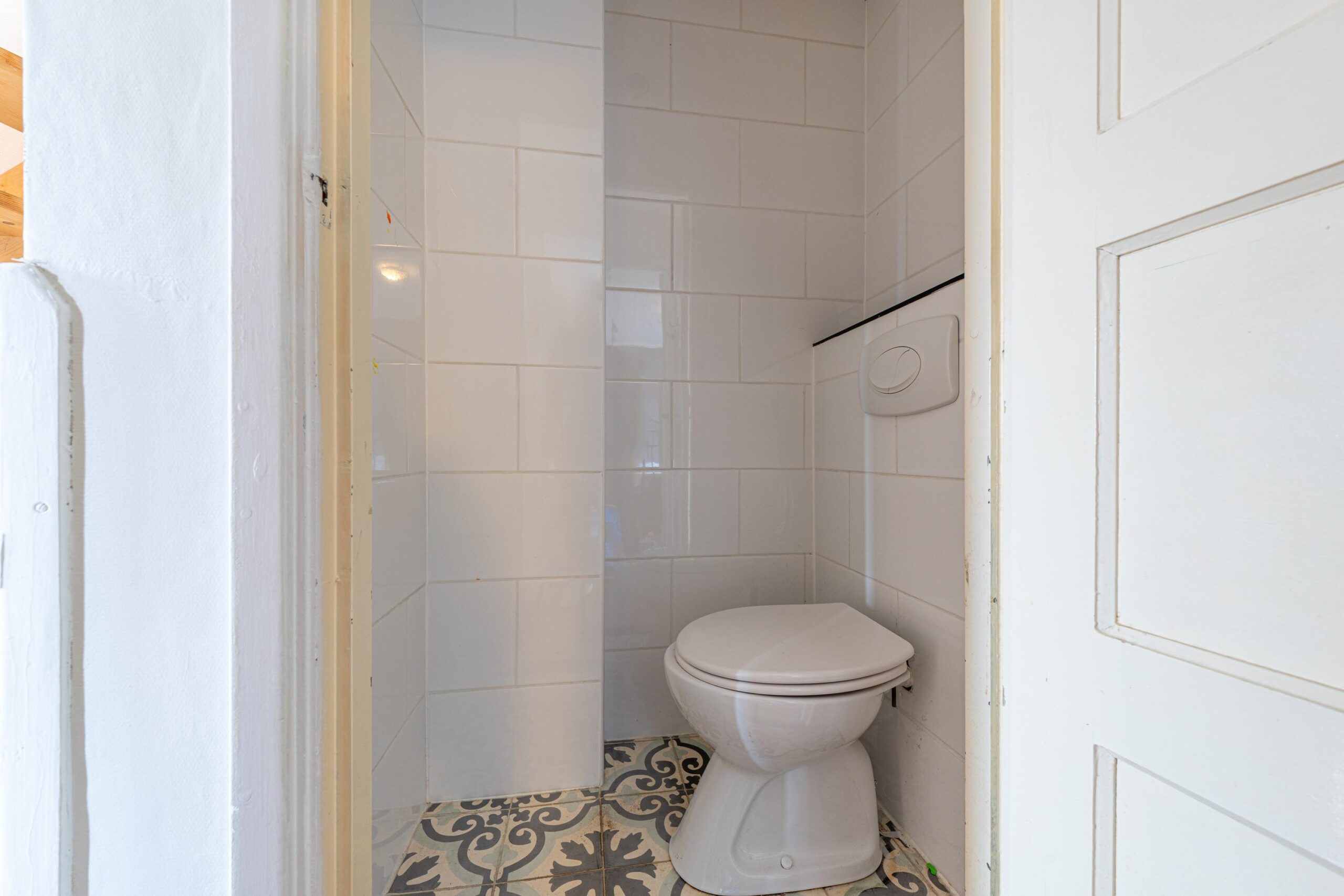 Aan de achterzijde bevindt zich de eenvoudige keuken uit 2014, functioneel ingericht en met directe toegang tot de diepe tuin. Hierdoor lopen binnen en buiten op een natuurlijke manier in elkaar over.