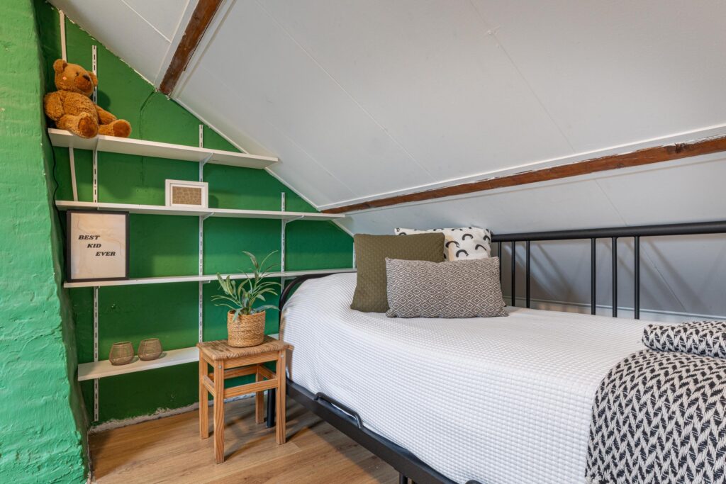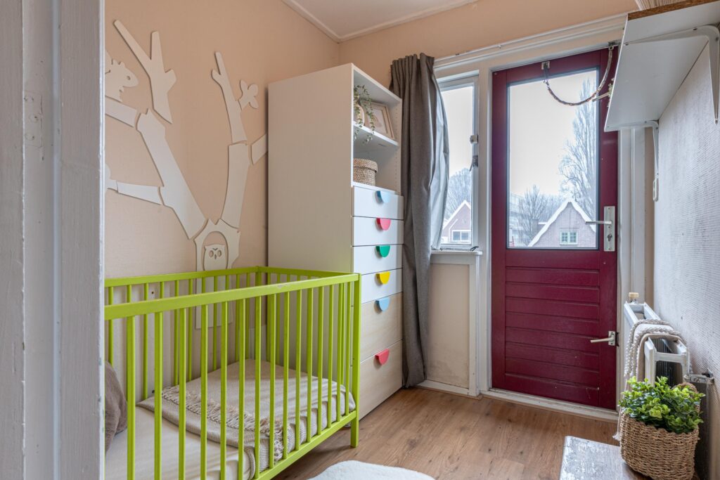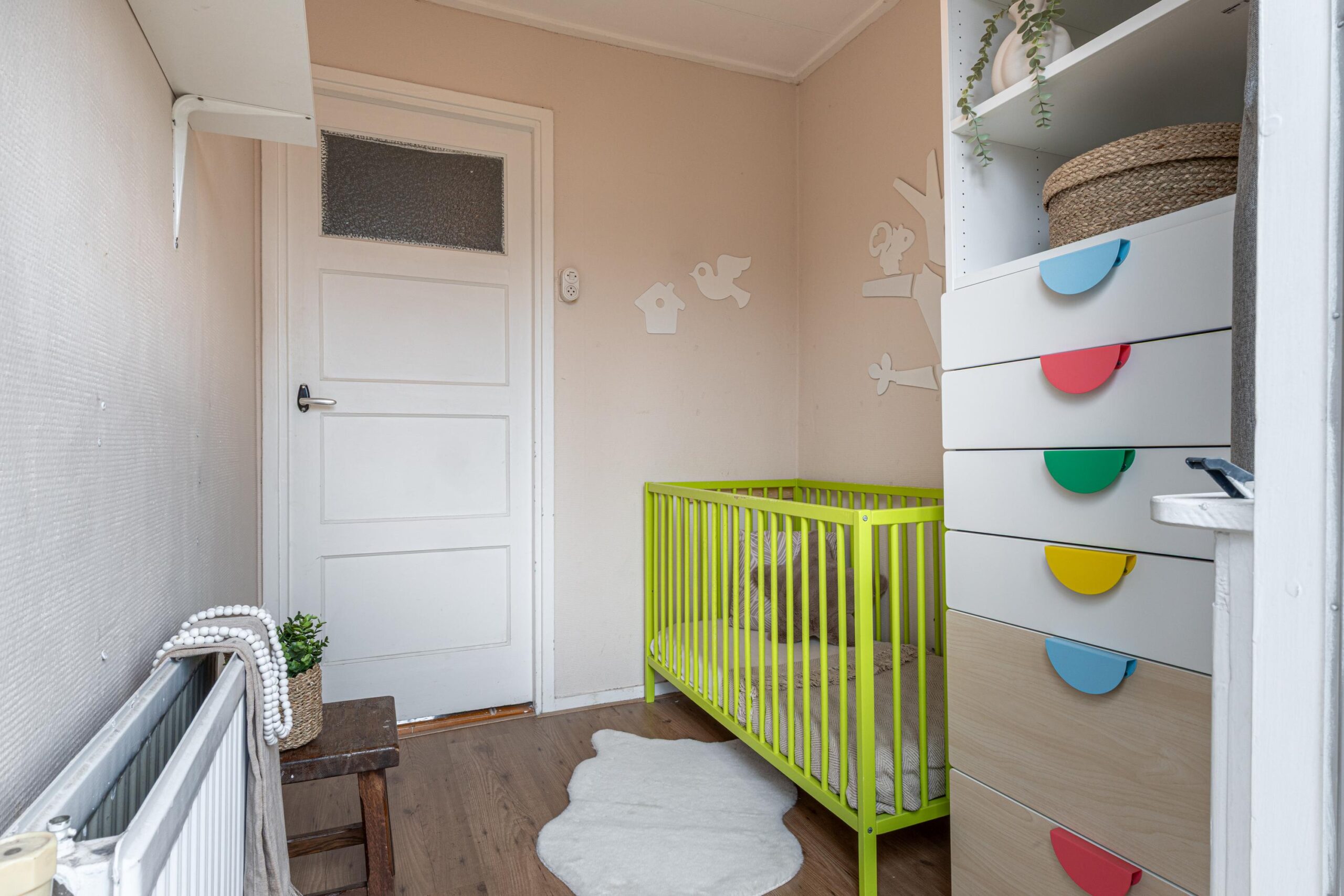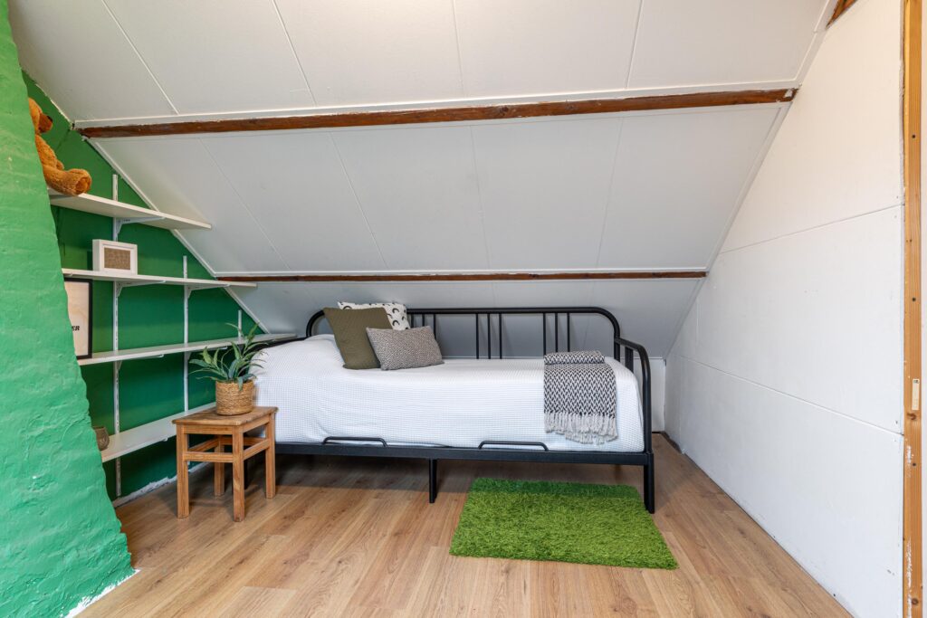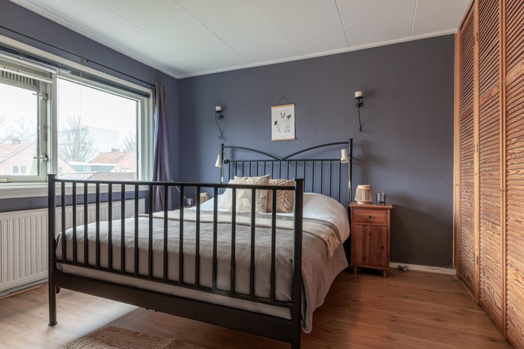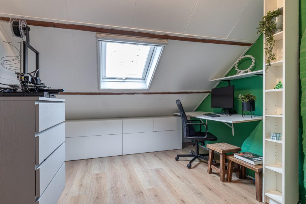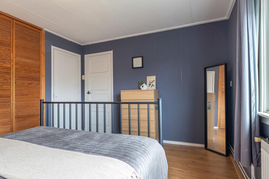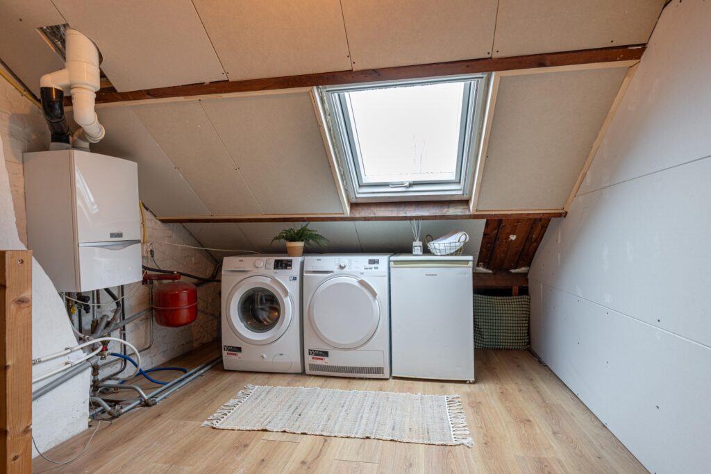 Via een vaste trap bereik je de tweede verdieping. Op de voorzolder bevinden zich de cv-opstelling en de aansluitingen voor wasmachine en droger. Aansluitend is hier een ruime slaapkamer gerealiseerd, een fijne en volwaardige ruimte die zich uitstekend leent als, logeerkamer of werkruimte.