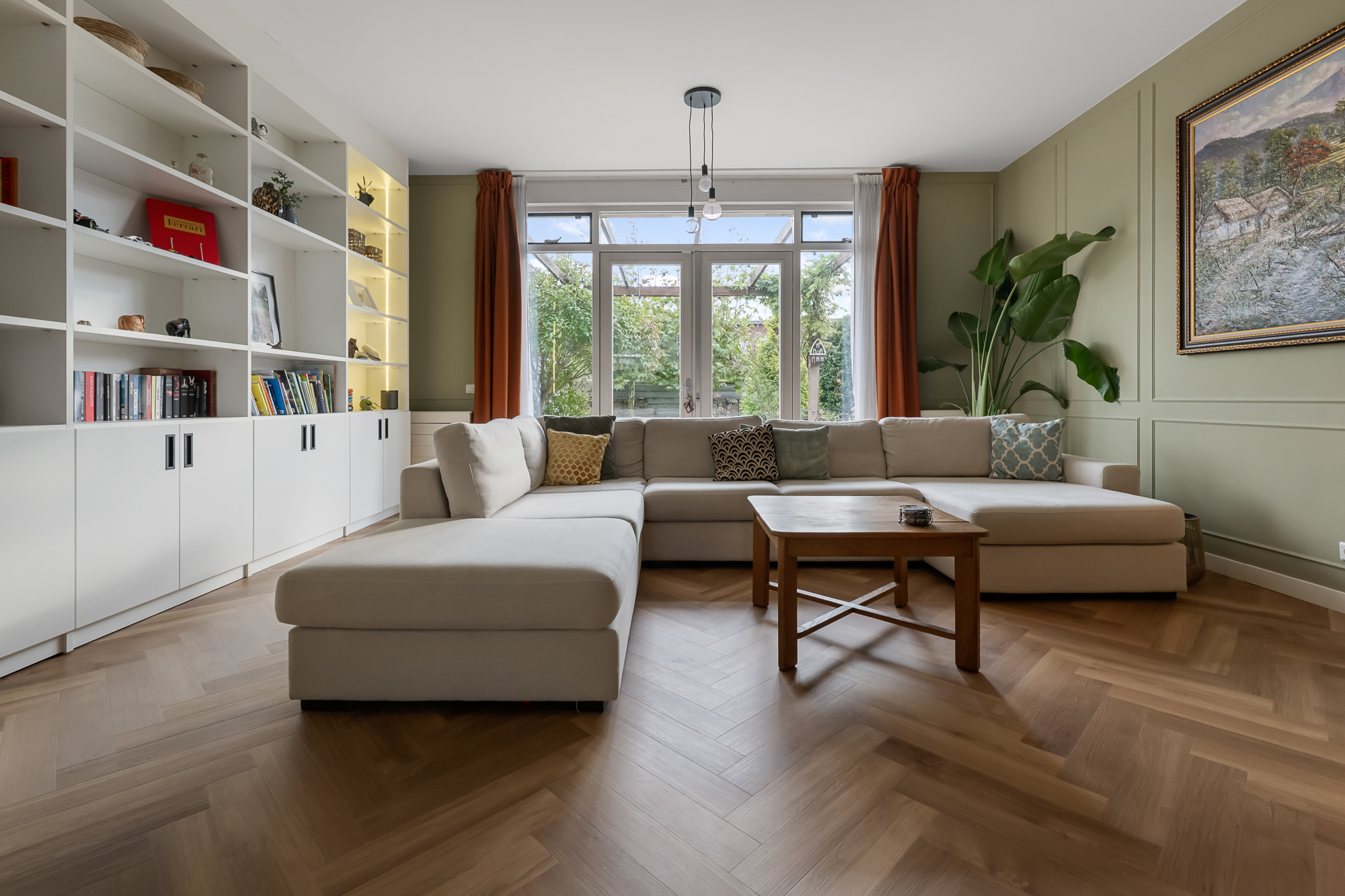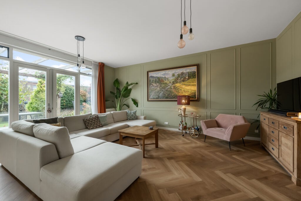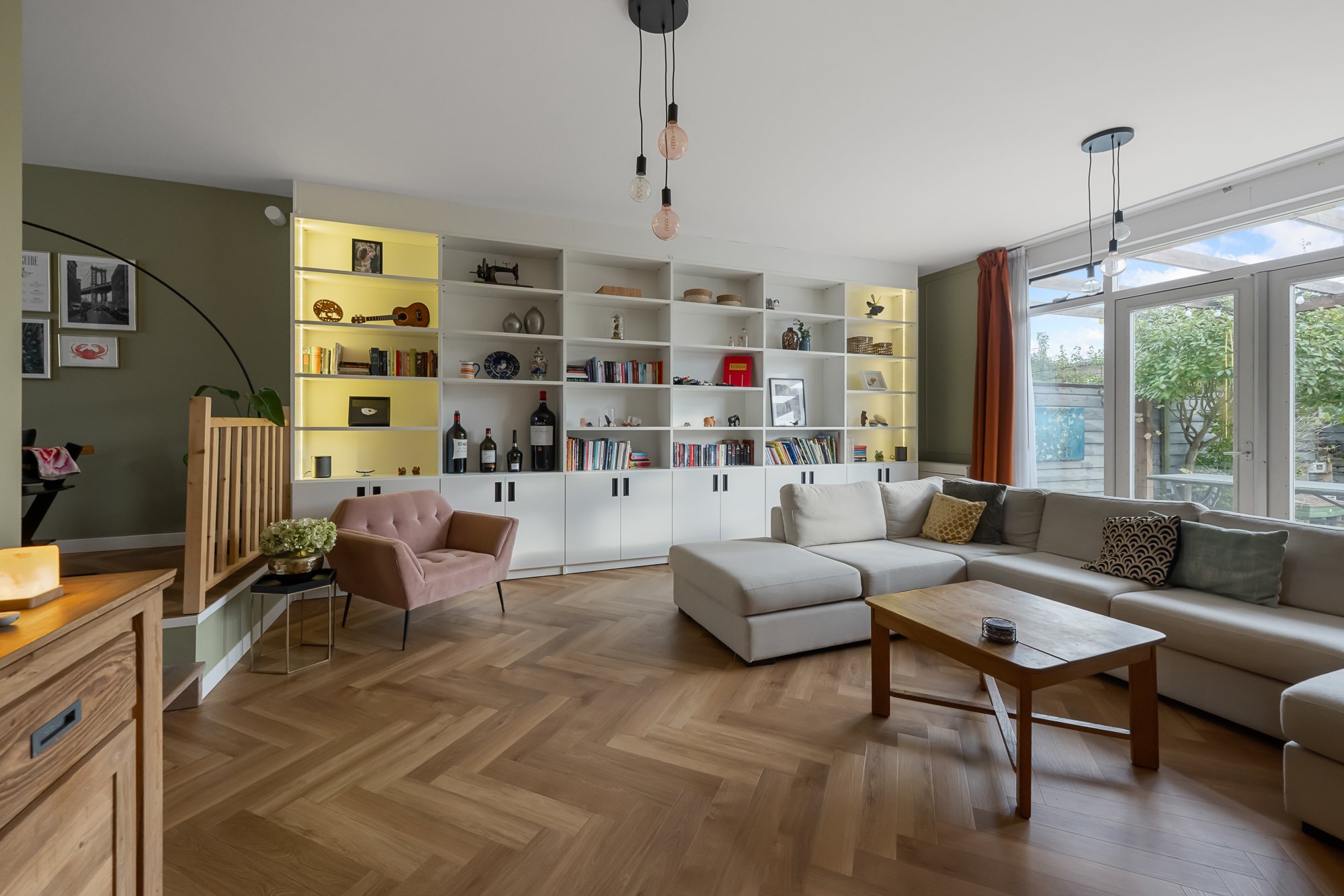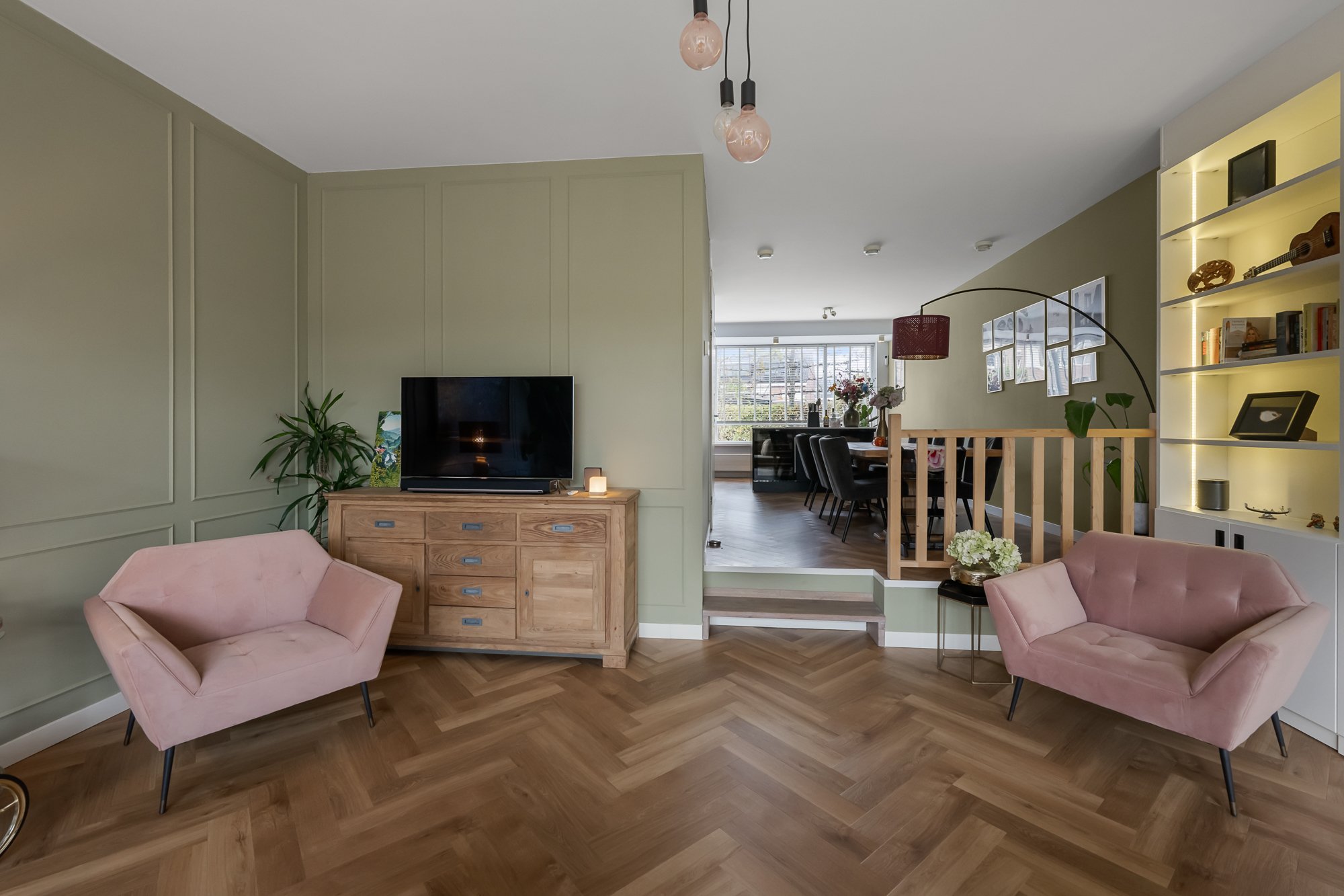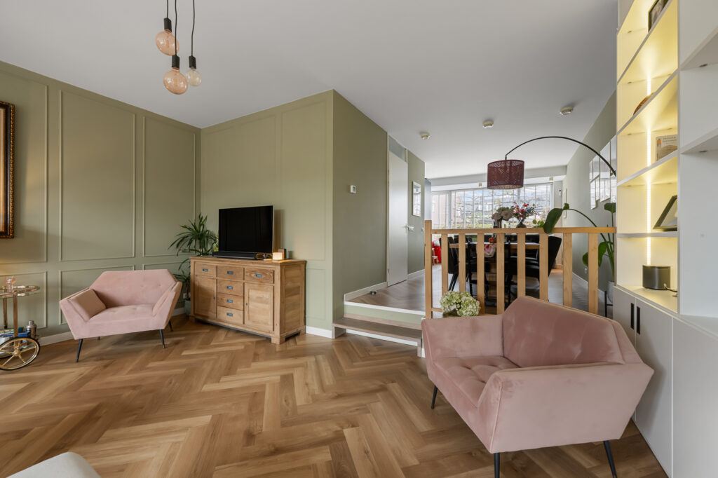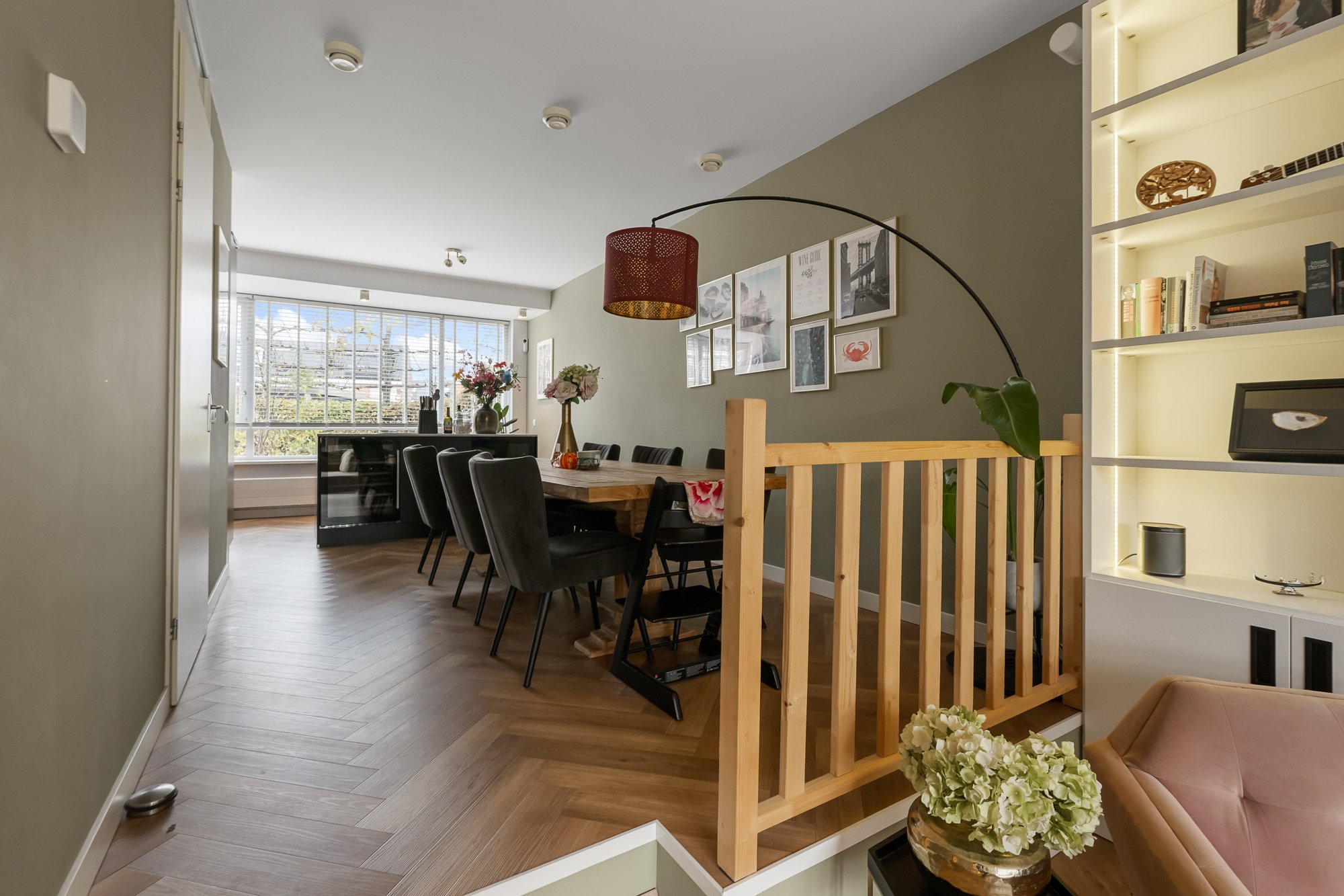 – eigentijdse en sfeervolle indeling met speels niveauverschil tussen eetkamer en woonkamer;