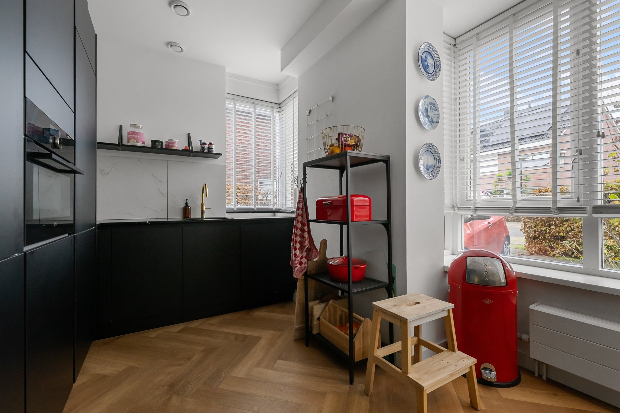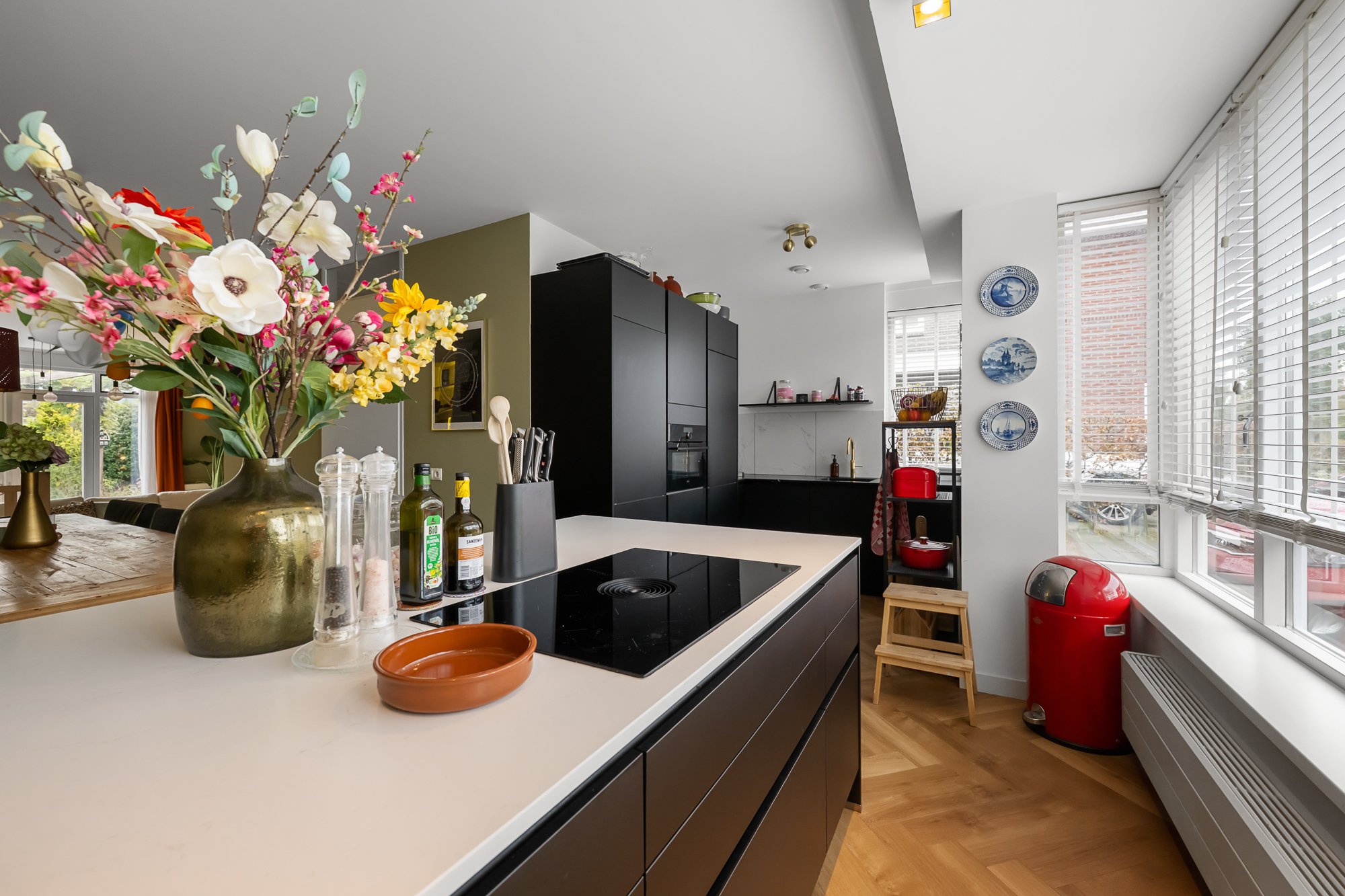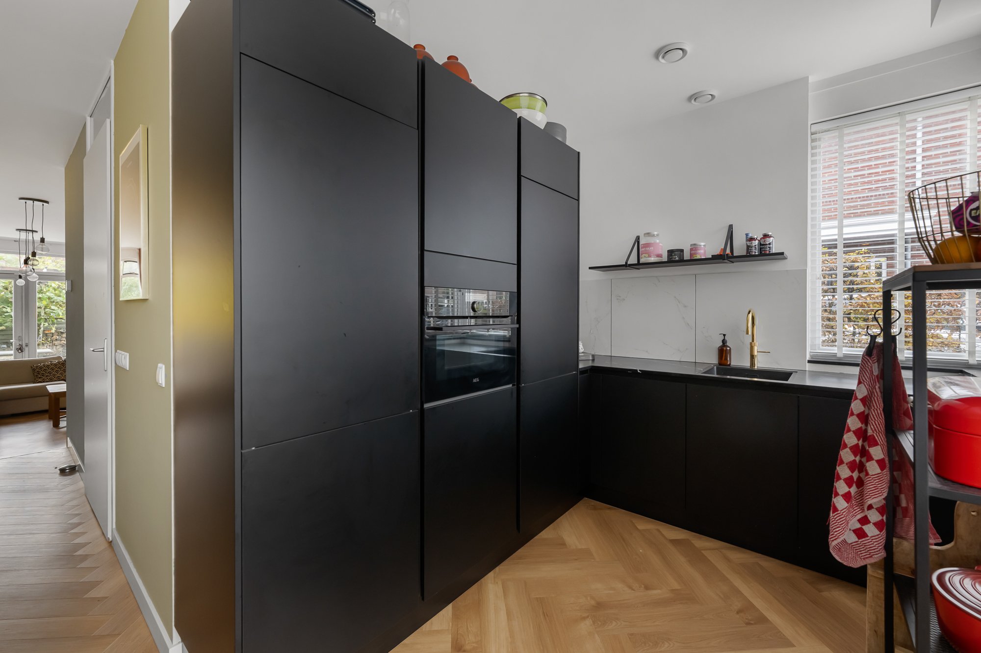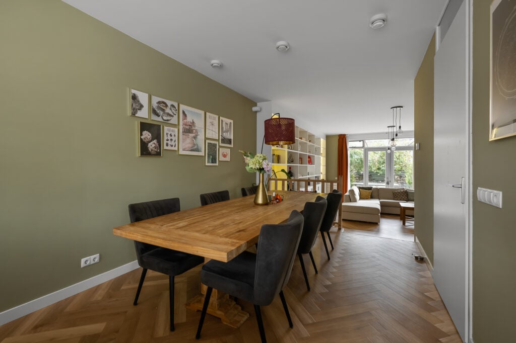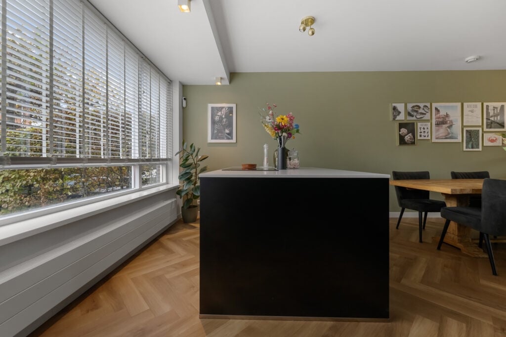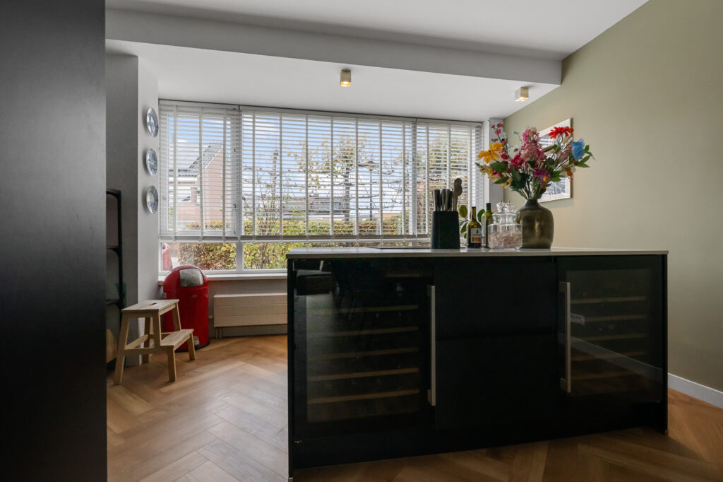 Via de zijentree kom je in de hal met meterkast, trapkast en een modern toilet (vernieuwd in 2021). De keuken, vernieuwd in 2020, is uitgevoerd in stijlvol zwart en voorzien van diverse inbouwapparatuur, waaronder een vaatwasser, koelkast, combimagnetron, Quooker en een kookeiland met twee wijnkoelers. De fraaie visgraatvloer en de strak afgewerkte wanden – deels in een stijlvolle groentint met sierlijsten – geven het geheel een luxe en eigentijdse uitstraling. De eetkamer ligt iets verdiept, wat zorgt voor een speels niveauverschil. De ruime woonkamer aan de achterzijde biedt veel lichtinval en heeft openslaande deuren naar de tuin, waardoor binnen en buiten mooi in elkaar overlopen.
