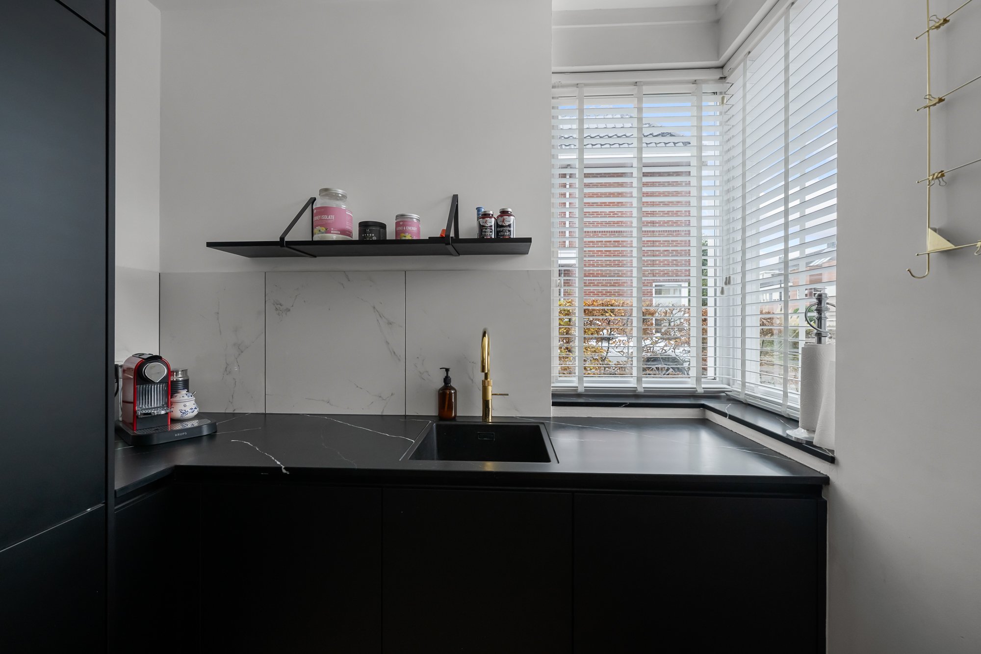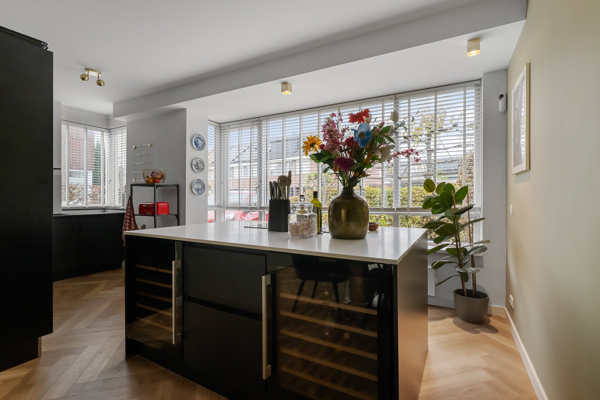 – luxe keuken (vernieuwd in 2020) in stijlvolle zwarte uitvoering met kookeiland, Quooker en twee wijnkoelers;
