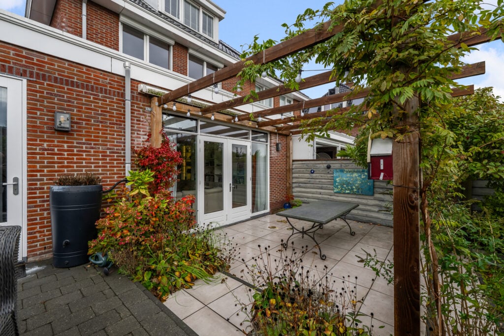 De woning heeft een zijentree, waardoor een mooie en praktische indeling ontstaat. Aan de voorzijde bevindt zich de sfeervolle straatgerichte keuken met volop lichtinval, terwijl de woonkamer aan de achterzijde juist rust en ruimte biedt. De openslaande deuren verbinden binnen met buiten en leiden naar de fraai aangelegde tuin met veranda en terras aan het water, een heerlijke plek om te ontspannen, te borrelen of te genieten van de ondergaande zon.