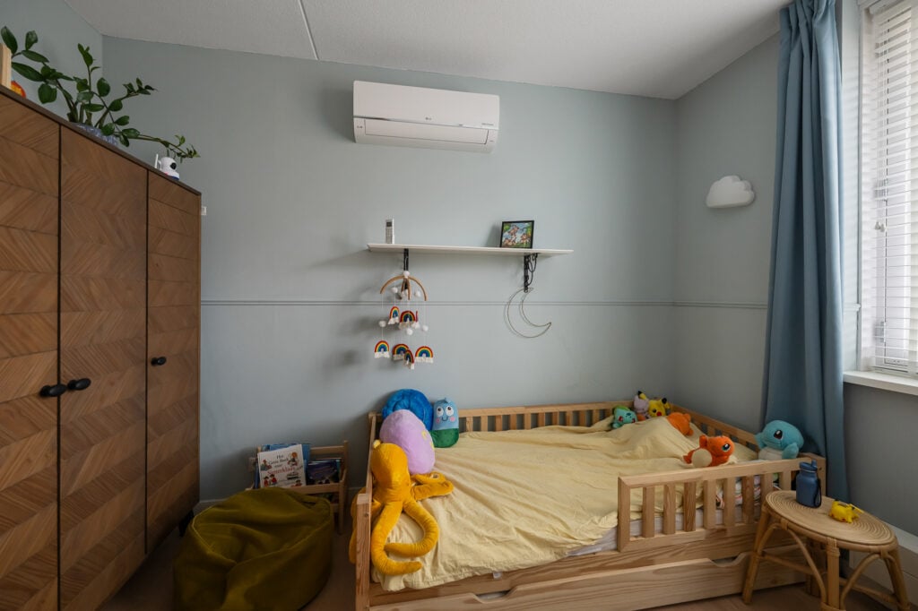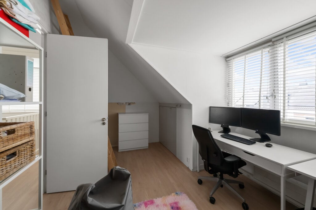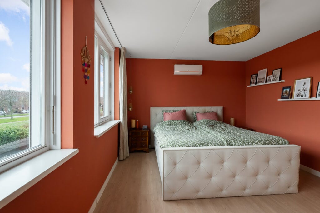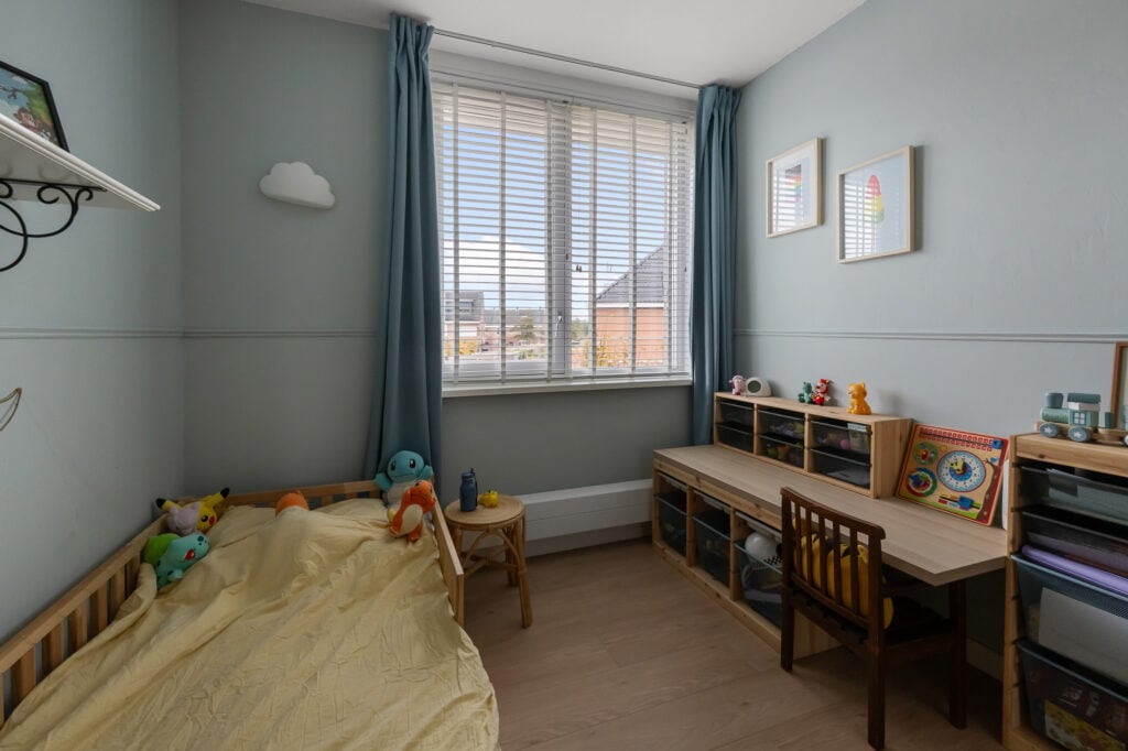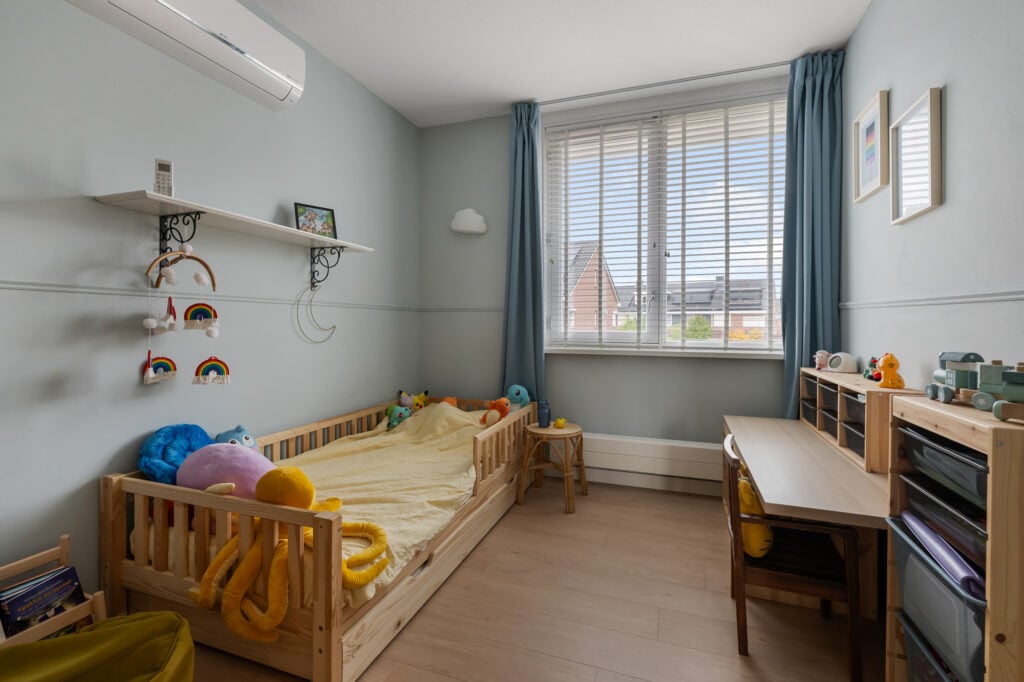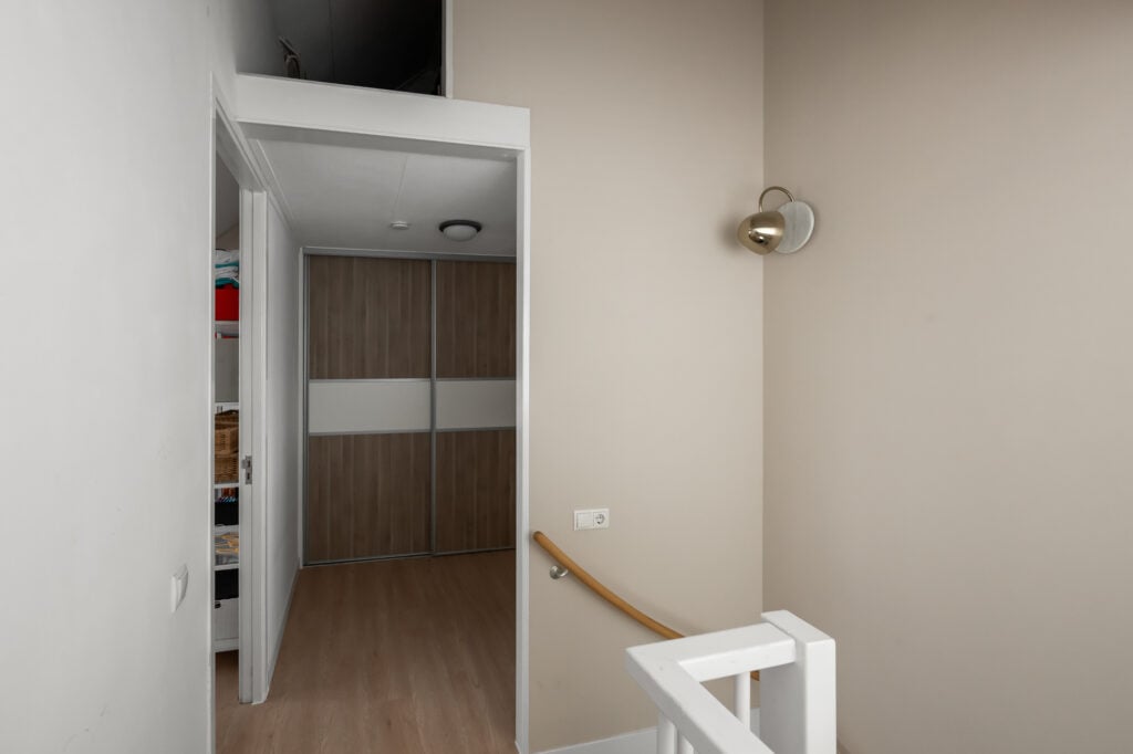 Via de ruime overloop zijn drie comfortabele slaapkamers bereikbaar. De hoofdslaapkamer en de kinderkamer zijn voorzien van airconditioning, wat zorgt voor een aangenaam binnenklimaat, ook op warme zomerdagen. Alle slaapkamers beschikken over rolluiken, waarvan één gedeeltelijk verduisterend is. De derde kamer wordt momenteel gebruikt als inloopkast, maar kan eenvoudig worden omgevormd tot een volwaardige slaapkamer of bijvoorbeeld een fijne werk- of hobbyruimte.
