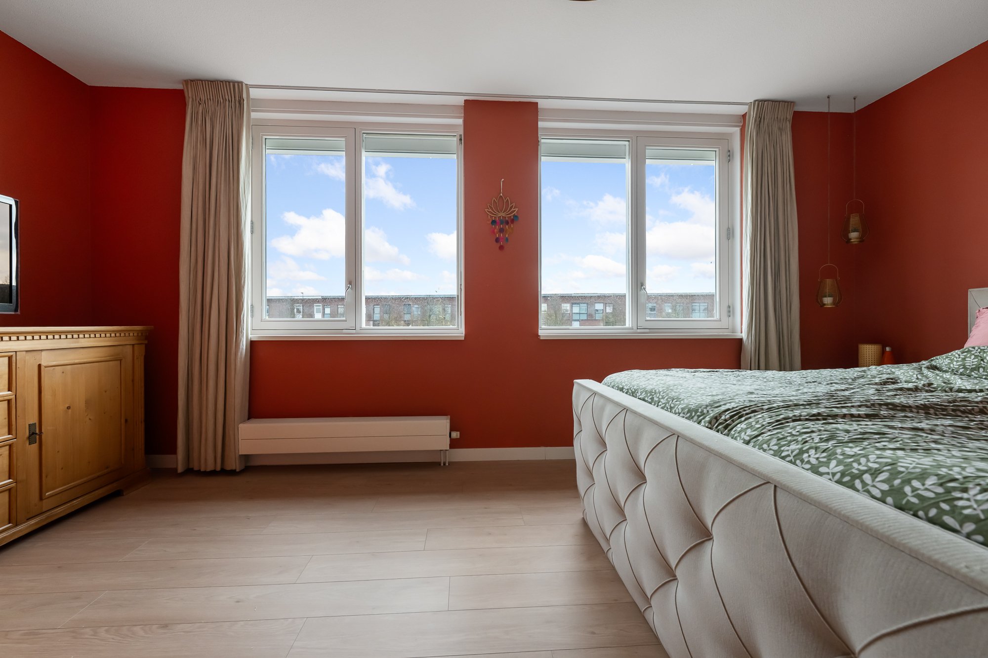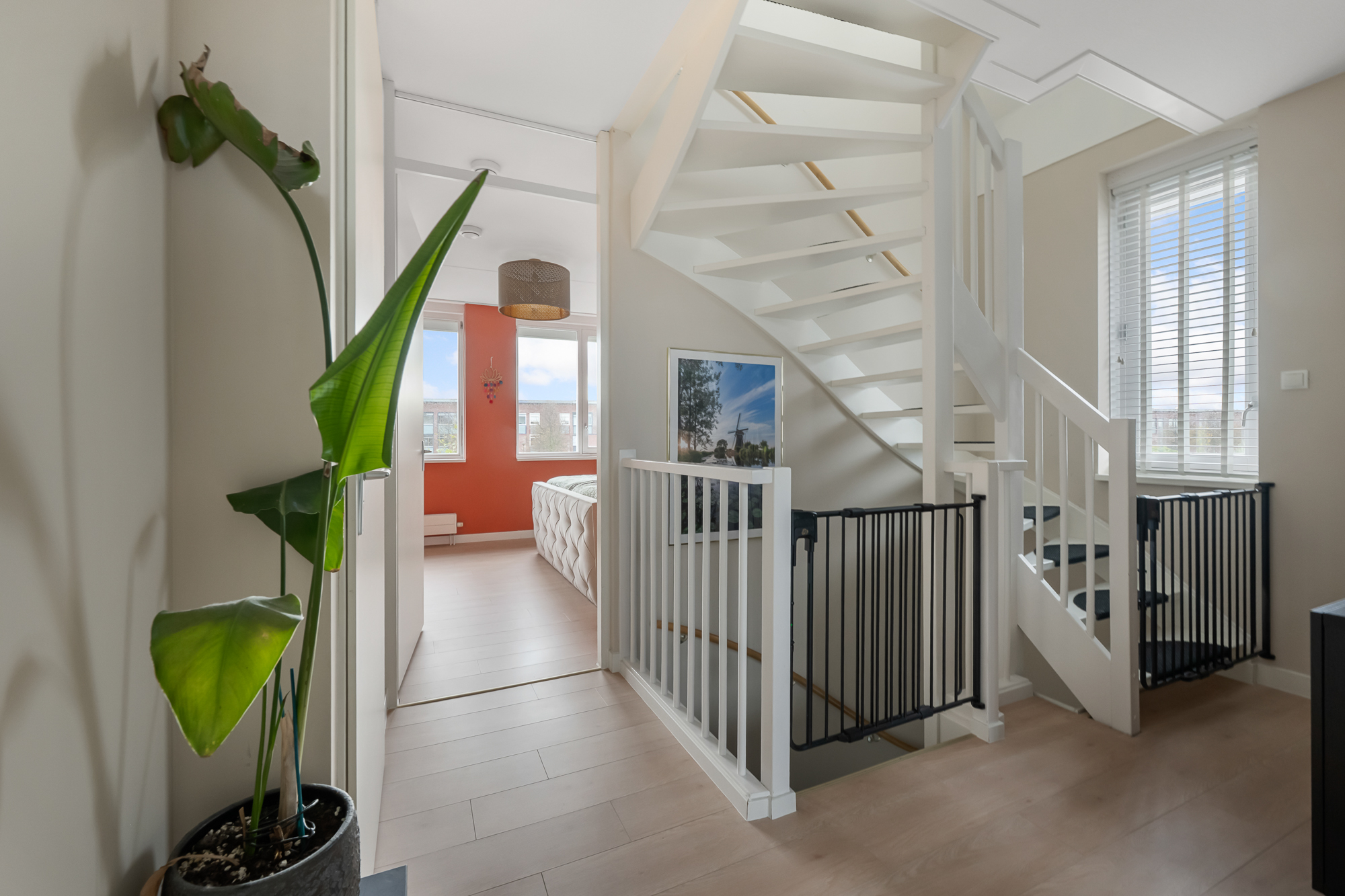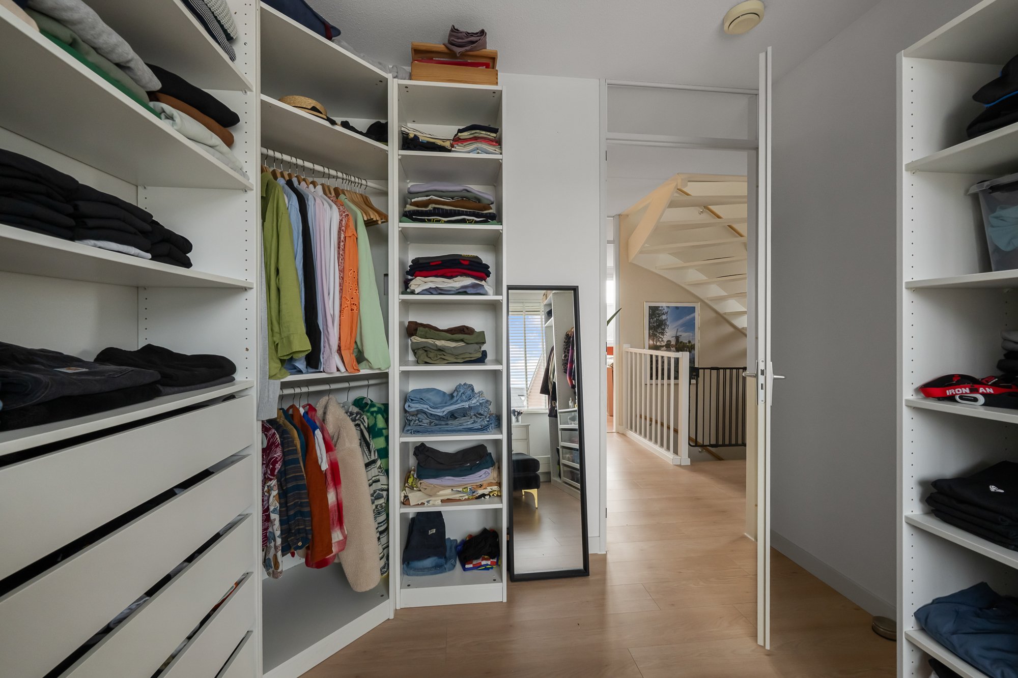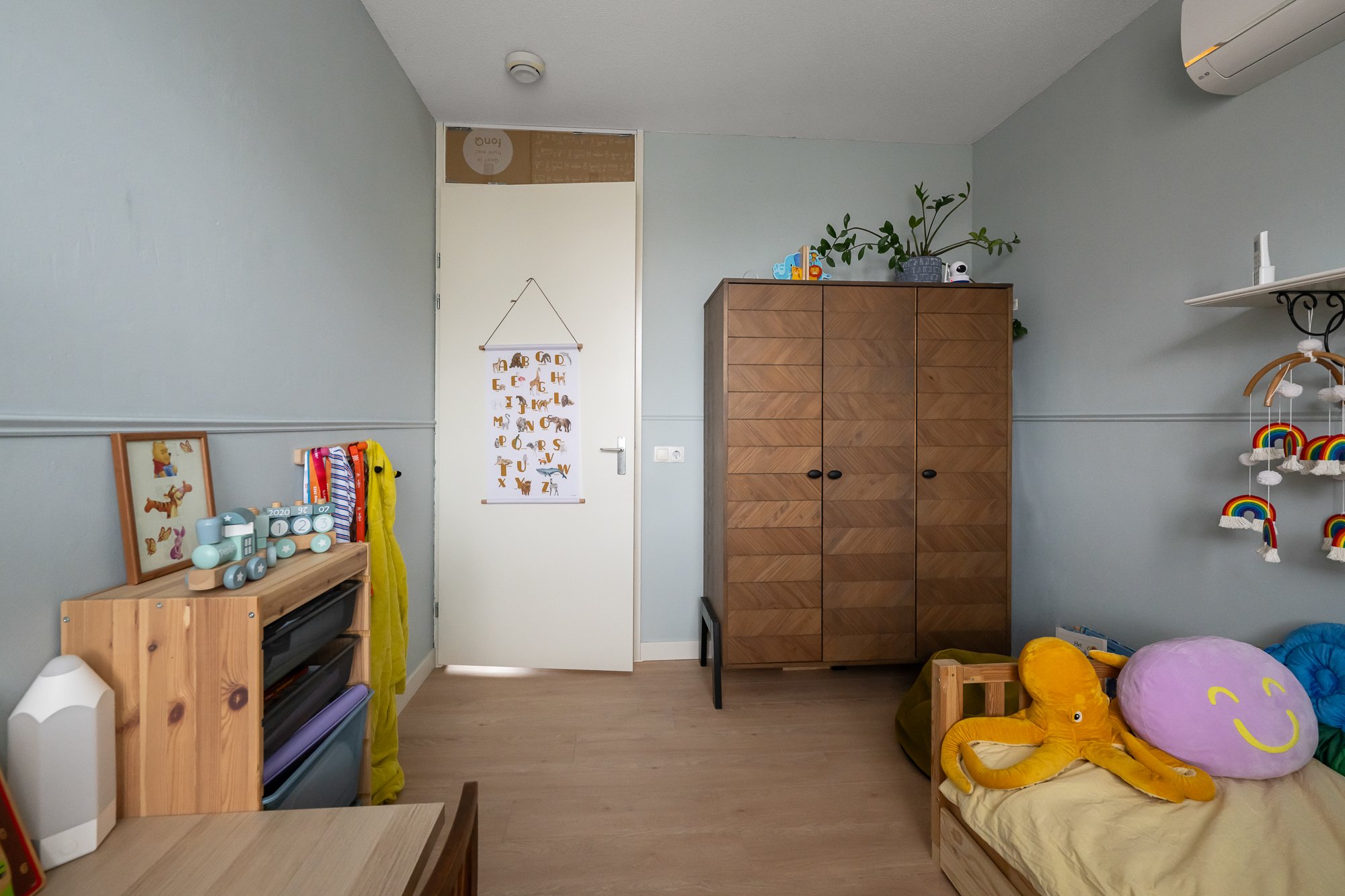 Via de ruime overloop zijn drie comfortabele slaapkamers bereikbaar. De hoofdslaapkamer en de kinderkamer zijn voorzien van airconditioning, wat zorgt voor een aangenaam binnenklimaat, ook op warme zomerdagen. Alle slaapkamers beschikken over rolluiken, waarvan één gedeeltelijk verduisterend is. De derde kamer wordt momenteel gebruikt als inloopkast, maar kan eenvoudig worden omgevormd tot een volwaardige slaapkamer of bijvoorbeeld een fijne werk- of hobbyruimte.