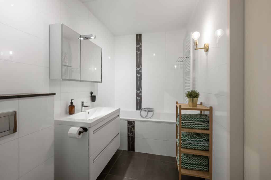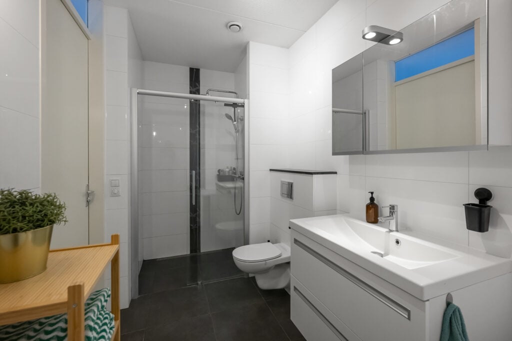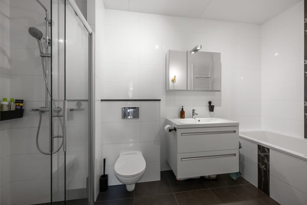 – moderne badkamer met ligbad, inloopdouche, toilet en wastafelmeubel;