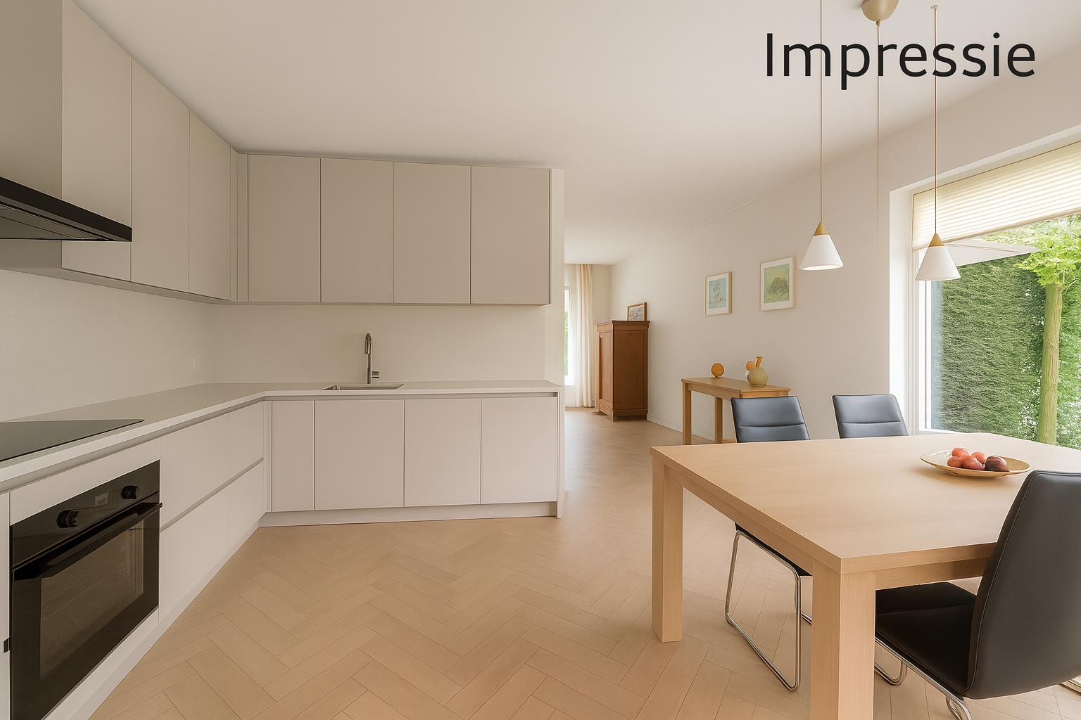 – woonkeuken in hoekopstelling met inbouwapparatuur en dubbele deuren naar de aangebouwde serre;
