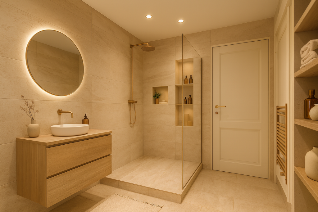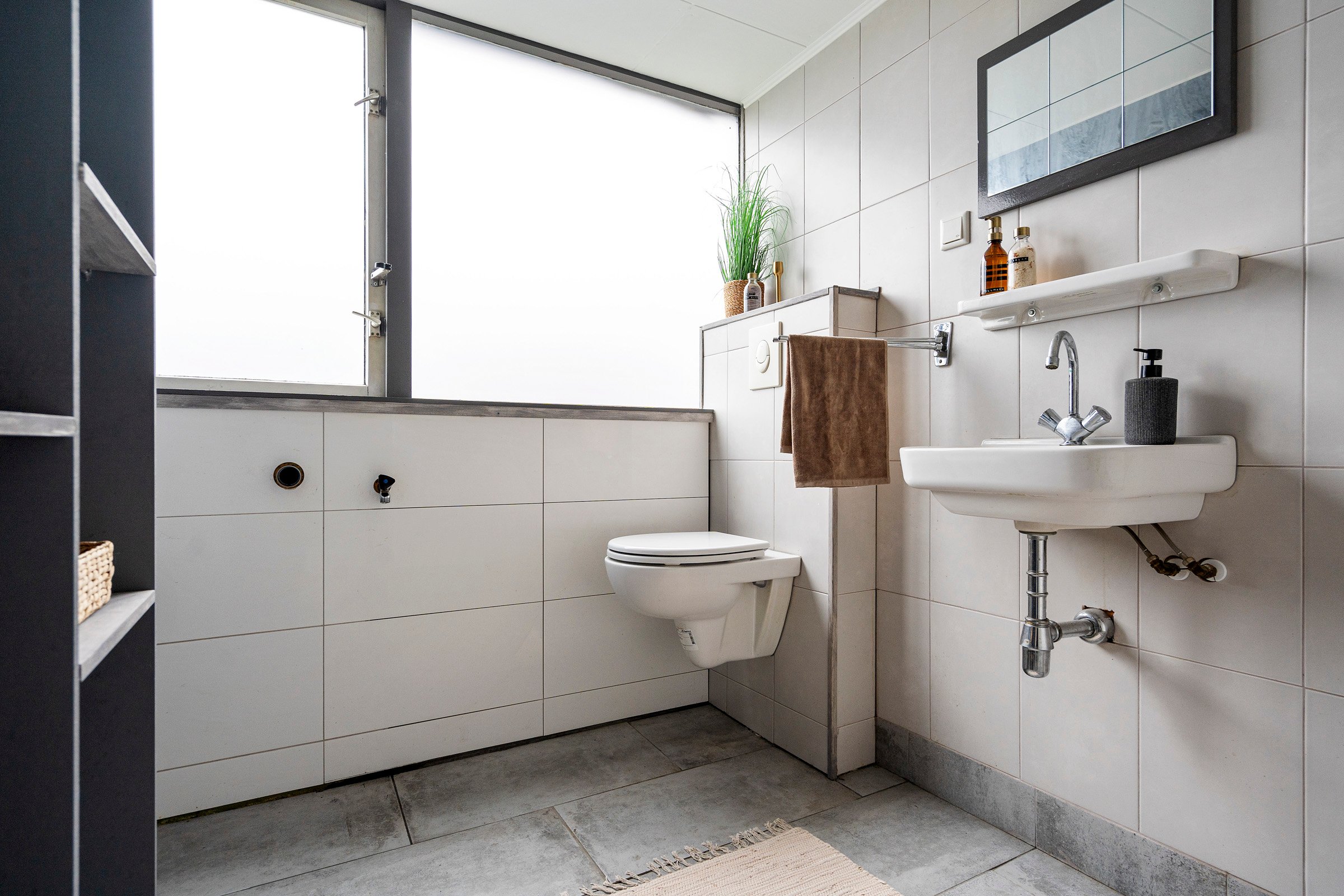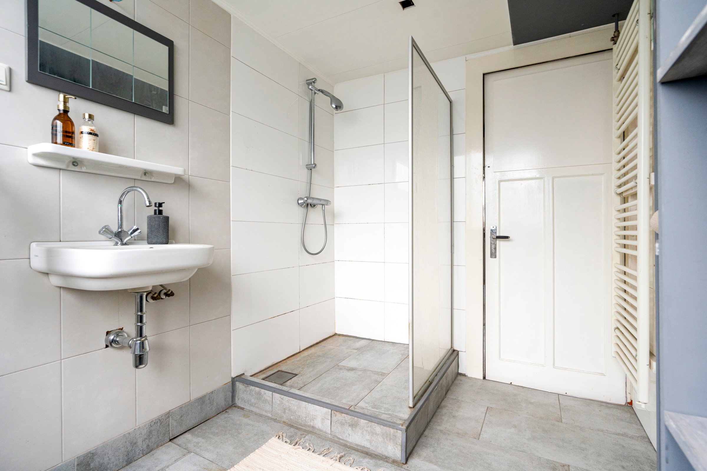 Overloop met toegang tot twee ruime slaapkamers en de badkamer. De badkamer is voorzien van een inloopdouche, wastafel, toilet en radiator.