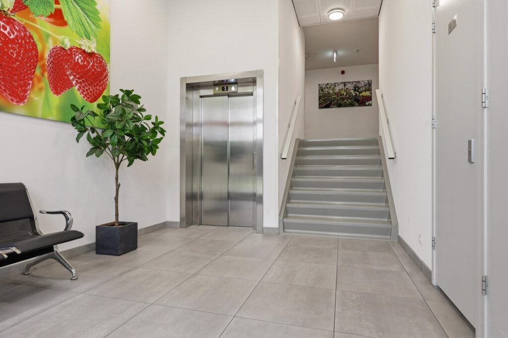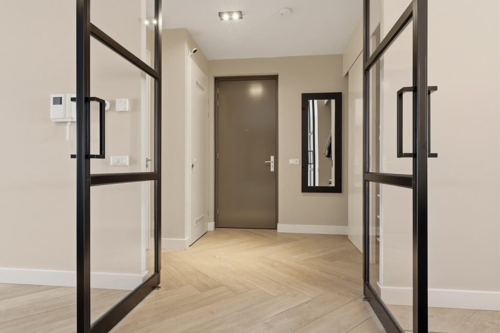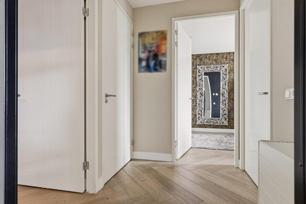 Via de nette centrale entree met liftinstallatie bereik je dit uitstekend onderhouden appartement. Bij binnenkomst valt direct de verzorgde afwerking op. De entree biedt toegang tot een modern toilet en een praktische bergruimte, waarna je doorloopt naar de royale living.
