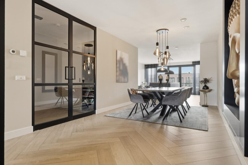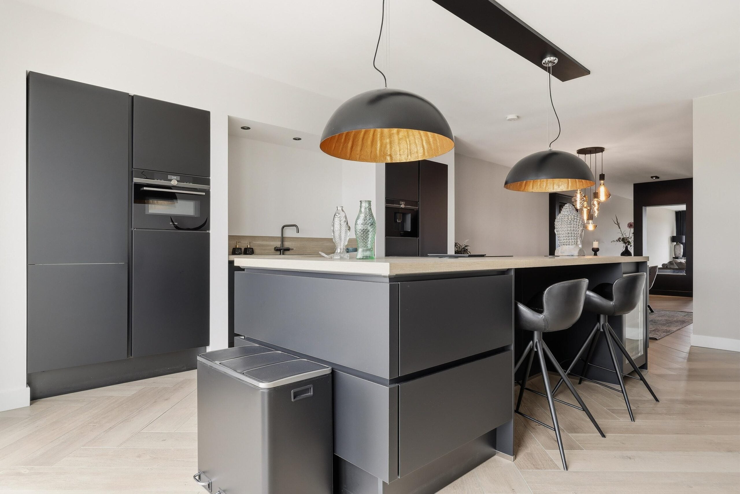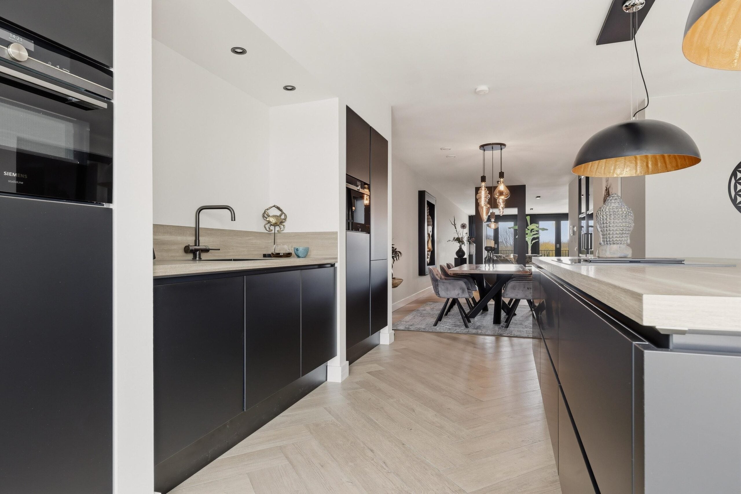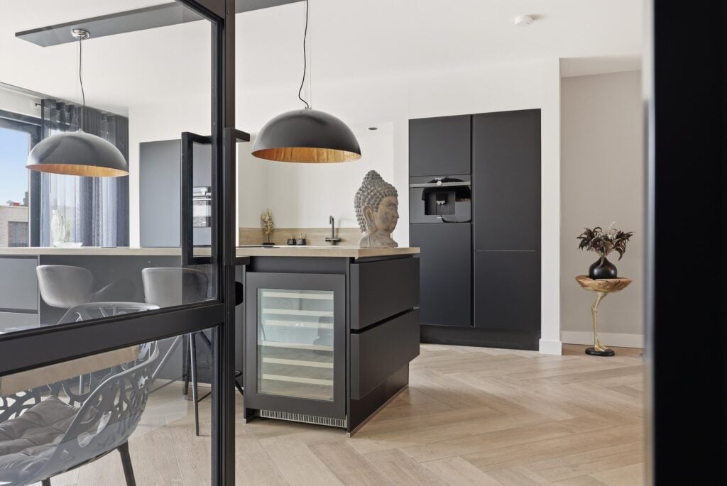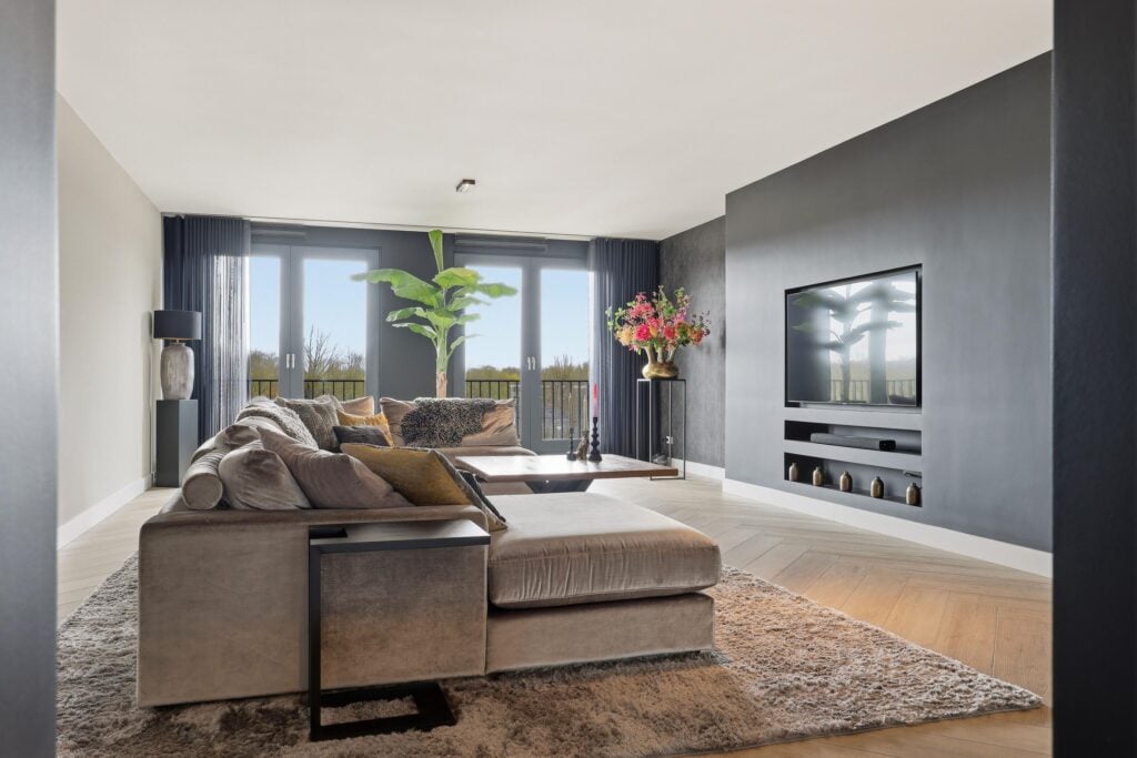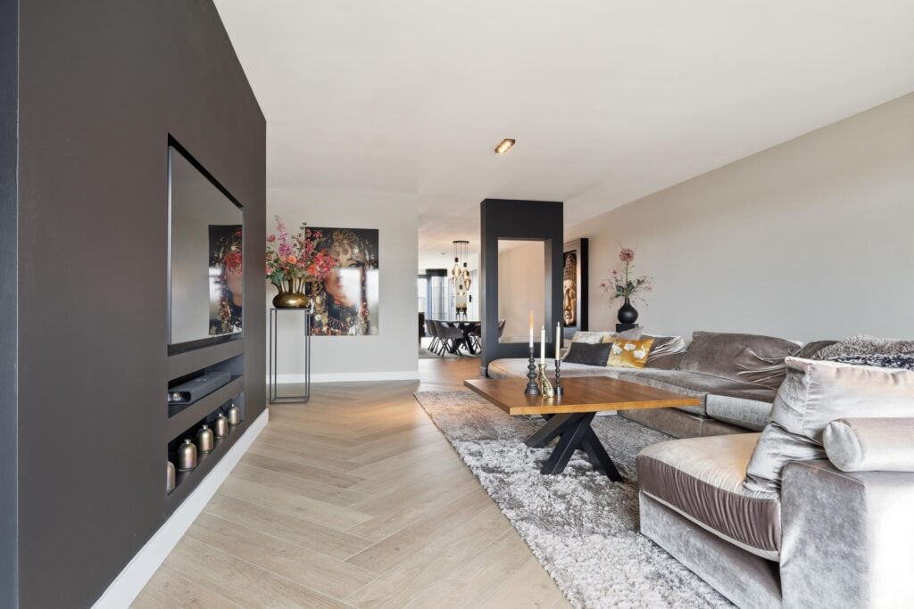 De woonkamer is bijzonder ruim opgezet en voorzien van grote raampartijen die zorgen voor een prachtige lichtinval en een vrij uitzicht. De strakke wandafwerking, stijlvolle cinewall en fraaie visgraatvloer geven het geheel een luxe en warme uitstraling. Aansluitend bevindt zich de open woonkeuken, die een echte eyecatcher is. Deze moderne keuken is uitgerust met een kookeiland, hoogwaardige inbouwapparatuur en veel werk- en bergruimte, perfect voor kookliefhebbers en gezellige diners.