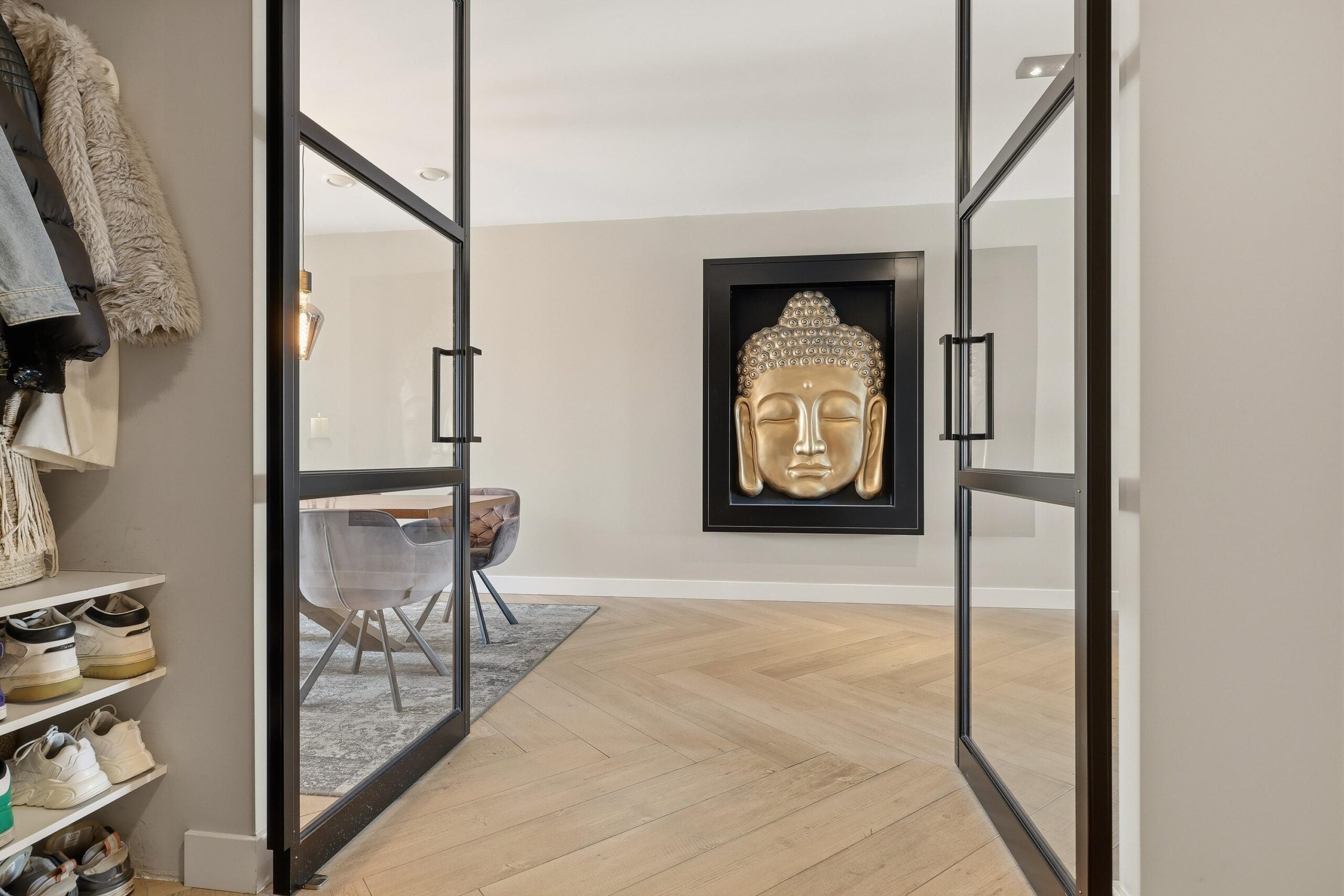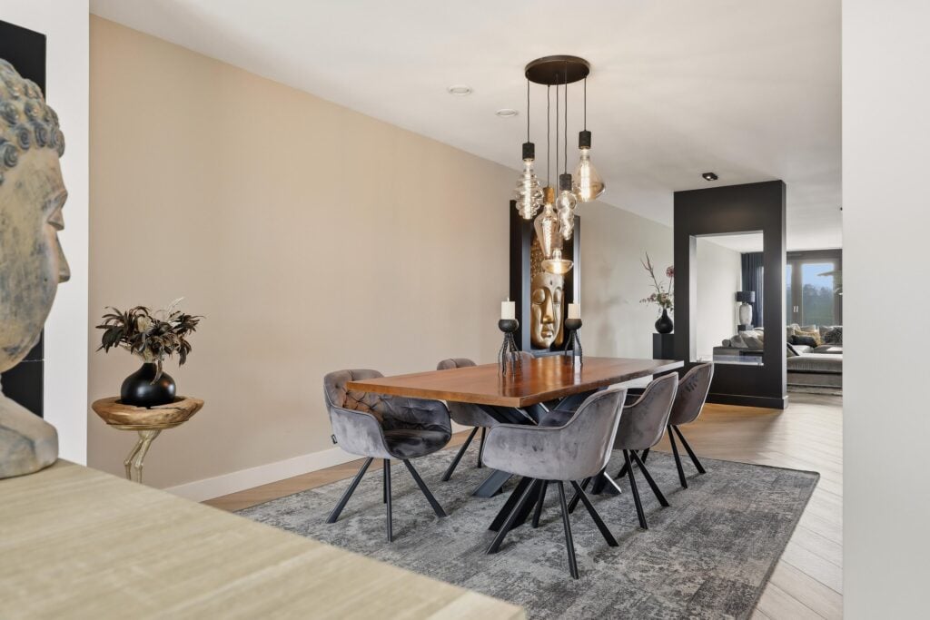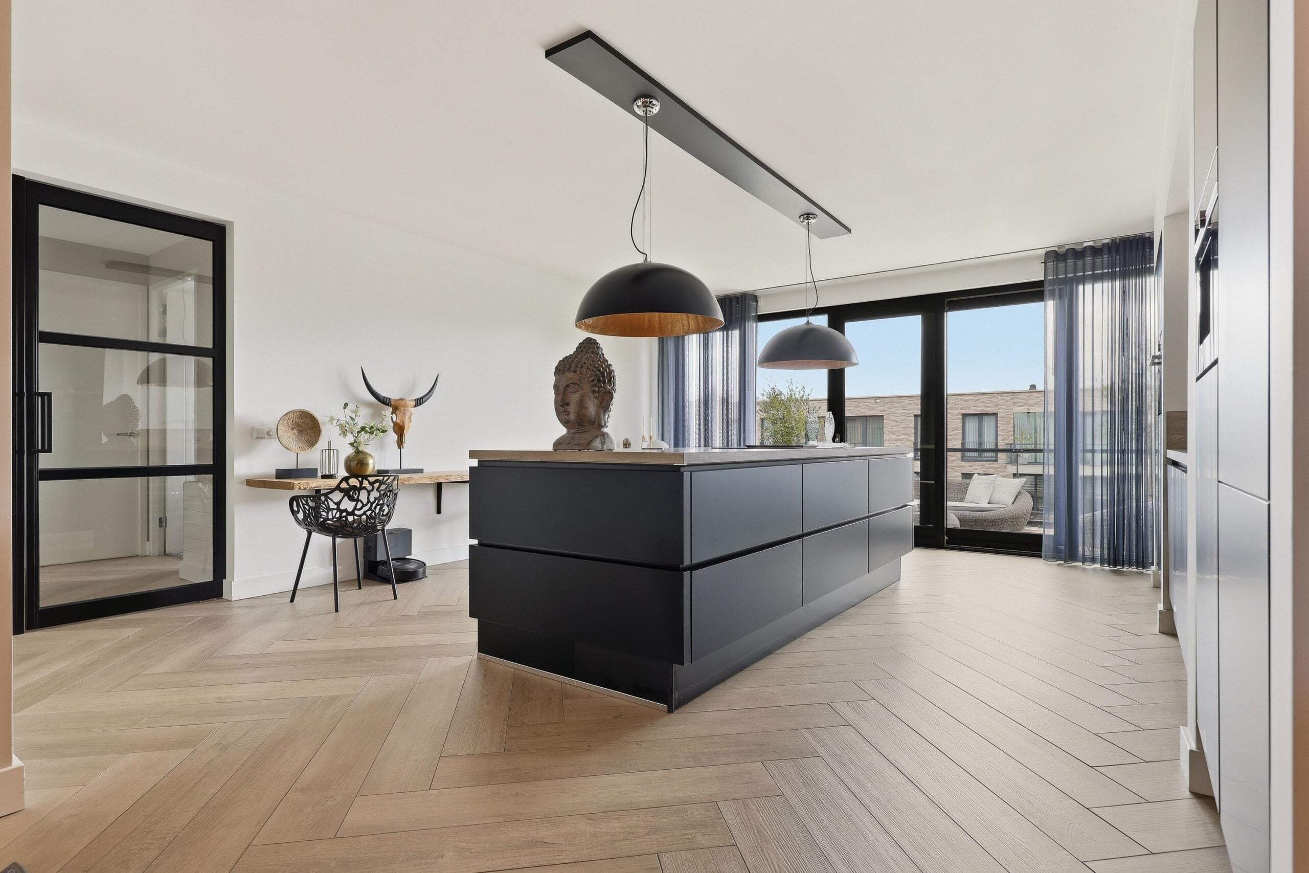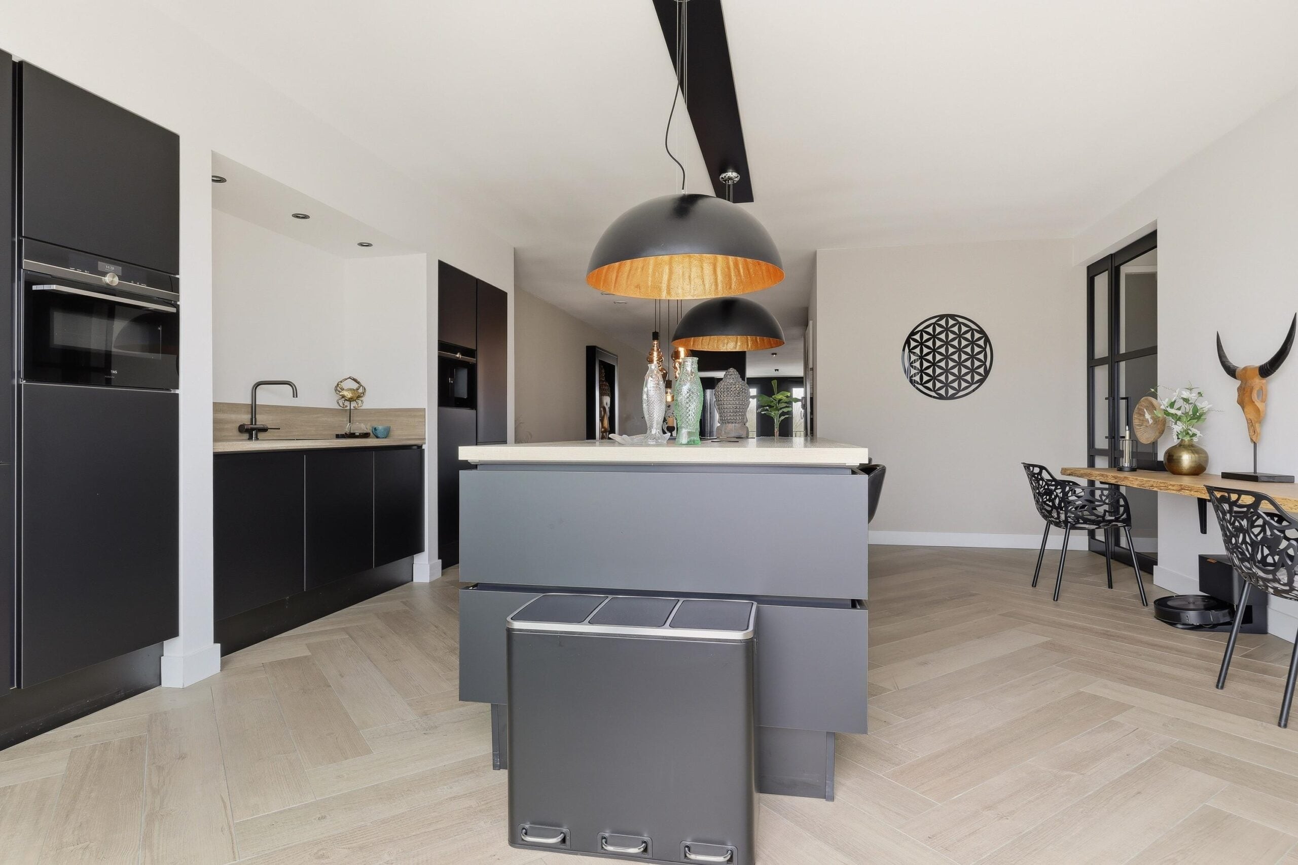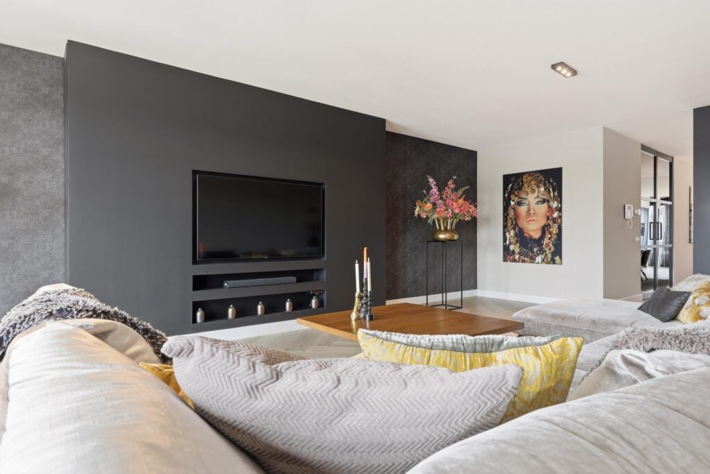 De woonkamer is bijzonder ruim opgezet en voorzien van grote raampartijen die zorgen voor een prachtige lichtinval en een vrij uitzicht. De strakke wandafwerking, stijlvolle cinewall en fraaie visgraatvloer geven het geheel een luxe en warme uitstraling. Aansluitend bevindt zich de open woonkeuken, die een echte eyecatcher is. Deze moderne keuken is uitgerust met een kookeiland, hoogwaardige inbouwapparatuur en veel werk- en bergruimte, perfect voor kookliefhebbers en gezellige diners.