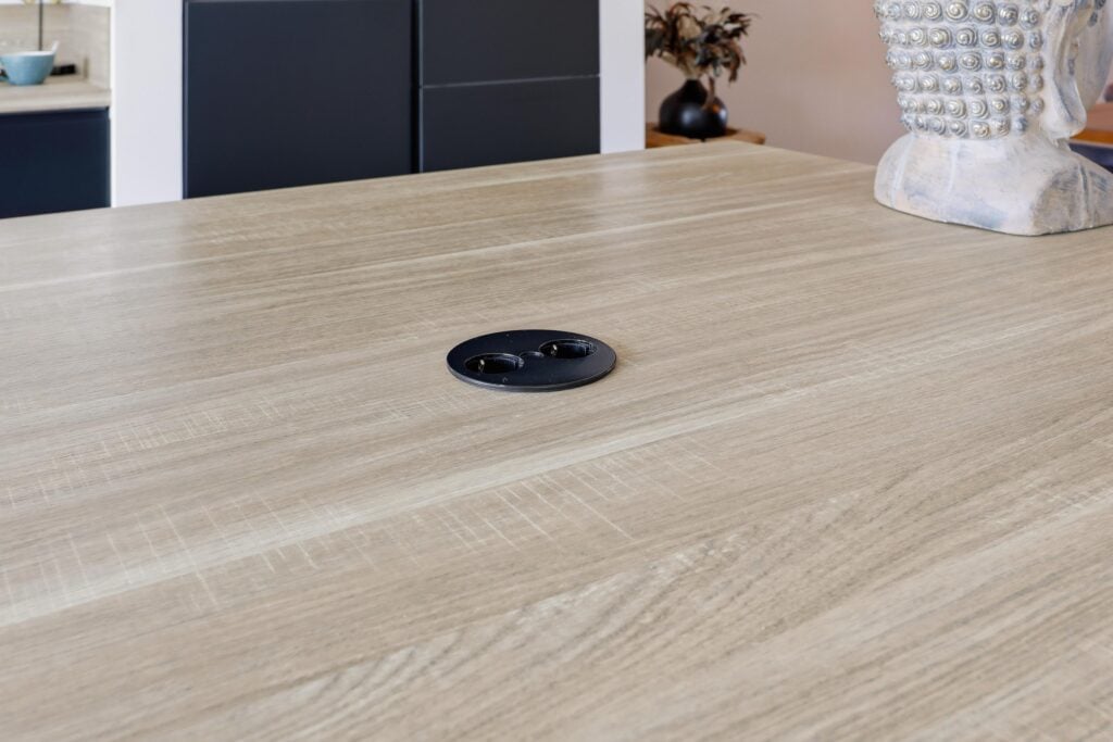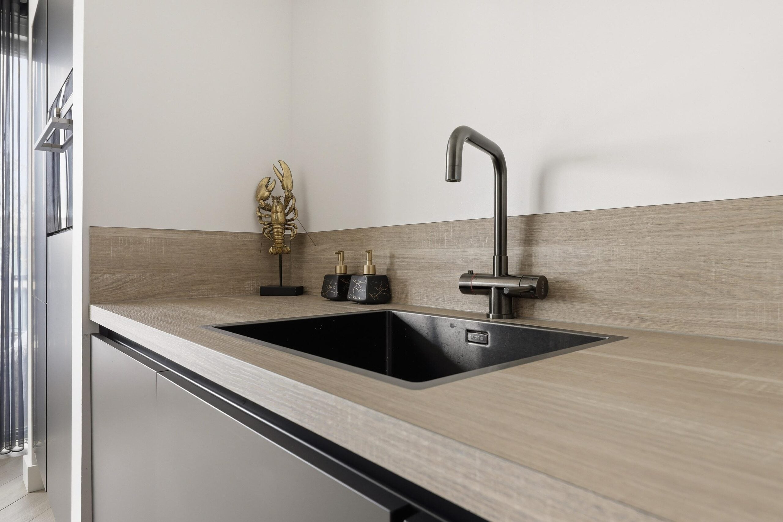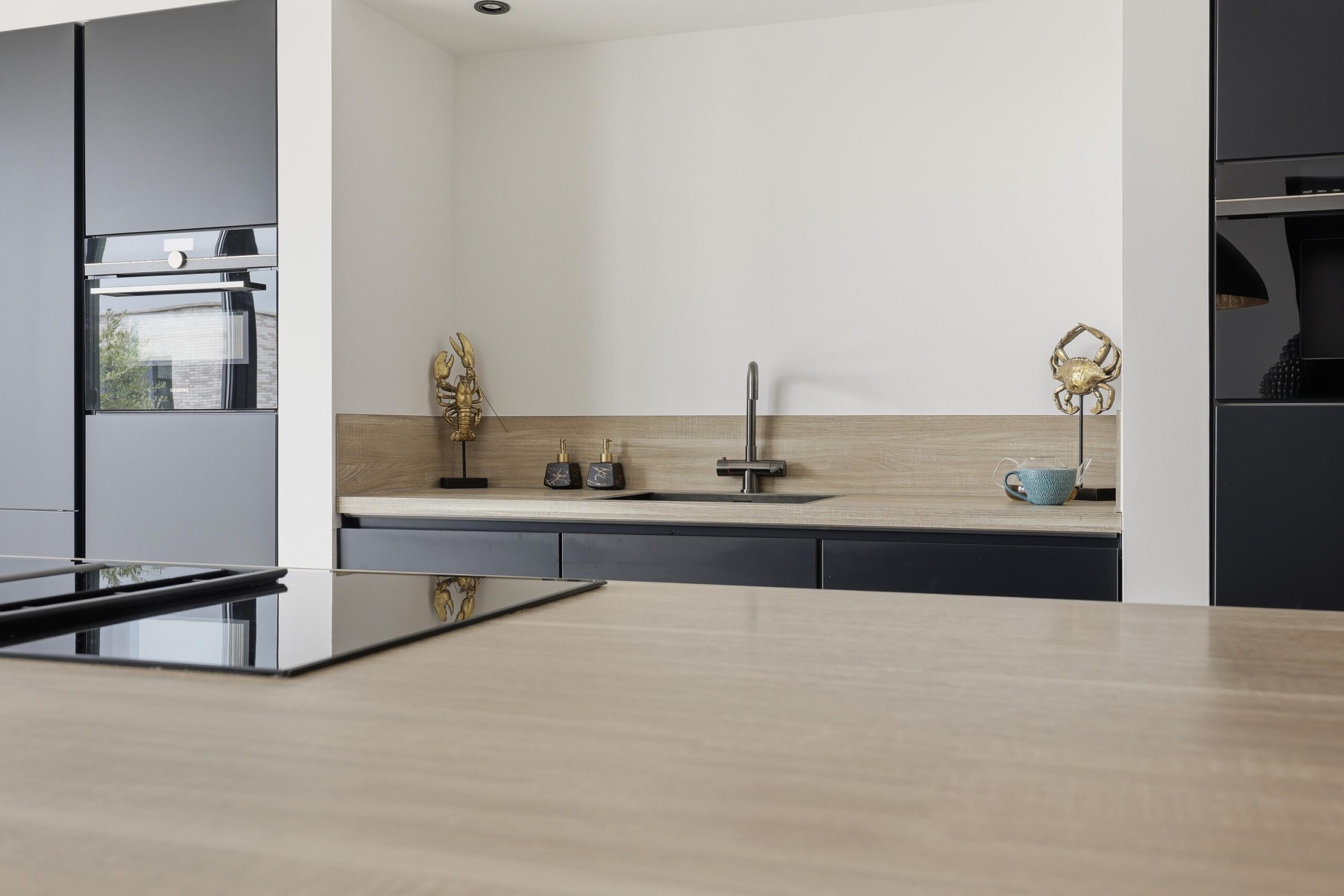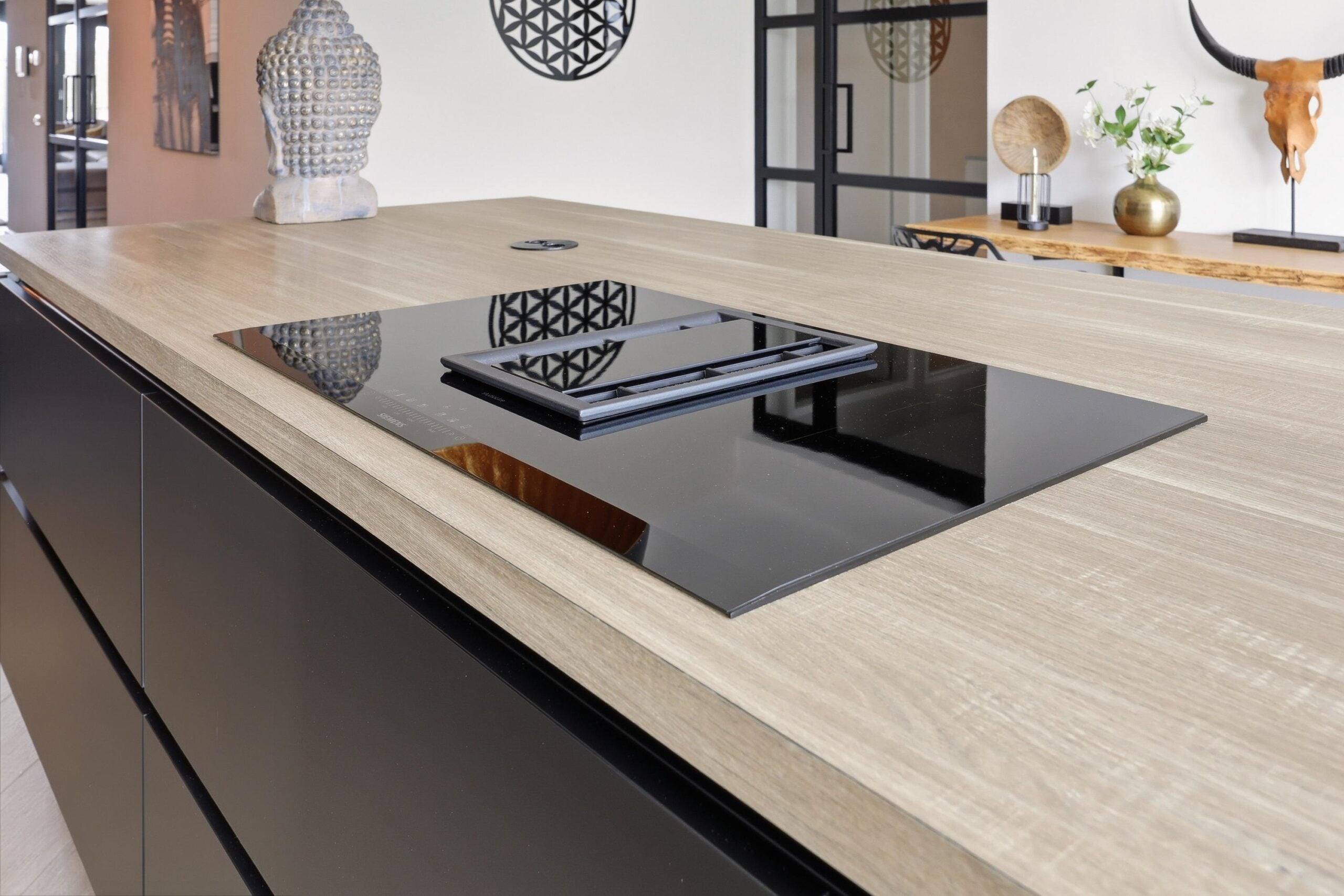 – luxe woonkeuken met kookeiland en inbouwapparatuur;