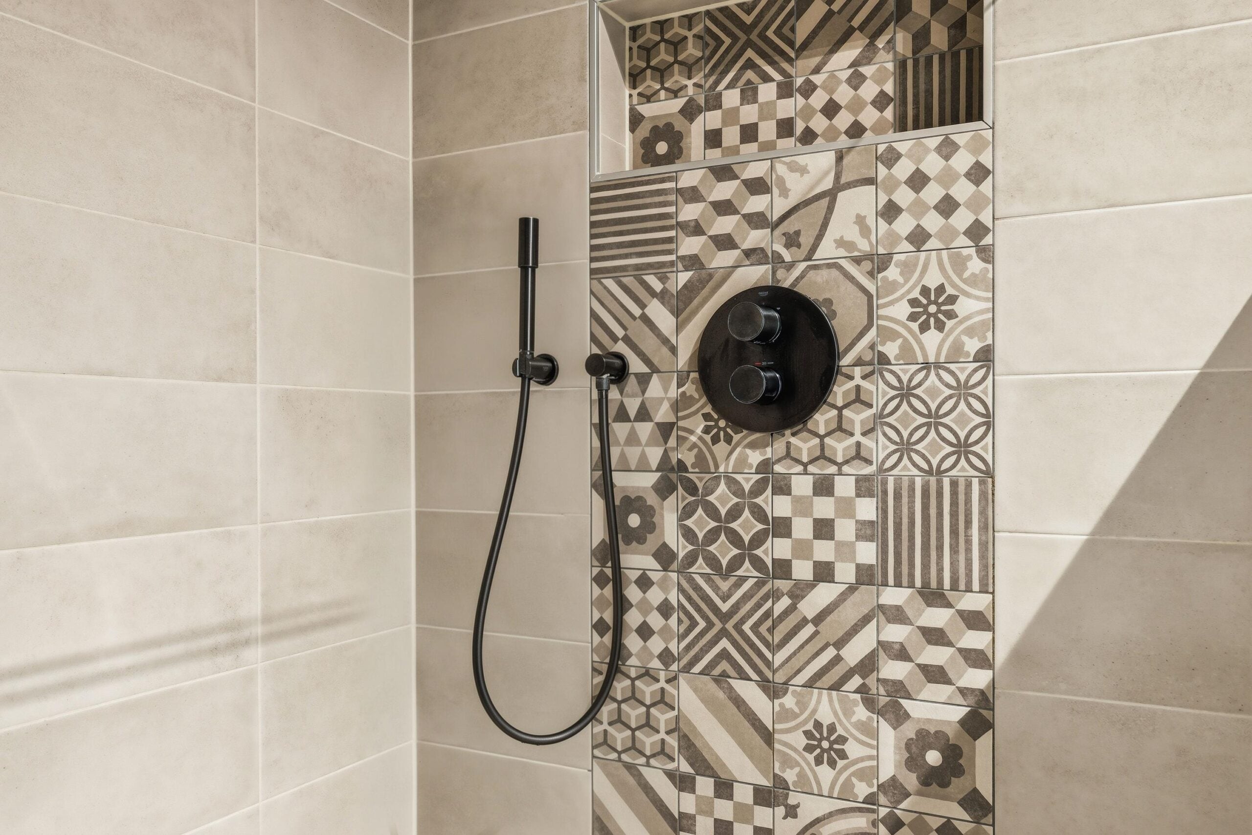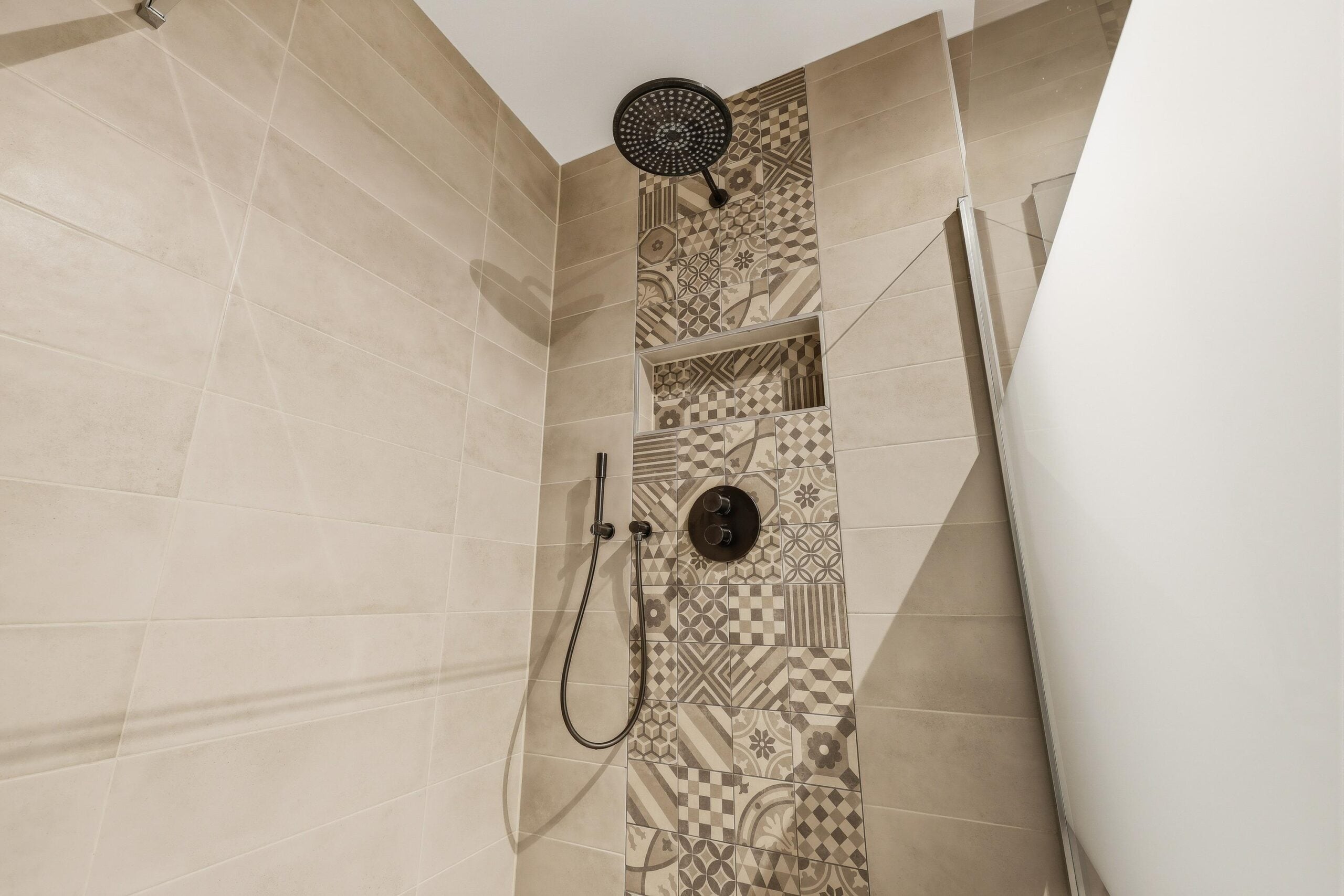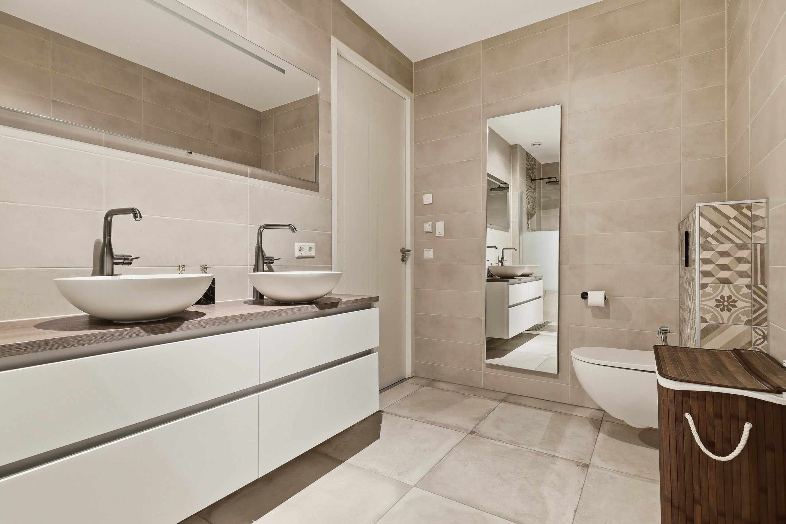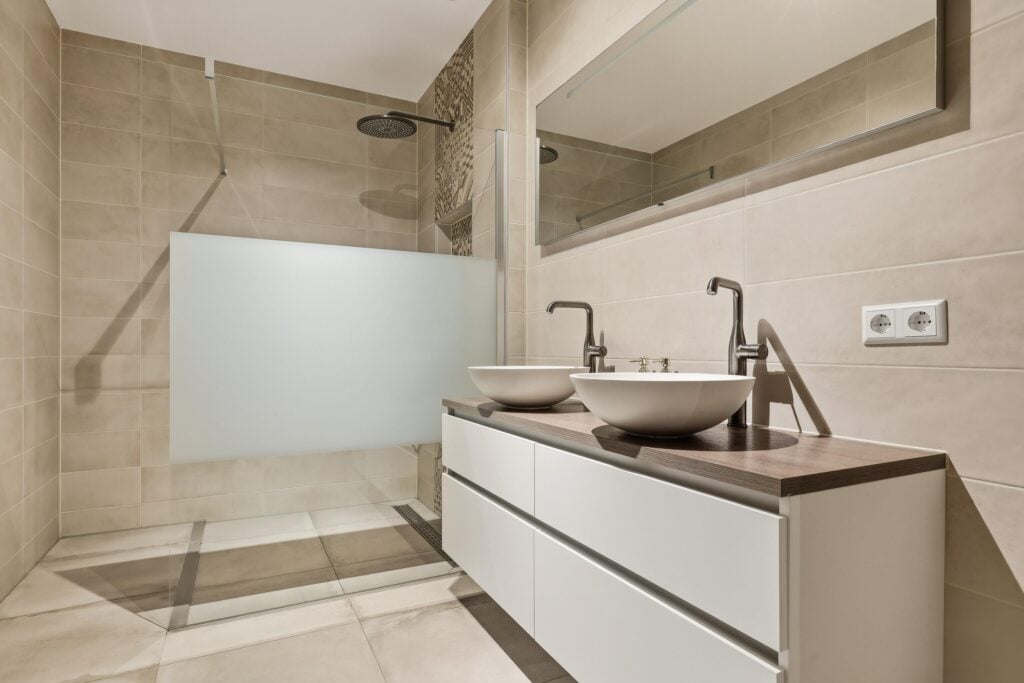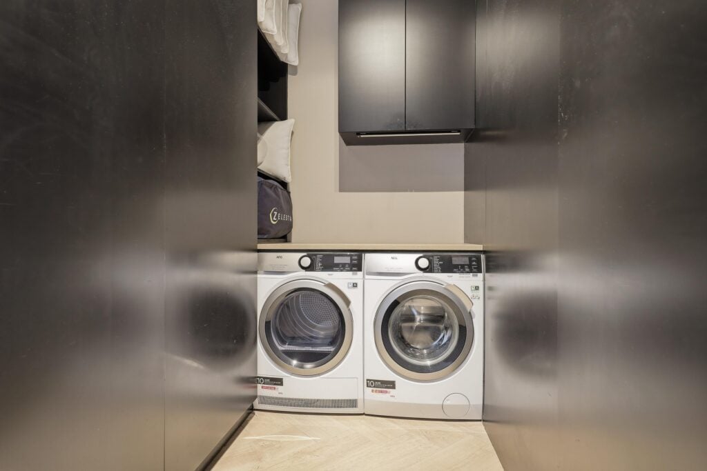 De badkamer is modern en luxe uitgevoerd met een ruime inloopdouche, dubbele wastafel en hoogwaardige materialen. Daarnaast is er een separate ruimte voor de wasmachine en droger, wat zorgt voor extra praktisch gemak.