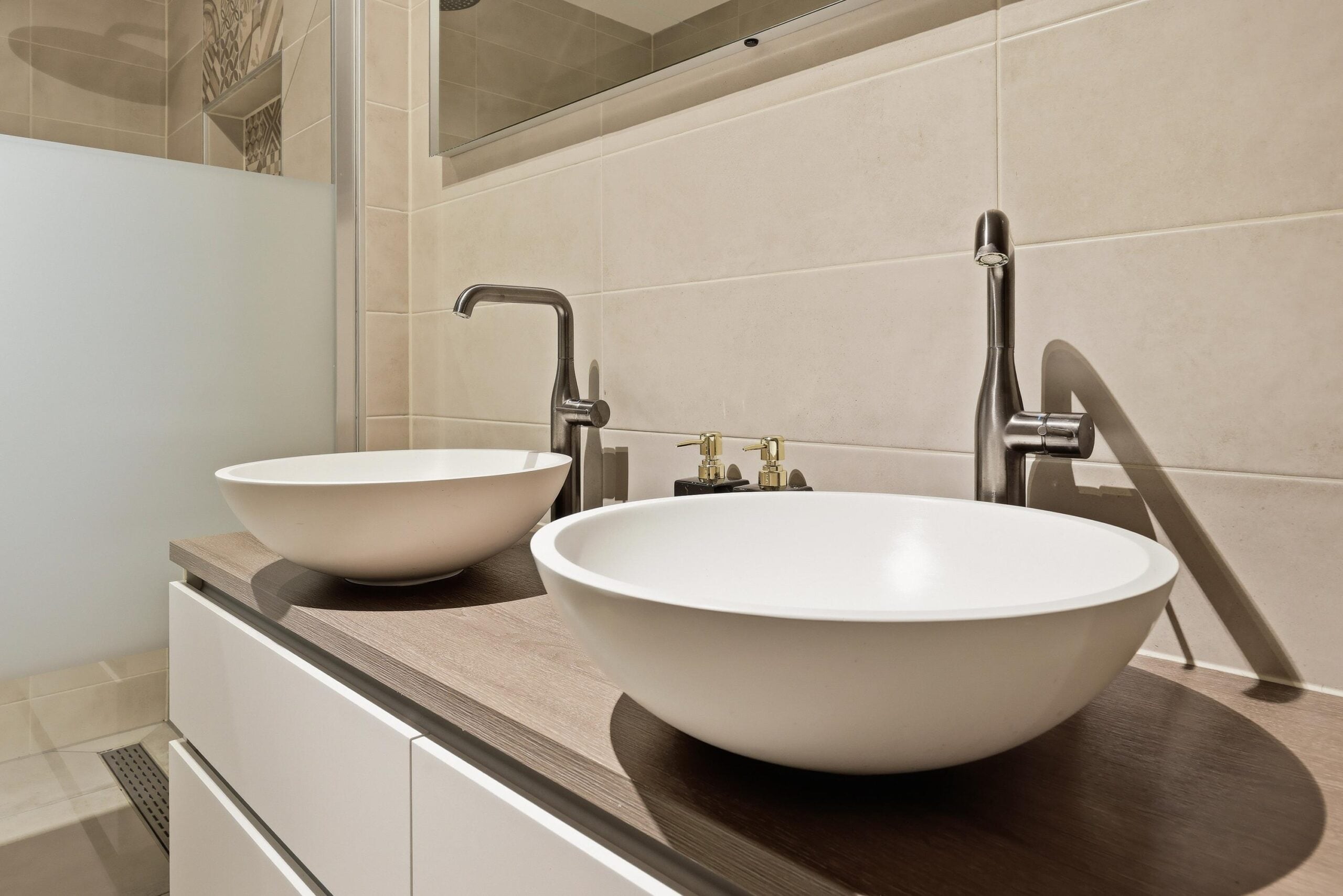 – moderne badkamer met grote inloopdouche, dubbel wastafelmeubel en 2e toilet;