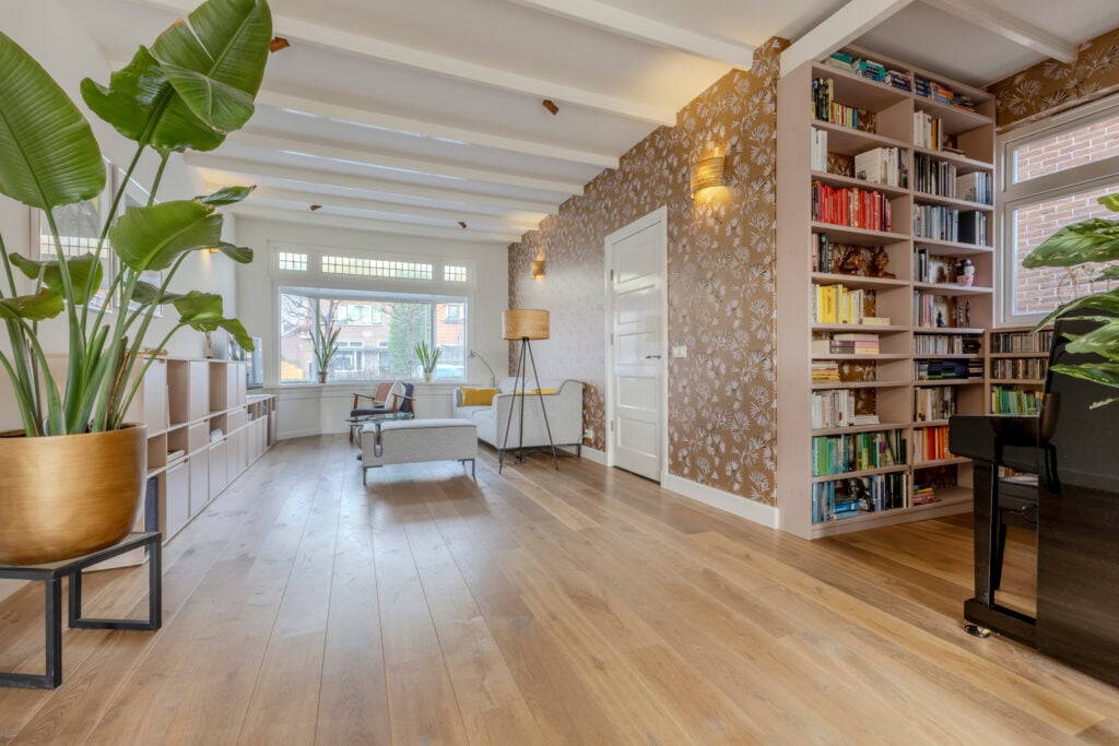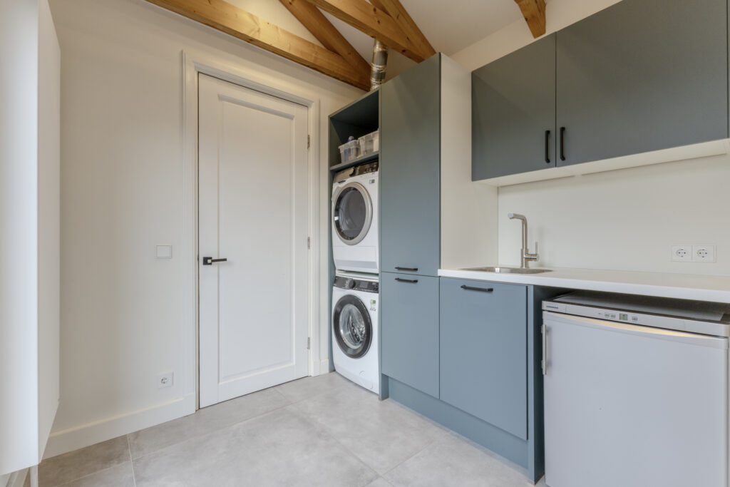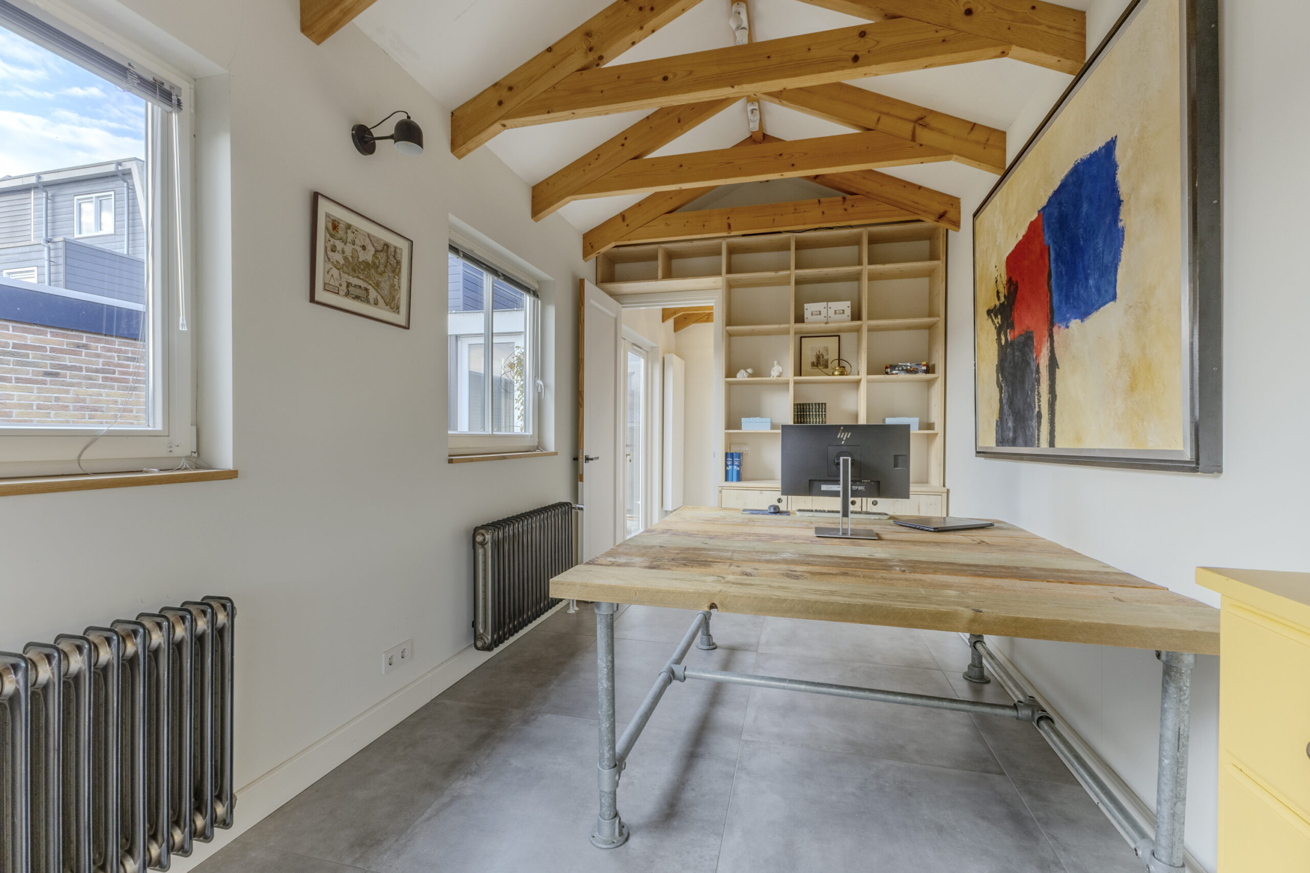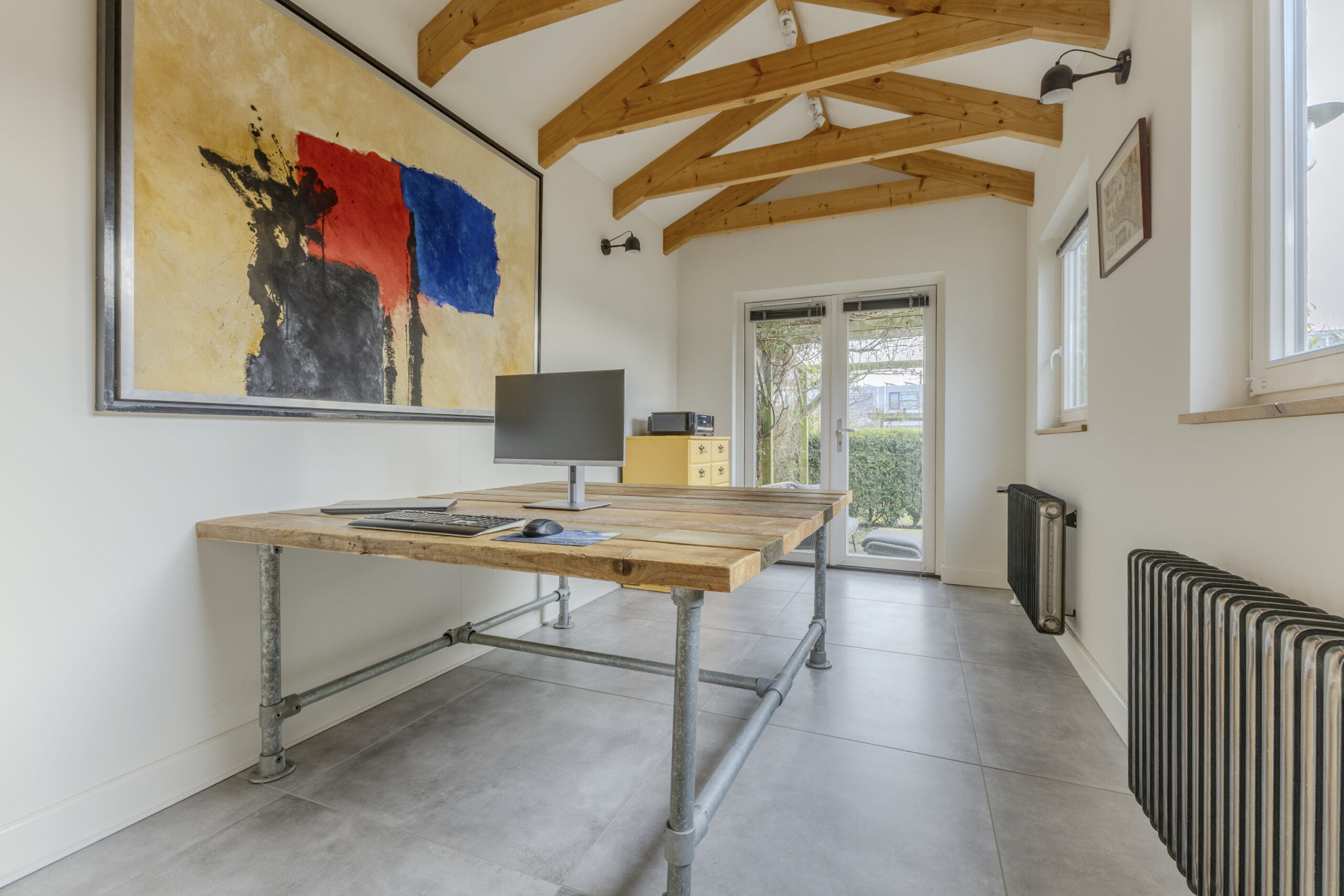Aansluitend bevindt zich de bijkeuken met extra opbergruimte en aansluitingen voor de wasapparatuur. Daarnaast is er een aparte werkkamer, ideaal voor thuiswerken, studeren of het uitoefenen van een hobby. Deze kamer wordt momenteel gebruikt als werkkamer, maar kan ook uitstekend dienstdoen als slaapkamer op de begane grond. Vanuit deze ruimtes loop je direct de tuin in, waardoor binnen en buiten op een vanzelfsprekende manier in elkaar overlopen. Door de hele woning liggen fraaie houten vloeren, gecombineerd met luxe XXL-tegels, wat zorgt voor een rustige en hoogwaardige uitstraling.