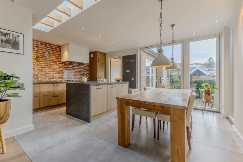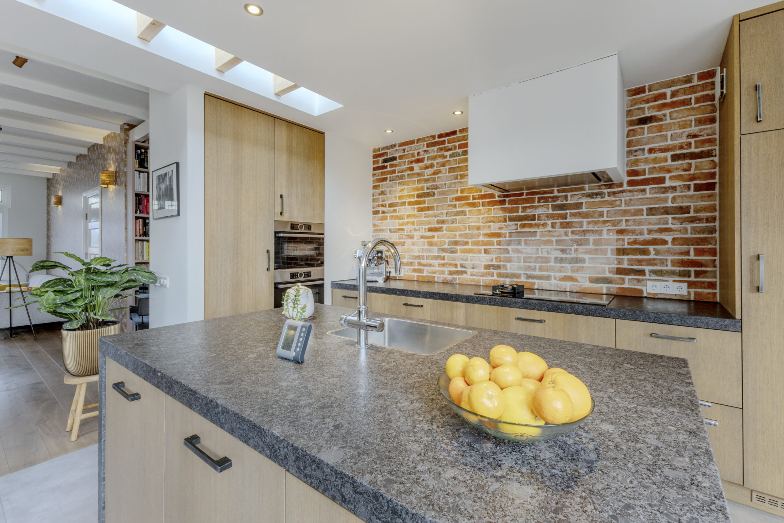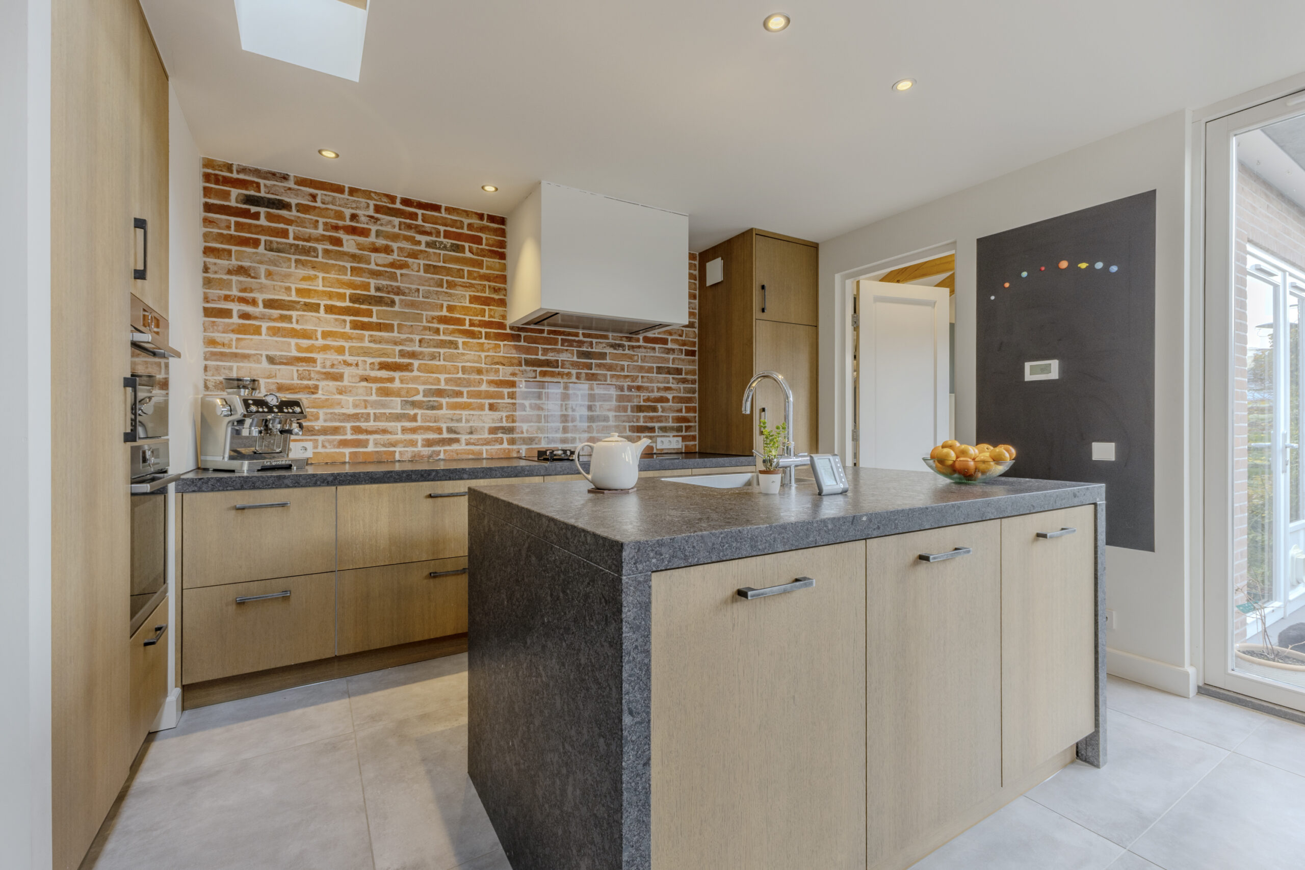 Aan de achterzijde ligt de moderne leefkeuken, gerealiseerd in de aanbouw uit 2017. Deze vormt een natuurlijk verlengstuk van de woonkamer en is ingericht met luxe inbouwapparatuur, waaronder een combimagnetron, een oven met stoomfunctie en een kokendwaterkraan van Grohe. Er is volop werk- en bergruimte en dankzij de openslaande deuren en het zicht op de tuin ontstaat hier een prettige verbinding tussen binnen en buiten. De vloerverwarming op de gehele begane grond, in combinatie met oversized radiatoren, zorgt voor een gelijkmatige en comfortabele warmte en maakt verwarming op lage temperatuur mogelijk.