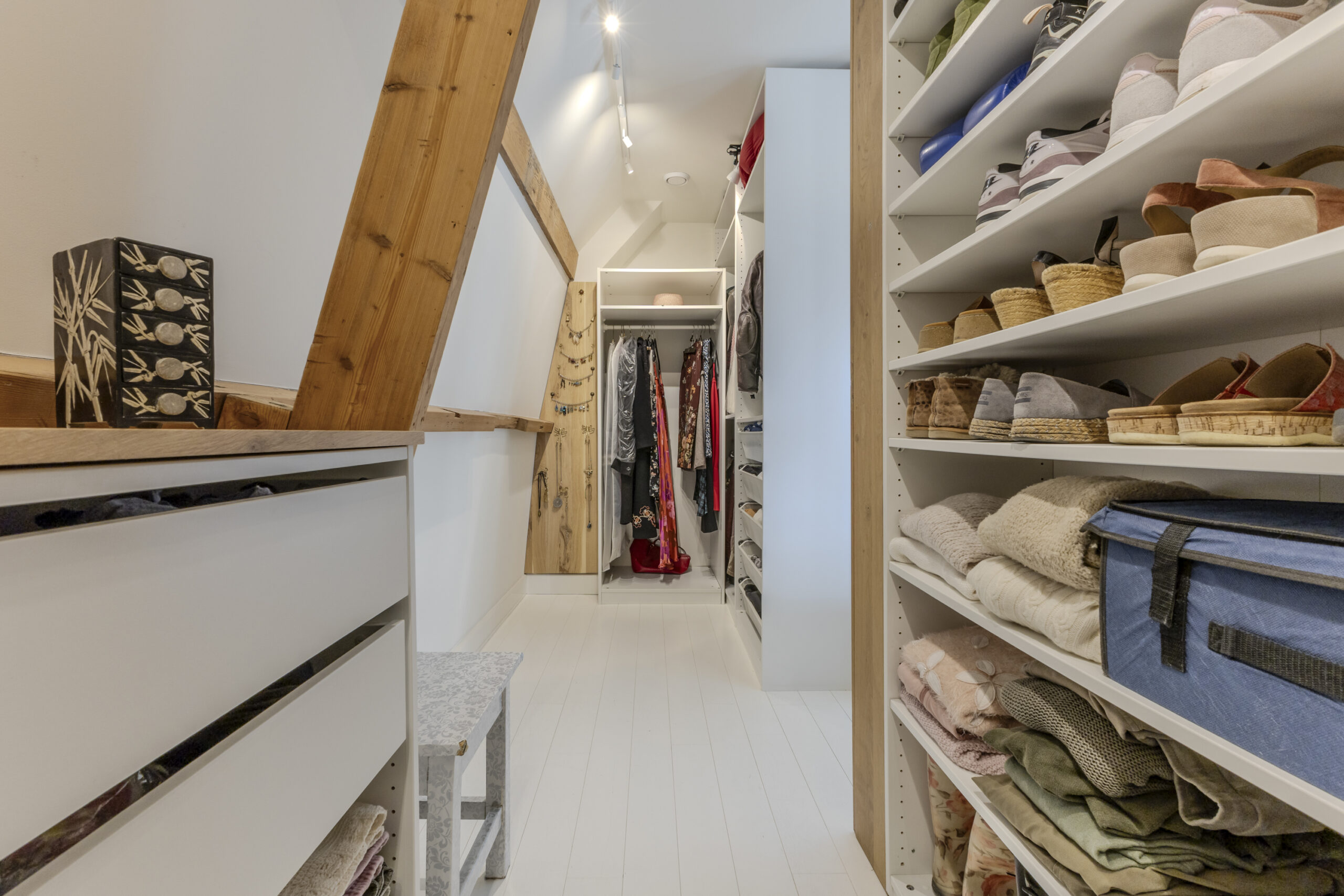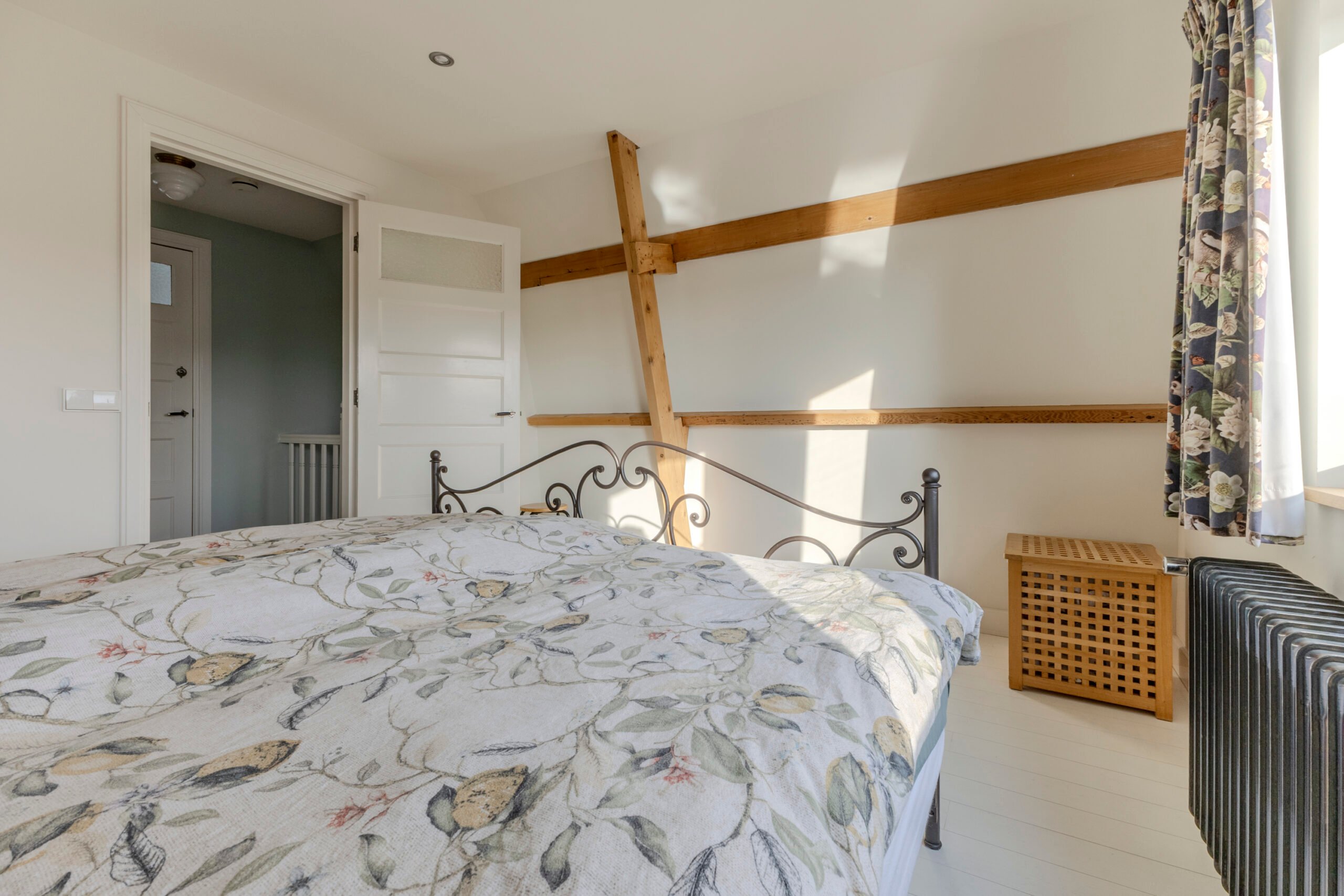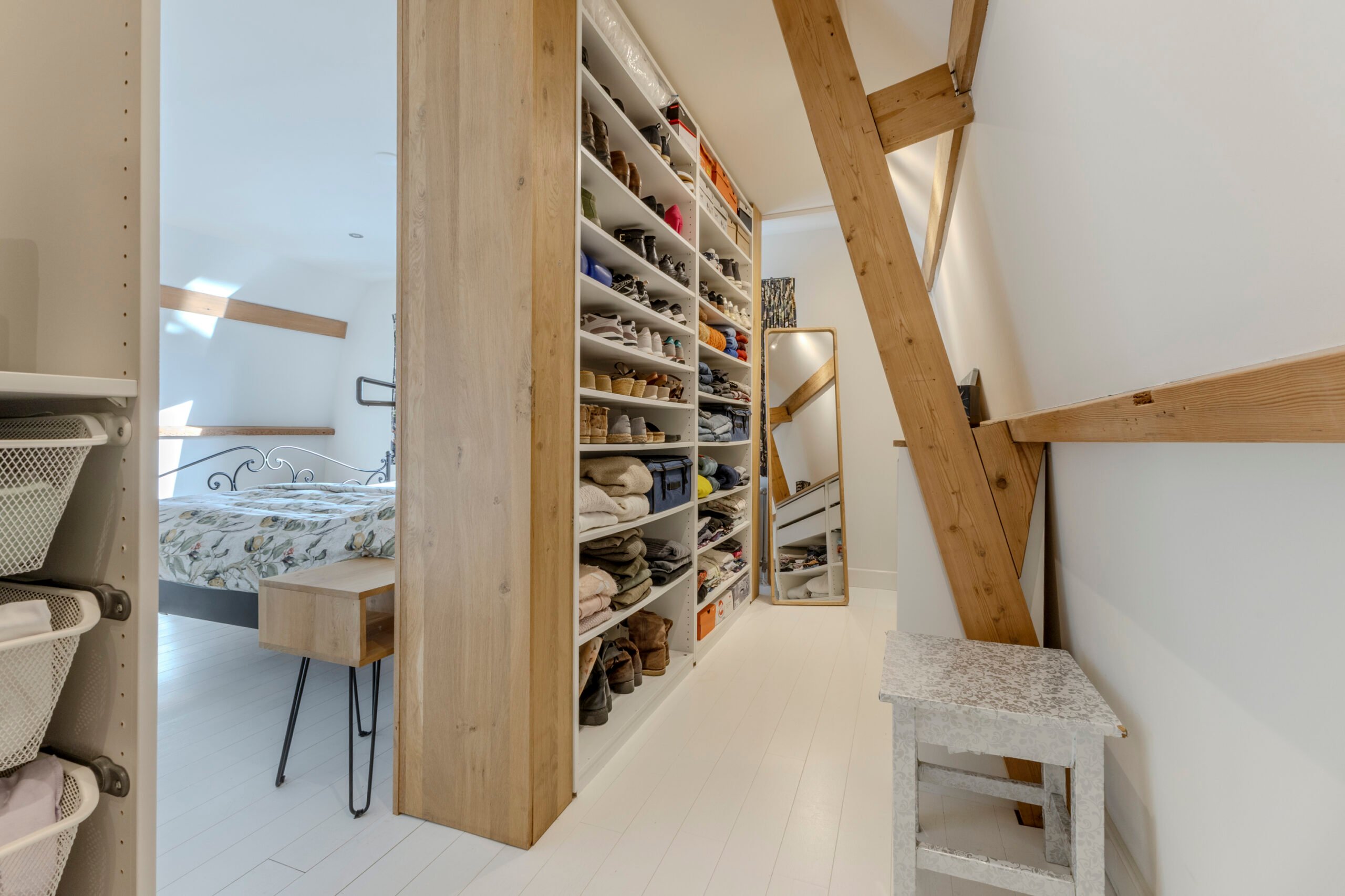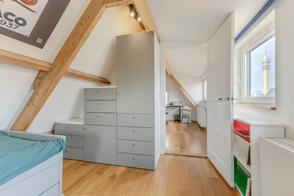 Via een vaste trap bereik je de zolderverdieping met dakkapel. Hier is een volwaardige slaapkamer gerealiseerd en daarnaast is deze verdieping flexibel te gebruiken, bijvoorbeeld als werkruimte of logeerkamer. Ook is er voldoende bergruimte voor seizoensspullen en andere zaken die je netjes uit het zicht wilt houden.