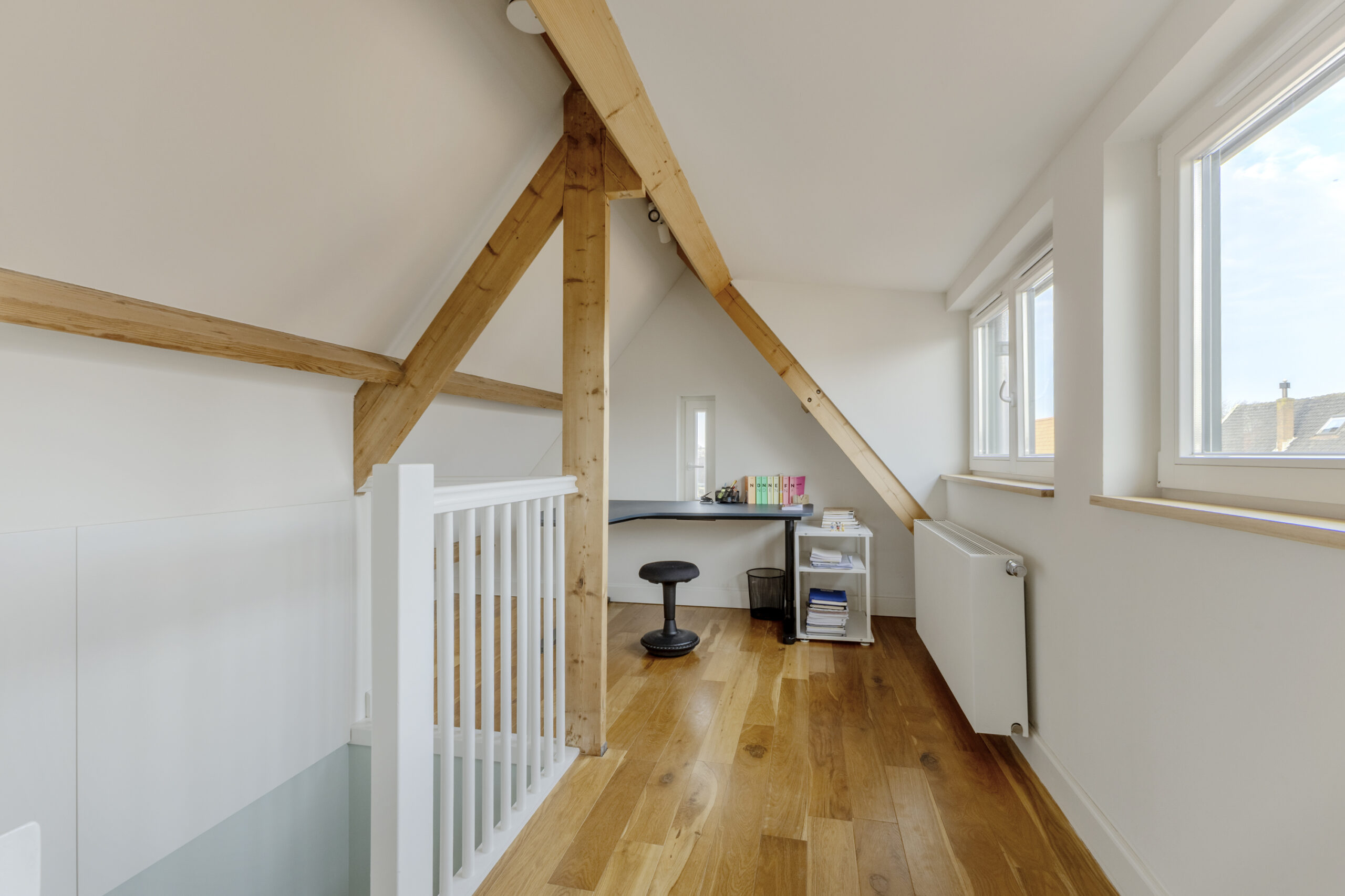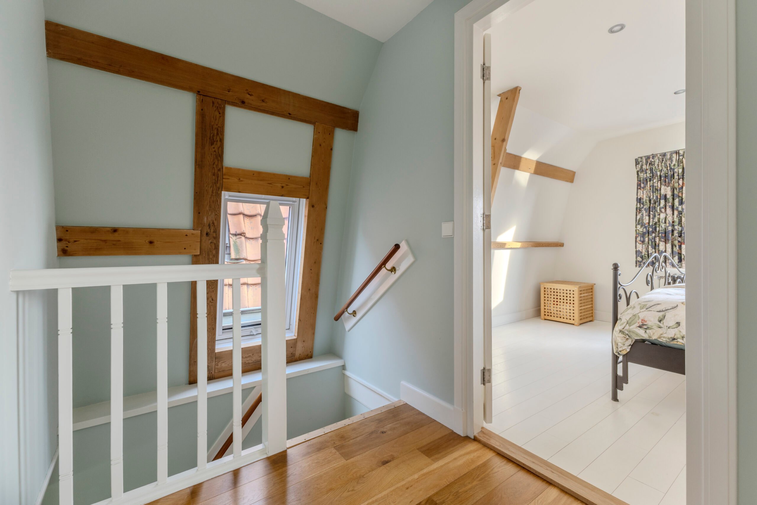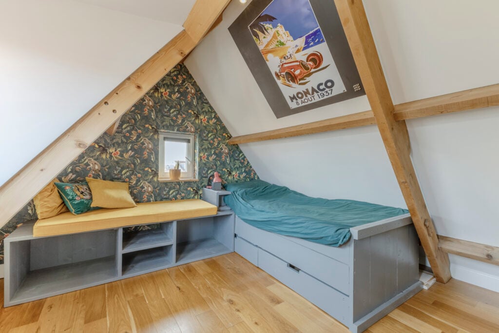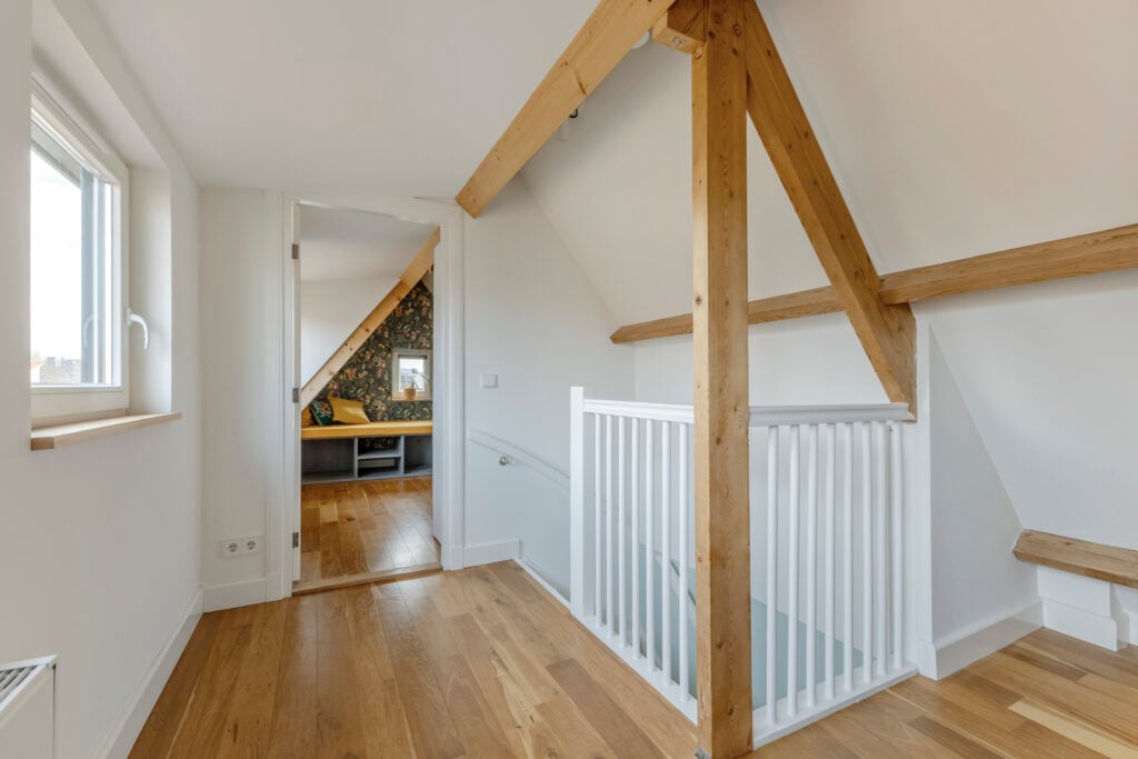 Via een vaste trap bereik je de zolderverdieping met dakkapel. Hier is een volwaardige slaapkamer gerealiseerd en daarnaast is deze verdieping flexibel te gebruiken, bijvoorbeeld als werkruimte of logeerkamer. Ook is er voldoende bergruimte voor seizoensspullen en andere zaken die je netjes uit het zicht wilt houden.