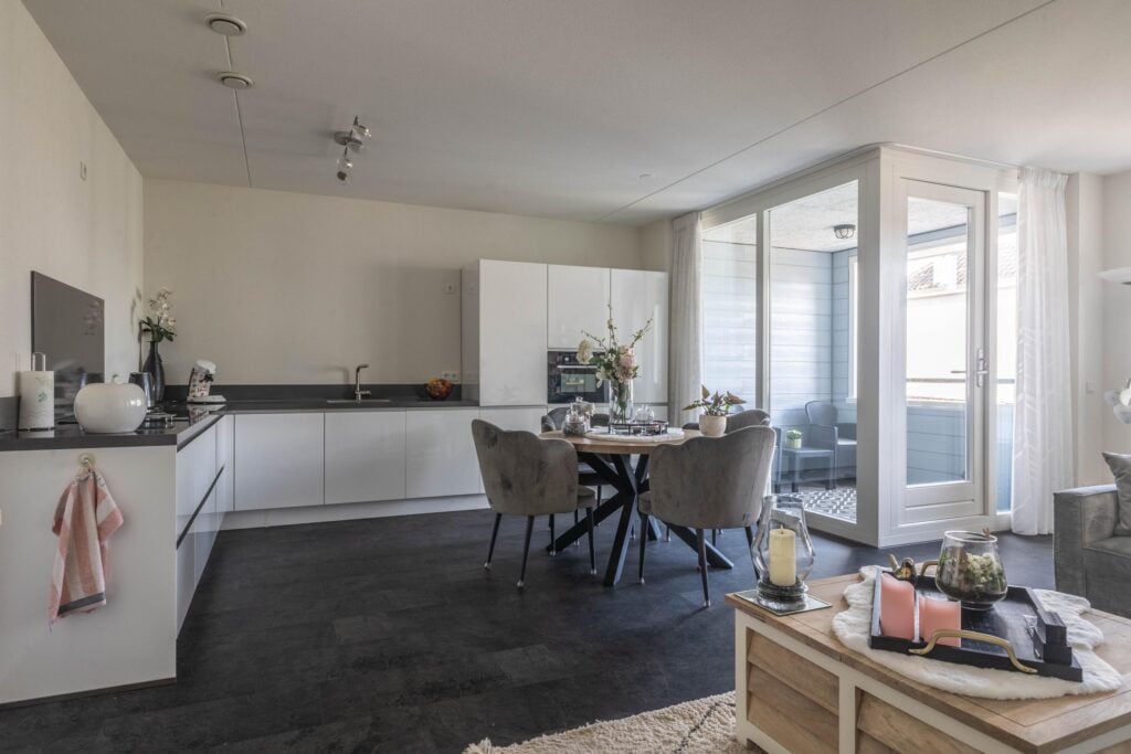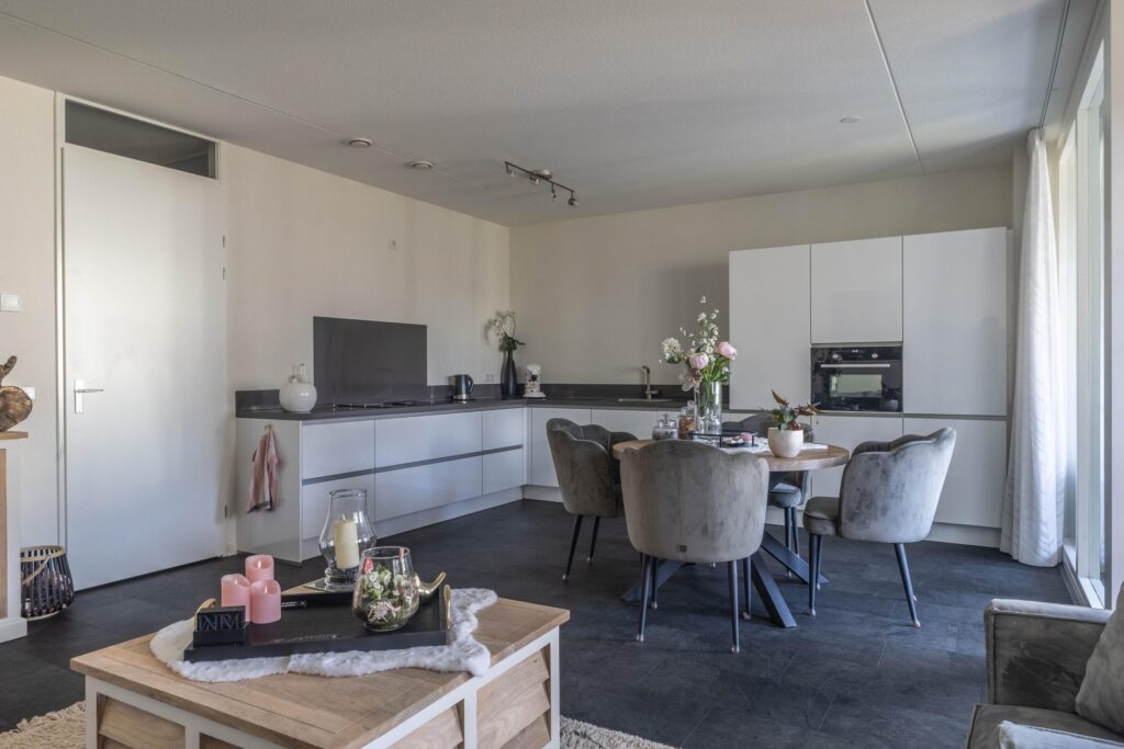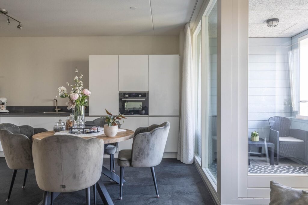 De woonkamer is het hart van de woning: licht, ruim en sfeervol dankzij de grote ramen en strakke afwerking. De open keuken sluit hier naadloos op aan en biedt voldoende ruimte voor een eettafel. Dankzij de vloerverwarming, de warmtepomp en de uitstekende isolatie is het hier het hele jaar door comfortabel, én energiezuinig. Bovendien kan de warmtepomp in de zomer ook koelen, voor extra wooncomfort.