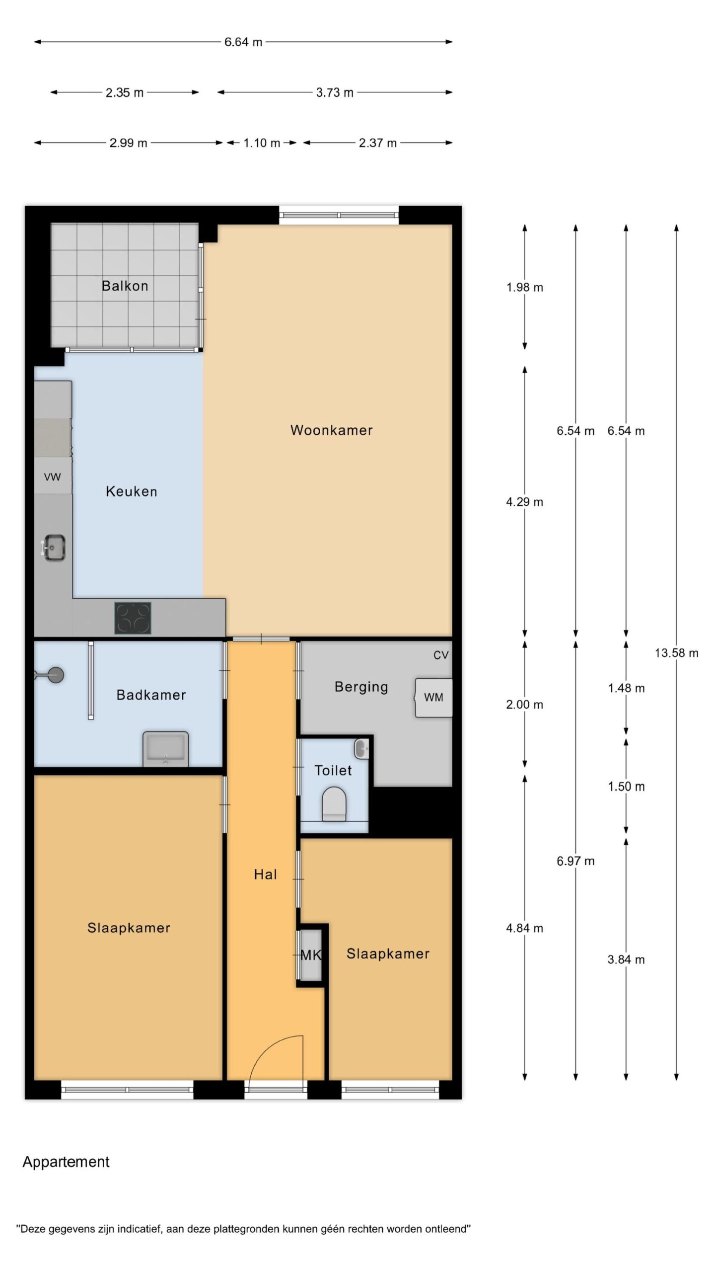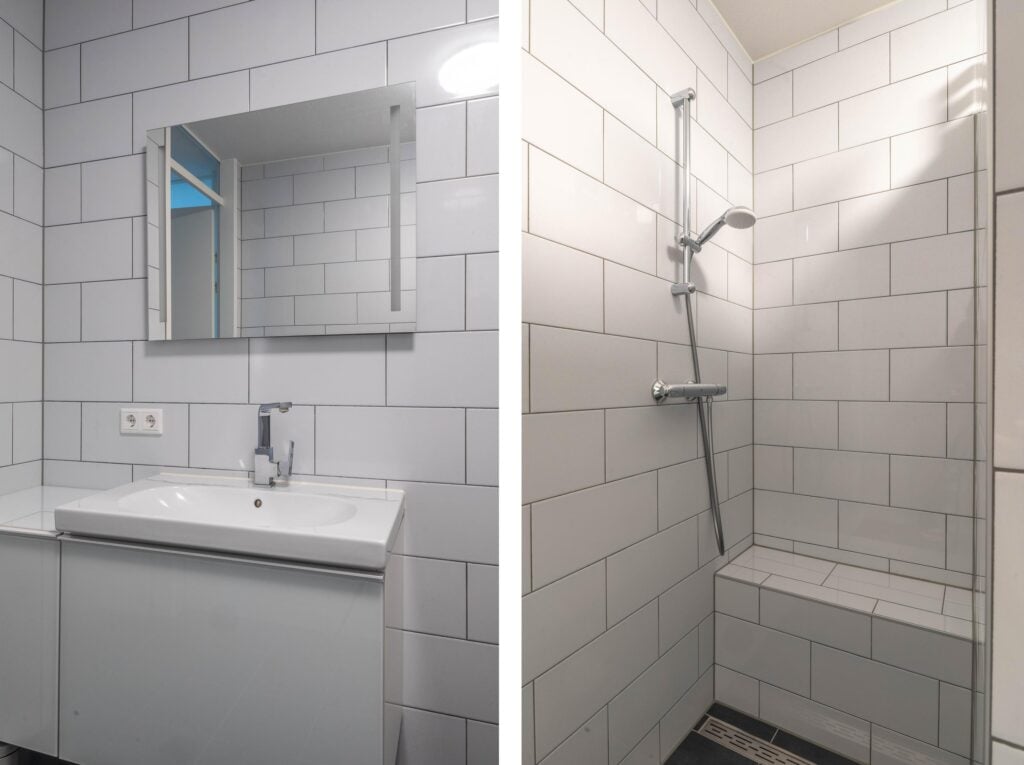Er zijn twee volwaardige slaapkamers: een royale hoofdslaapkamer en een tweede kamer die ideaal is als logeer-, werk- of kinderkamer. De moderne badkamer is voorzien van een inloopdouche en wastafelmeubel; het separate toilet en de interne berging met aansluitingen voor wasapparatuur maken het geheel compleet.