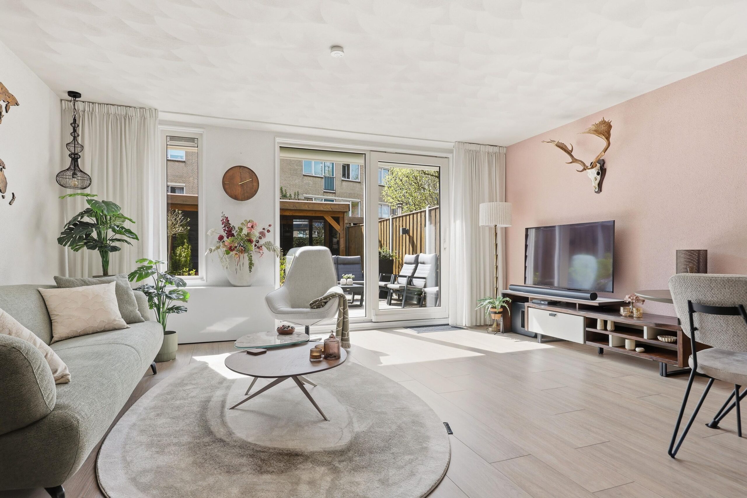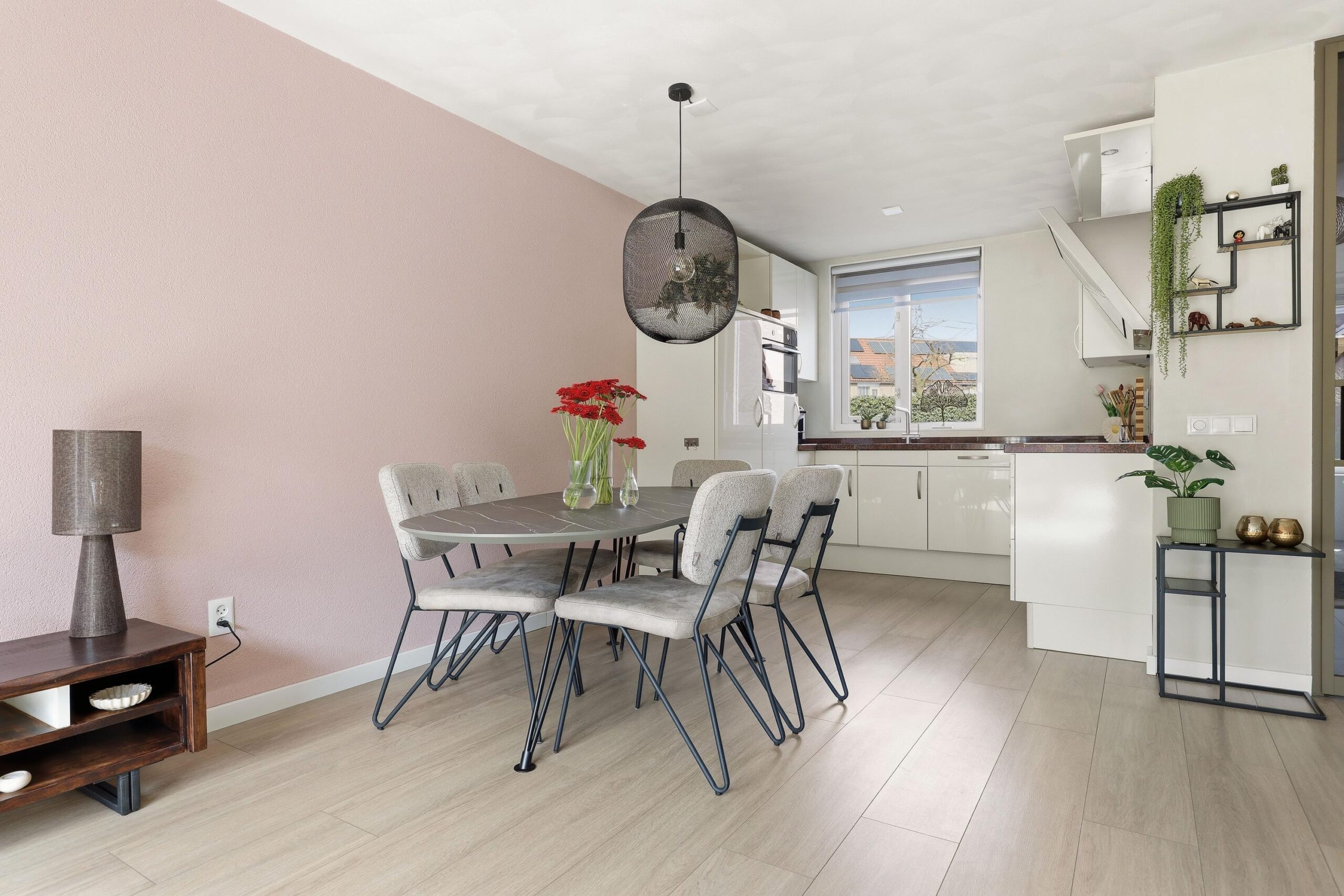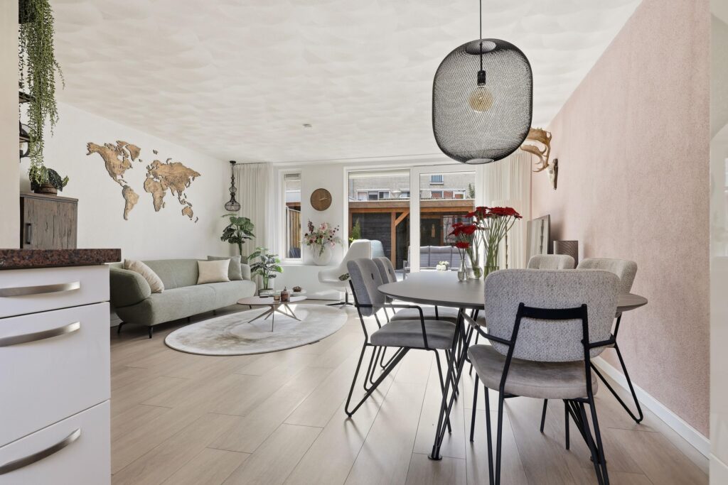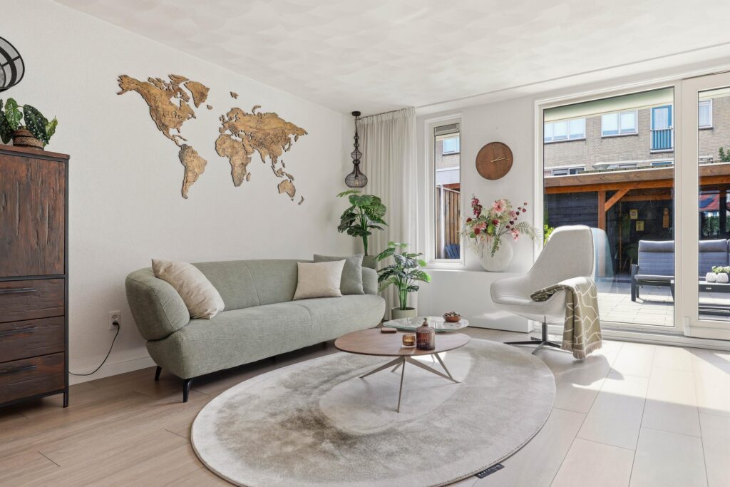 Bij binnenkomst stap je de lichte woonkamer binnen. Dankzij de grote raampartijen en de kunststof schuifpui aan de achterzijde geniet je hier van veel natuurlijk daglicht en een fijne verbinding met buiten. Het gestuukte plafond en de nette laminaatvloer geven de ruimte een eigentijdse en verzorgde uitstraling. Een plek waar je je direct thuis voelt.