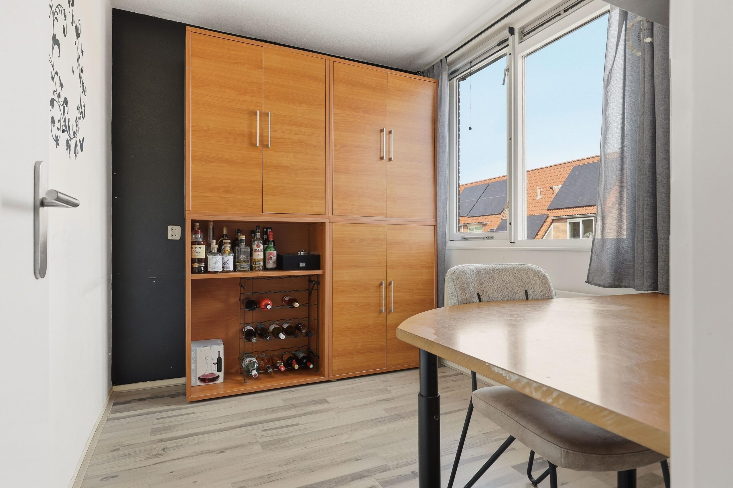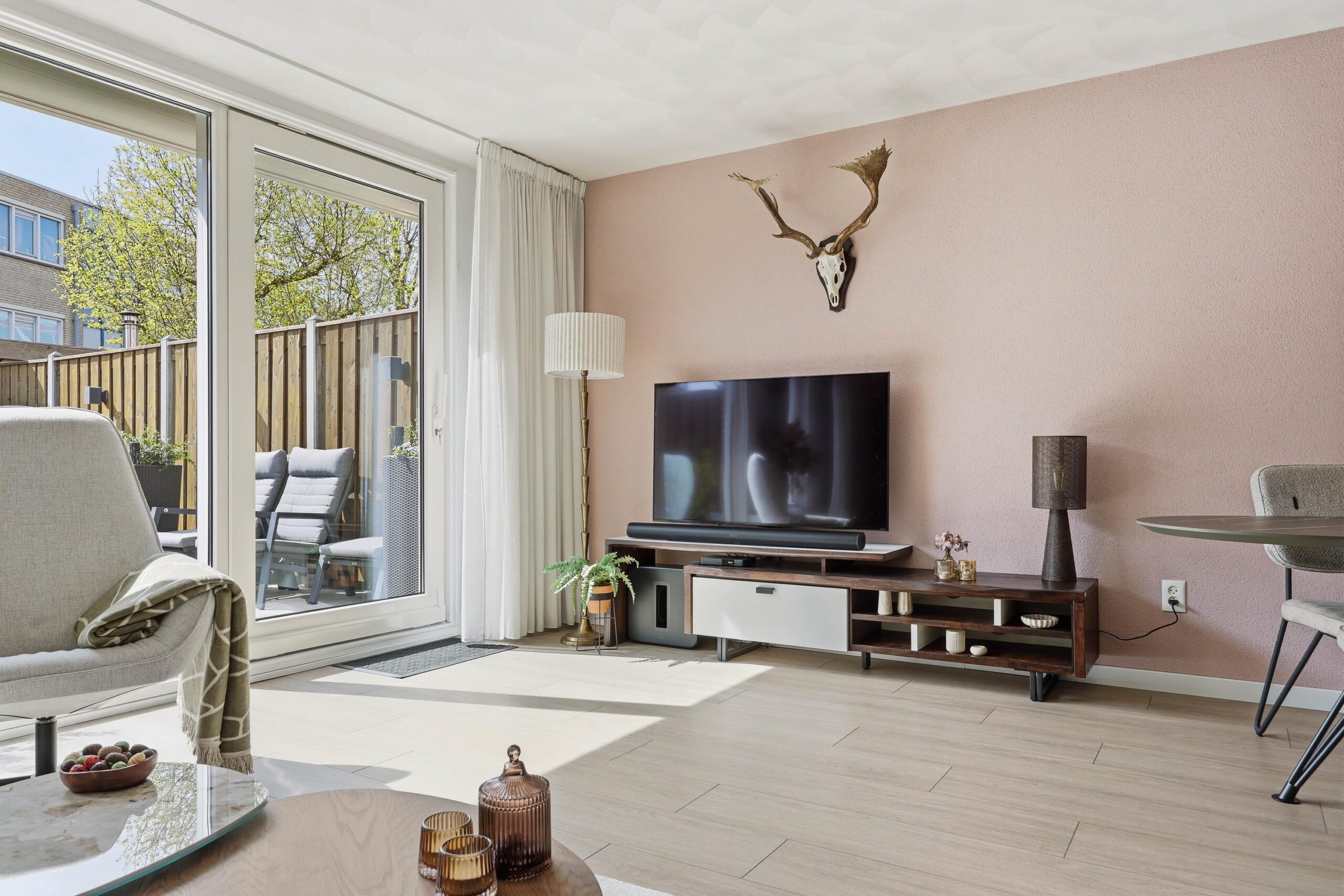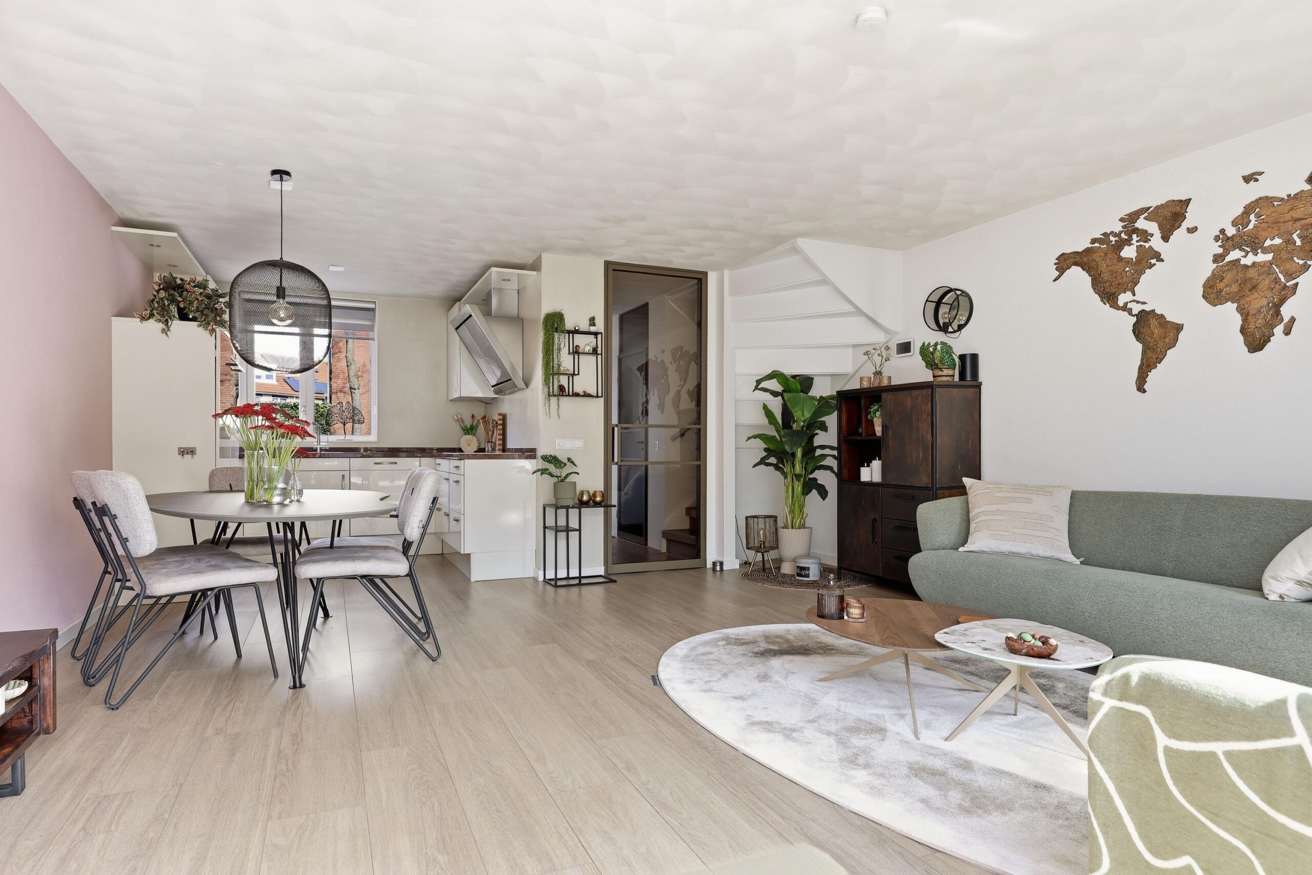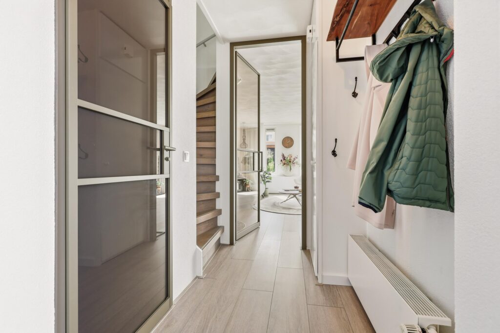 Bij binnenkomst stap je de lichte woonkamer binnen. Dankzij de grote raampartijen en de kunststof schuifpui aan de achterzijde geniet je hier van veel natuurlijk daglicht en een fijne verbinding met buiten. Het gestuukte plafond en de nette laminaatvloer geven de ruimte een eigentijdse en verzorgde uitstraling. Een plek waar je je direct thuis voelt.